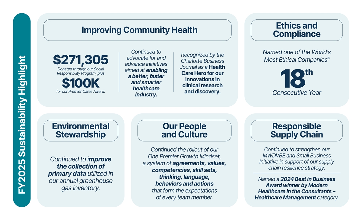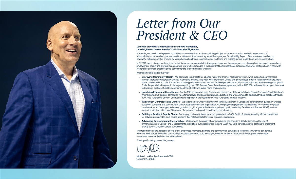 Letter from Our President & CEO On behalf of Premier’s employees and our Board of Directors, I am delighted to present Premier’s 2025 Sustainability Report. At Premier, our mission to improve the health of communities is more than a guiding principle — it’s a call to action rooted in a deep sense of responsibility to our members, partners and the millions of Americans they serve. Each year, our Sustainability Report offers a moment to reflect on how we’re delivering on that promise by strengthening healthcare, supporting our workforce and building a more resilient and secure supply chain. In FY2025, we continued to strengthen the link between our sustainability strategy and long-term business success, shaping how we serve our members, empower our people and steward our resources. Our work is grounded in the belief that better healthcare outcomes and lower costs go hand in hand with responsible business practices and a commitment to the communities we serve. We made notable strides this year: • Improving Community Health – We continued to advocate for a better, faster and smarter healthcare system, while supporting our members through strategic collaboratives and real-world data insights. This year, we launched our Clinical and Social Needs Index to help healthcare providers better understand the social risk factors impacting patient outcomes. We also fostered positive community relationships and team-building through the Social Responsibility Program, including recognizing the 2025 Premier Cares Award winner, greeNest, with a $100,000 cash award to support their work to transform the lives of children and families through safe and stable home environments. ® ® • Upholding Ethics and Compliance – For the 18th consecutive year, Premier was named one of the World’s Most Ethical Companies by Ethisphere . We maintained 100 percent completion rates for employee and board compliance education, and we continued to lead industry best practices through our Group Purchasing Code of Conduct and participation in the Healthcare Group Purchasing Industry Initiative. • Investing in Our People and Culture – We expanded our One Premier Growth Mindset, a system of values and behaviors that guide how we lead ourselves, our teams and our culture to unlock potential across our organization. Our employee engagement score reached 77 — above the global benchmark — and we supported career growth through programs like Leadership Launchpad, Leadership Excellence at Premier (LEAP), and our mentoring initiative, which saw 96 percent of mentees report growth in skills and competencies. • Building a Resilient Supply Chain – Our supply chain consultants were recognized with a 2024 Best in Business Award by Modern Healthcare for delivering sustainable, cost-saving solutions that help hospitals thrive in a dynamic environment. • Advancing Environmental Stewardship – We improved the quality of our greenhouse gas emissions data by increasing the use of ® primary data in our Scope 1 and 2 assessments. In addition, our headquarters remains LEED -CS Gold certified, and we continue to implement energy-saving practices across our facilities. This report reflects the collective efforts of our employees, members, partners and communities, serving as a testament to what we can achieve when we work across industries, communities and perspectives to build a stronger, healthier America. I’m proud of the progress we’ve made — and even more excited about what lies ahead. Thank you for being part of this journey. Michael J. Alkire, President and CEO October 20, 2025