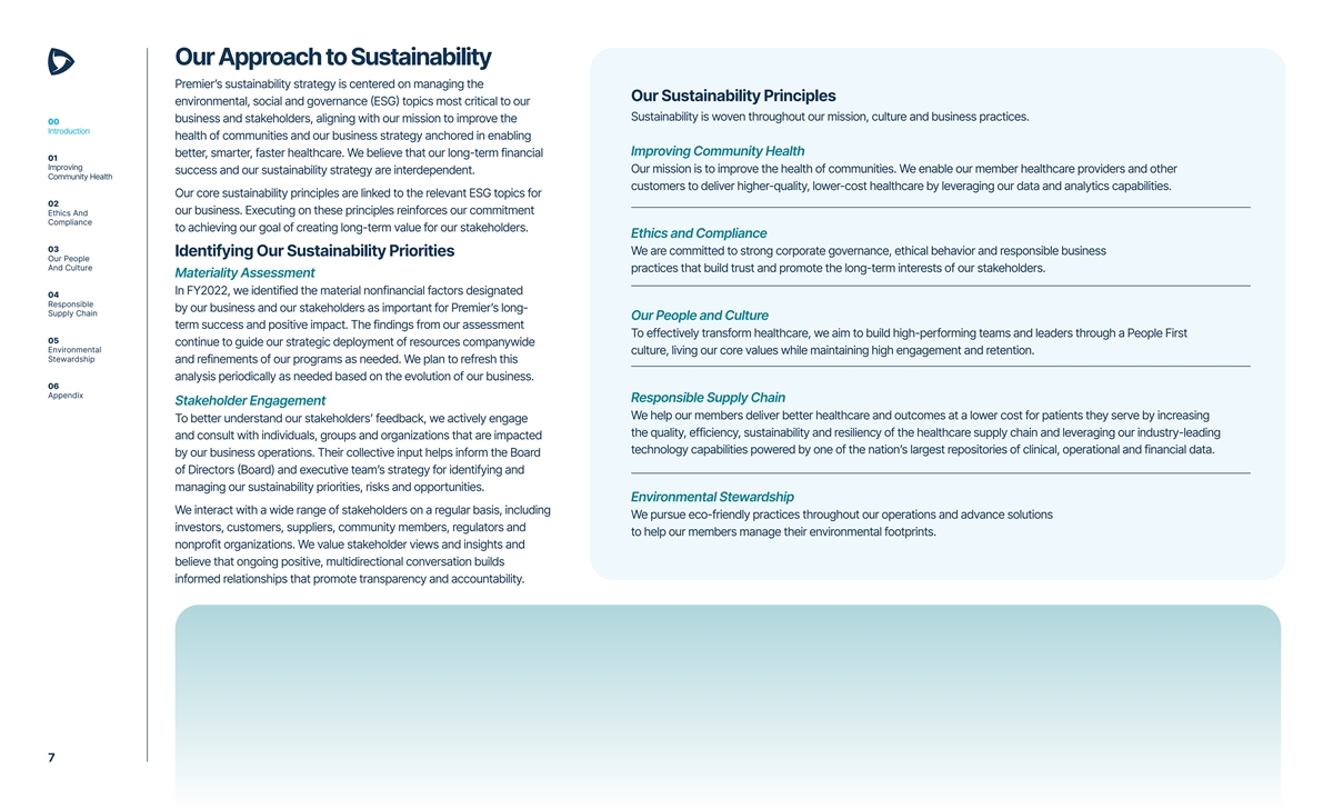 Our Approach to Sustainability Premier’s sustainability strategy is centered on managing the Our Sustainability Principles environmental, social and governance (ESG) topics most critical to our Sustainability is woven throughout our mission, culture and business practices. business and stakeholders, aligning with our mission to improve the 00 Introduction health of communities and our business strategy anchored in enabling Improving Community Health better, smarter, faster healthcare. We believe that our long-term financial 01 Improving Our mission is to improve the health of communities. We enable our member healthcare providers and other success and our sustainability strategy are interdependent. Community Health customers to deliver higher-quality, lower-cost healthcare by leveraging our data and analytics capabilities. Our core sustainability principles are linked to the relevant ESG topics for 02 our business. Executing on these principles reinforces our commitment Ethics And Compliance to achieving our goal of creating long-term value for our stakeholders. Ethics and Compliance 03 We are committed to strong corporate governance, ethical behavior and responsible business Identifying Our Sustainability Priorities Our People And Culture practices that build trust and promote the long-term interests of our stakeholders. Materiality Assessment In FY2022, we identified the material nonfinancial factors designated 04 Responsible by our business and our stakeholders as important for Premier’s long- Supply Chain Our People and Culture term success and positive impact. The findings from our assessment To effectively transform healthcare, we aim to build high-performing teams and leaders through a People First 05 continue to guide our strategic deployment of resources companywide Environmental culture, living our core values while maintaining high engagement and retention. Stewardship and refinements of our programs as needed. We plan to refresh this analysis periodically as needed based on the evolution of our business. 06 Appendix Responsible Supply Chain Stakeholder Engagement We help our members deliver better healthcare and outcomes at a lower cost for patients they serve by increasing To better understand our stakeholders’ feedback, we actively engage the quality, efficiency, sustainability and resiliency of the healthcare supply chain and leveraging our industry-leading and consult with individuals, groups and organizations that are impacted technology capabilities powered by one of the nation’s largest repositories of clinical, operational and financial data. by our business operations. Their collective input helps inform the Board of Directors (Board) and executive team’s strategy for identifying and managing our sustainability priorities, risks and opportunities. Environmental Stewardship We interact with a wide range of stakeholders on a regular basis, including We pursue eco-friendly practices throughout our operations and advance solutions investors, customers, suppliers, community members, regulators and to help our members manage their environmental footprints. nonprofit organizations. We value stakeholder views and insights and believe that ongoing positive, multidirectional conversation builds informed relationships that promote transparency and accountability. 7