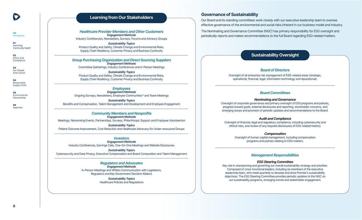 Governance of Sustainability Learning from Our Stakeholders Our Board and its standing committees work closely with our executive leadership team to oversee effective governance of the environmental and social risks inherent in our business model and industry. The Nominating and Governance Committee (NGC) has primary responsibility for ESG oversight and Healthcare Provider Members and Other Customers 00 Introduction Engagement Methods periodically reports and makes recommendations to the full Board regarding ESG-related matters. Industry Conferences, Newsletters, Surveys, Forums and Advisory Groups 01 Sustainability Topics Improving Product Quality and Safety, Climate Change and Environmental Risks, Community Health Supply Chain Resiliency, Customer Privacy and Business Continuity 02 Sustainability Oversight Ethics And Compliance Group Purchasing Organization and Direct Sourcing Suppliers Engagement Methods Committee Gatherings, Industry Conferences and In-Person Meetings 03 Our People Board of Directors Sustainability Topics And Culture Oversight of all enterprise risk management of ESG-related areas (strategic, Product Quality and Safety, Climate Change and Environmental Risks, operational, financial, legal, information technology and reputational). Supply Chain Resiliency, Customer Privacy and Business Continuity 04 Responsible Supply Chain Employees Engagement Methods 05 Board Committees 13 Environmental Ongoing Surveys, Newsletters, Employee Communities and Team Meetings Stewardship Nominating and Governance Sustainability Topics Oversight of corporate governance and primary oversight of ESG programs and policies, Benefits and Compensation, Talent Management and Development and Employee Engagement 06 progress toward goals, external disclosures and reporting, stockholder concerns, and Appendix emerging issues and provision of periodic updates and recommendations to the Board. Community Members and Nonprofits Engagement Methods Audit and Compliance Meetings, Networking Events, Partnerships, Surveys, Philanthropic Support and Employee Volunteerism Oversight of financial, legal and regulatory compliance, including cybersecurity and Sustainability Topics ethical risks, and review of any required disclosures of ESG-related metrics. Patient Outcome Improvement, Cost Reduction and Healthcare Advocacy for Under-resourced Groups Compensation Oversight of human capital management, including compensation Investors programs and policies relating to ESG matters. Engagement Methods Industry Conferences, Earnings Calls, One-On-One Meetings and Website Disclosures Sustainability Topics Cybersecurity and Data Privacy, Executive Compensation and Board Composition and Talent Management Management Responsibilities ESG Steering Committee Regulators and Advocates Key role in championing and governing our overall sustainability strategy and priorities. Engagement Methods Composed of cross-functional leaders, including six members of the executive In-Person Meetings and Written Communication with Legislators, leadership team, who meet quarterly to develop and drive Premier’s sustainability Regulators and Key Government Decision-Makers objectives. The ESG Steering Committee provides periodic updates to the NGC on Sustainability Topics our sustainability programs, emerging trends and stakeholder engagement. Healthcare Policies and Regulations 8