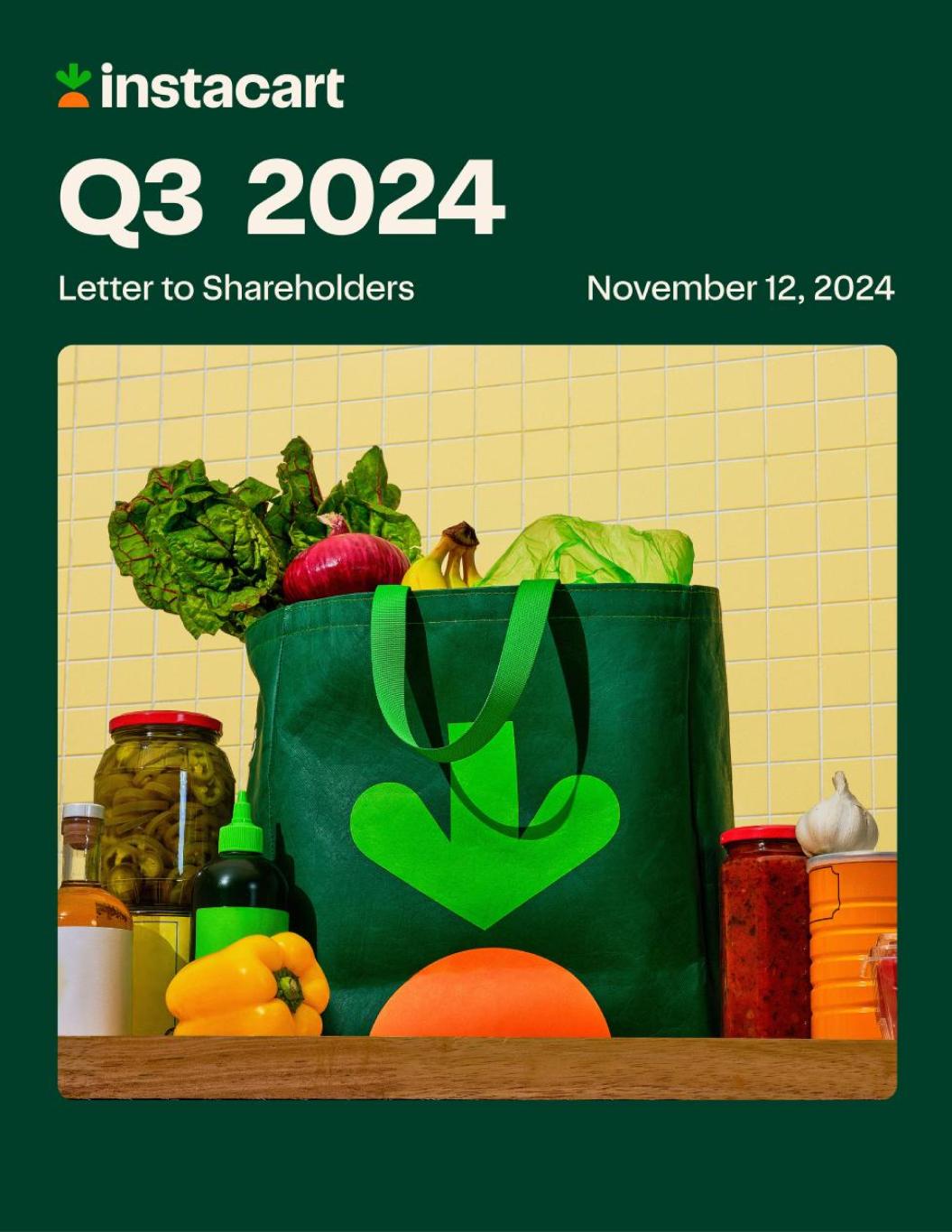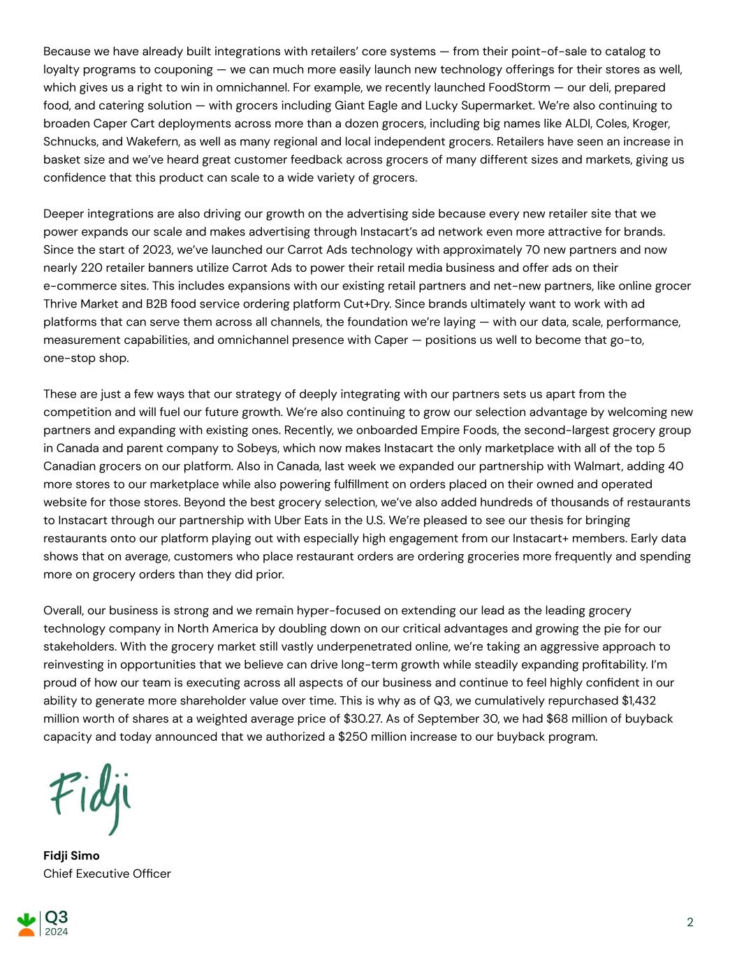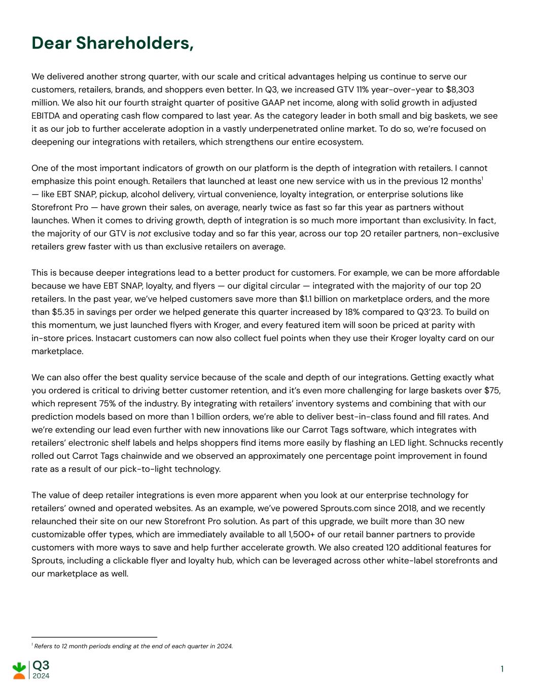 Dear Shareholders, We delivered another strong quarter, with our scale and critical advantages helping us continue to serve our customers, retailers, brands, and shoppers even better. In Q3, we increased GTV 11% year-over-year to $8,303 million. We also hit our fourth straight quarter of positive GAAP net income, along with solid growth in adjusted EBITDA and operating cash flow compared to last year. As the category leader in both small and big baskets, we see it as our job to further accelerate adoption in a vastly underpenetrated online market. To do so, we’re focused on deepening our integrations with retailers, which strengthens our entire ecosystem. One of the most important indicators of growth on our platform is the depth of integration with retailers. I cannot emphasize this point enough. Retailers that launched at least one new service with us in the previous 12 months1 — like EBT SNAP, pickup, alcohol delivery, virtual convenience, loyalty integration, or enterprise solutions like Storefront Pro — have grown their sales, on average, nearly twice as fast so far this year as partners without launches. When it comes to driving growth, depth of integration is so much more important than exclusivity. In fact, the majority of our GTV is not exclusive today and so far this year, across our top 20 retailer partners, non-exclusive retailers grew faster with us than exclusive retailers on average. This is because deeper integrations lead to a better product for customers. For example, we can be more affordable because we have EBT SNAP, loyalty, and flyers — our digital circular — integrated with the majority of our top 20 retailers. In the past year, we’ve helped customers save more than $1.1 billion on marketplace orders, and the more than $5.35 in savings per order we helped generate this quarter increased by 18% compared to Q3’23. To build on this momentum, we just launched flyers with Kroger, and every featured item will soon be priced at parity with in-store prices. Instacart customers can now also collect fuel points when they use their Kroger loyalty card on our marketplace. We can also offer the best quality service because of the scale and depth of our integrations. Getting exactly what you ordered is critical to driving better customer retention, and it’s even more challenging for large baskets over $75, which represent 75% of the industry. By integrating with retailers’ inventory systems and combining that with our prediction models based on more than 1 billion orders, we’re able to deliver best-in-class found and fill rates. And we’re extending our lead even further with new innovations like our Carrot Tags software, which integrates with retailers’ electronic shelf labels and helps shoppers find items more easily by flashing an LED light. Schnucks recently rolled out Carrot Tags chainwide and we observed an approximately one percentage point improvement in found rate as a result of our pick-to-light technology. The value of deep retailer integrations is even more apparent when you look at our enterprise technology for retailers’ owned and operated websites. As an example, we’ve powered Sprouts.com since 2018, and we recently relaunched their site on our new Storefront Pro solution. As part of this upgrade, we built more than 30 new customizable offer types, which are immediately available to all 1,500+ of our retail banner partners to provide customers with more ways to save and help further accelerate growth. We also created 120 additional features for Sprouts, including a clickable flyer and loyalty hub, which can be leveraged across other white-label storefronts and our marketplace as well. 1 Refers to 12 month periods ending at the end of each quarter in 2024. 1