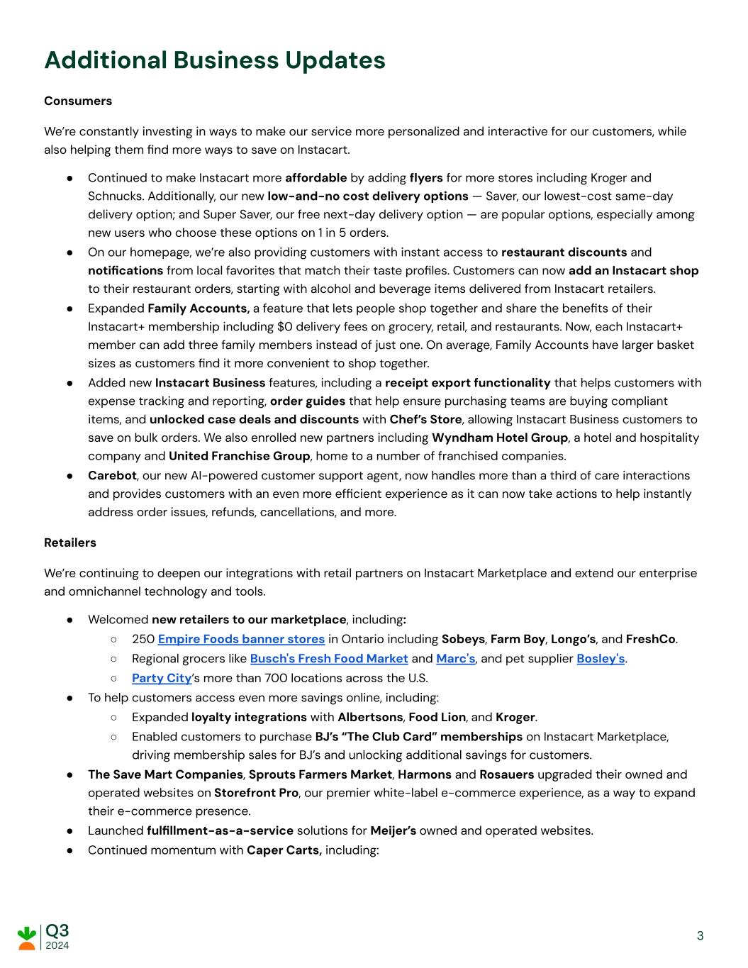 Additional Business Updates Consumers We’re constantly investing in ways to make our service more personalized and interactive for our customers, while also helping them find more ways to save on Instacart. ● Continued to make Instacart more affordable by adding flyers for more stores including Kroger and Schnucks. Additionally, our new low-and-no cost delivery options — Saver, our lowest-cost same-day delivery option; and Super Saver, our free next-day delivery option — are popular options, especially among new users who choose these options on 1 in 5 orders. ● On our homepage, we’re also providing customers with instant access to restaurant discounts and notifications from local favorites that match their taste profiles. Customers can now add an Instacart shop to their restaurant orders, starting with alcohol and beverage items delivered from Instacart retailers. ● Expanded Family Accounts, a feature that lets people shop together and share the benefits of their Instacart+ membership including $0 delivery fees on grocery, retail, and restaurants. Now, each Instacart+ member can add three family members instead of just one. On average, Family Accounts have larger basket sizes as customers find it more convenient to shop together. ● Added new Instacart Business features, including a receipt export functionality that helps customers with expense tracking and reporting, order guides that help ensure purchasing teams are buying compliant items, and unlocked case deals and discounts with Chef’s Store, allowing Instacart Business customers to save on bulk orders. We also enrolled new partners includingWyndham Hotel Group, a hotel and hospitality company and United Franchise Group, home to a number of franchised companies. ● Carebot, our new AI-powered customer support agent, now handles more than a third of care interactions and provides customers with an even more efficient experience as it can now take actions to help instantly address order issues, refunds, cancellations, and more. Retailers We’re continuing to deepen our integrations with retail partners on Instacart Marketplace and extend our enterprise and omnichannel technology and tools. ● Welcomed new retailers to our marketplace, including: ○ 250 Empire Foods banner stores in Ontario including Sobeys, Farm Boy, Longo’s, and FreshCo. ○ Regional grocers like Busch's Fresh Food Market andMarc's, and pet supplier Bosley's. ○ Party City’s more than 700 locations across the U.S. ● To help customers access even more savings online, including: ○ Expanded loyalty integrations with Albertsons, Food Lion, and Kroger. ○ Enabled customers to purchase BJ’s “The Club Card” memberships on Instacart Marketplace, driving membership sales for BJ’s and unlocking additional savings for customers. ● The Save Mart Companies, Sprouts Farmers Market, Harmons and Rosauers upgraded their owned and operated websites on Storefront Pro, our premier white-label e-commerce experience, as a way to expand their e-commerce presence. ● Launched fulfillment-as-a-service solutions forMeijer’s owned and operated websites. ● Continued momentum with Caper Carts, including: 3