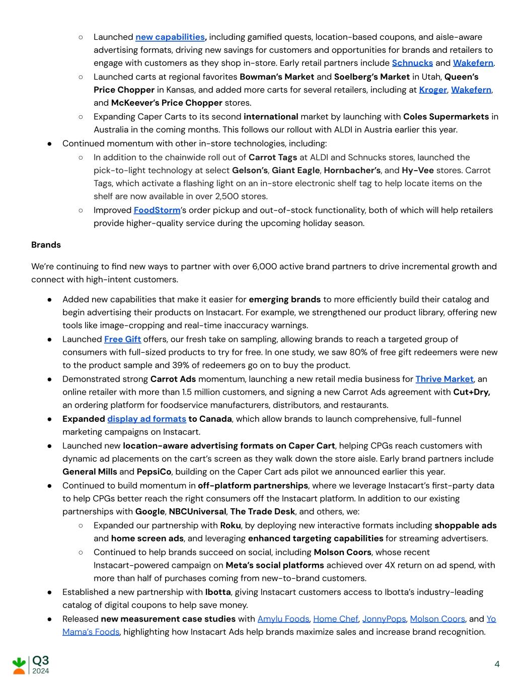 ○ Launched new capabilities, including gamified quests, location-based coupons, and aisle-aware advertising formats, driving new savings for customers and opportunities for brands and retailers to engage with customers as they shop in-store. Early retail partners include Schnucks andWakefern. ○ Launched carts at regional favorites Bowman’s Market and Soelberg’s Market in Utah, Queen’s Price Chopper in Kansas, and added more carts for several retailers, including at Kroger,Wakefern, andMcKeever’s Price Chopper stores. ○ Expanding Caper Carts to its second internationalmarket by launching with Coles Supermarkets in Australia in the coming months. This follows our rollout with ALDI in Austria earlier this year. ● Continued momentum with other in-store technologies, including: ○ In addition to the chainwide roll out of Carrot Tags at ALDI and Schnucks stores, launched the pick-to-light technology at select Gelson’s, Giant Eagle, Hornbacher’s, and Hy-Vee stores. Carrot Tags, which activate a flashing light on an in-store electronic shelf tag to help locate items on the shelf are now available in over 2,500 stores. ○ Improved FoodStorm’s order pickup and out-of-stock functionality, both of which will help retailers provide higher-quality service during the upcoming holiday season. Brands We’re continuing to find new ways to partner with over 6,000 active brand partners to drive incremental growth and connect with high-intent customers. ● Added new capabilities that make it easier for emerging brands to more efficiently build their catalog and begin advertising their products on Instacart. For example, we strengthened our product library, offering new tools like image-cropping and real-time inaccuracy warnings. ● Launched Free Gift offers, our fresh take on sampling, allowing brands to reach a targeted group of consumers with full-sized products to try for free. In one study, we saw 80% of free gift redeemers were new to the product sample and 39% of redeemers go on to buy the product. ● Demonstrated strong Carrot Adsmomentum, launching a new retail media business for Thrive Market, an online retailer with more than 1.5 million customers, and signing a new Carrot Ads agreement with Cut+Dry, an ordering platform for foodservice manufacturers, distributors, and restaurants. ● Expanded display ad formats to Canada, which allow brands to launch comprehensive, full-funnel marketing campaigns on Instacart. ● Launched new location-aware advertising formats on Caper Cart, helping CPGs reach customers with dynamic ad placements on the cart’s screen as they walk down the store aisle. Early brand partners include General Mills and PepsiCo, building on the Caper Cart ads pilot we announced earlier this year. ● Continued to build momentum in off-platform partnerships, where we leverage Instacart’s first-party data to help CPGs better reach the right consumers off the Instacart platform. In addition to our existing partnerships with Google, NBCUniversal, The Trade Desk, and others, we: ○ Expanded our partnership with Roku, by deploying new interactive formats including shoppable ads and home screen ads, and leveraging enhanced targeting capabilities for streaming advertisers. ○ Continued to help brands succeed on social, includingMolson Coors, whose recent Instacart-powered campaign onMeta’s social platforms achieved over 4X return on ad spend, with more than half of purchases coming from new-to-brand customers. ● Established a new partnership with Ibotta, giving Instacart customers access to Ibotta’s industry-leading catalog of digital coupons to help save money. ● Released newmeasurement case studies with Amylu Foods, Home Chef, JonnyPops, Molson Coors, and Yo Mama’s Foods, highlighting how Instacart Ads help brands maximize sales and increase brand recognition. 4