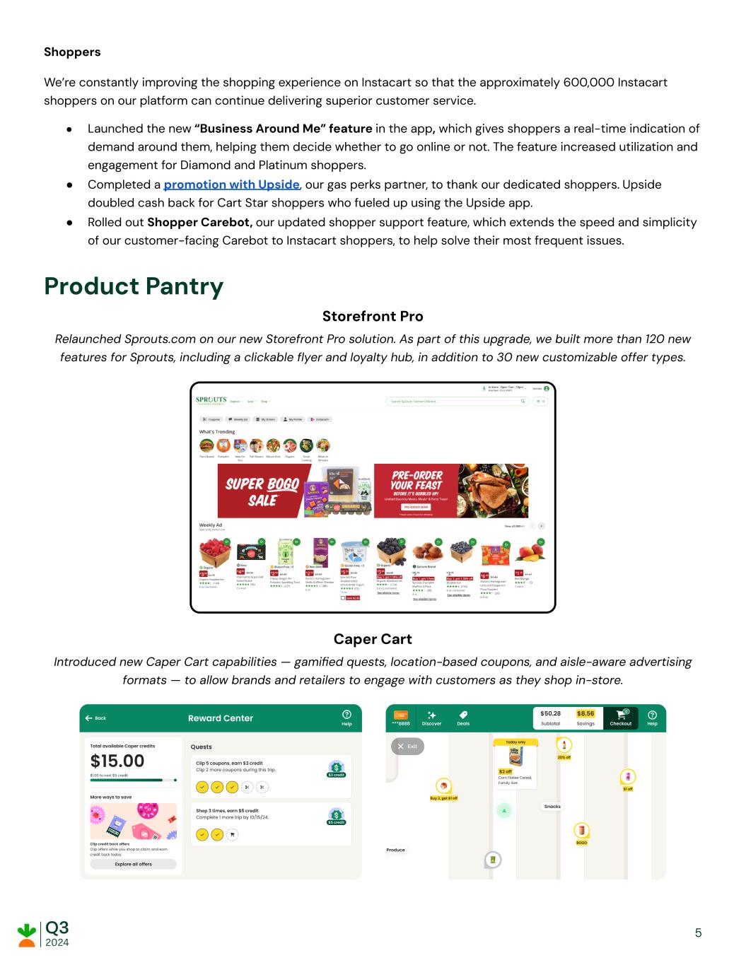 Shoppers We’re constantly improving the shopping experience on Instacart so that the approximately 600,000 Instacart shoppers on our platform can continue delivering superior customer service. ● Launched the new “Business Around Me” feature in the app, which gives shoppers a real-time indication of demand around them, helping them decide whether to go online or not. The feature increased utilization and engagement for Diamond and Platinum shoppers. ● Completed a promotion with Upside, our gas perks partner, to thank our dedicated shoppers. Upside doubled cash back for Cart Star shoppers who fueled up using the Upside app. ● Rolled out Shopper Carebot, our updated shopper support feature, which extends the speed and simplicity of our customer-facing Carebot to Instacart shoppers, to help solve their most frequent issues. Product Pantry Storefront Pro Relaunched Sprouts.com on our new Storefront Pro solution. As part of this upgrade, we built more than 120 new features for Sprouts, including a clickable flyer and loyalty hub, in addition to 30 new customizable offer types. Caper Cart Introduced new Caper Cart capabilities — gamified quests, location-based coupons, and aisle-aware advertising formats — to allow brands and retailers to engage with customers as they shop in-store. 5