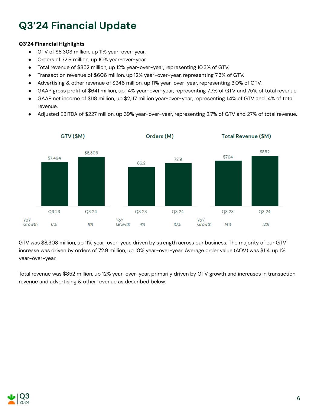 Q3’24 Financial Update Q3’24 Financial Highlights ● GTV of $8,303 million, up 11% year-over-year. ● Orders of 72.9 million, up 10% year-over-year. ● Total revenue of $852 million, up 12% year-over-year, representing 10.3% of GTV. ● Transaction revenue of $606 million, up 12% year-over-year, representing 7.3% of GTV. ● Advertising & other revenue of $246 million, up 11% year-over-year, representing 3.0% of GTV. ● GAAP gross profit of $641 million, up 14% year-over-year, representing 7.7% of GTV and 75% of total revenue. ● GAAP net income of $118 million, up $2,117 million year-over-year, representing 1.4% of GTV and 14% of total revenue. ● Adjusted EBITDA of $227 million, up 39% year-over-year, representing 2.7% of GTV and 27% of total revenue. GTV was $8,303 million, up 11% year-over-year, driven by strength across our business. The majority of our GTV increase was driven by orders of 72.9 million, up 10% year-over-year. Average order value (AOV) was $114, up 1% year-over-year. Total revenue was $852 million, up 12% year-over-year, primarily driven by GTV growth and increases in transaction revenue and advertising & other revenue as described below. 6