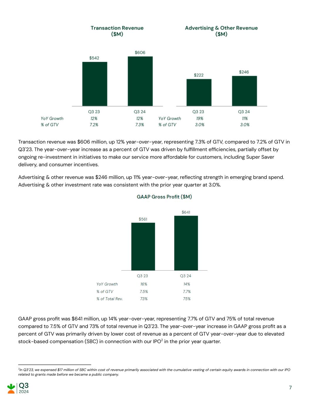 Transaction revenue was $606 million, up 12% year-over-year, representing 7.3% of GTV, compared to 7.2% of GTV in Q3'23. The year-over-year increase as a percent of GTV was driven by fulfillment efficiencies, partially offset by ongoing re-investment in initiatives to make our service more affordable for customers, including Super Saver delivery, and consumer incentives. Advertising & other revenue was $246 million, up 11% year-over-year, reflecting strength in emerging brand spend. Advertising & other investment rate was consistent with the prior year quarter at 3.0%. GAAP gross profit was $641 million, up 14% year-over-year, representing 7.7% of GTV and 75% of total revenue compared to 7.5% of GTV and 73% of total revenue in Q3'23. The year-over-year increase in GAAP gross profit as a percent of GTV was primarily driven by lower cost of revenue as a percent of GTV year-over-year due to elevated stock-based compensation (SBC) in connection with our IPO2 in the prior year quarter. 2In Q3’23, we expensed $17 million of SBC within cost of revenue primarily associated with the cumulative vesting of certain equity awards in connection with our IPO related to grants made before we became a public company. 7