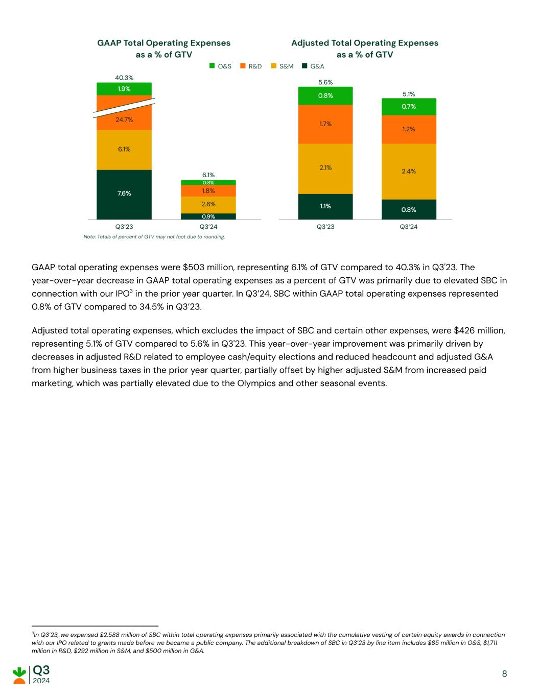 GAAP total operating expenses were $503 million, representing 6.1% of GTV compared to 40.3% in Q3'23. The year-over-year decrease in GAAP total operating expenses as a percent of GTV was primarily due to elevated SBC in connection with our IPO3 in the prior year quarter. In Q3’24, SBC within GAAP total operating expenses represented 0.8% of GTV compared to 34.5% in Q3’23. Adjusted total operating expenses, which excludes the impact of SBC and certain other expenses, were $426 million, representing 5.1% of GTV compared to 5.6% in Q3'23. This year-over-year improvement was primarily driven by decreases in adjusted R&D related to employee cash/equity elections and reduced headcount and adjusted G&A from higher business taxes in the prior year quarter, partially offset by higher adjusted S&M from increased paid marketing, which was partially elevated due to the Olympics and other seasonal events. 3In Q3’23, we expensed $2,588 million of SBC within total operating expenses primarily associated with the cumulative vesting of certain equity awards in connection with our IPO related to grants made before we became a public company. The additional breakdown of SBC in Q3’23 by line item includes $85 million in O&S, $1,711 million in R&D, $292 million in S&M, and $500 million in G&A. 8