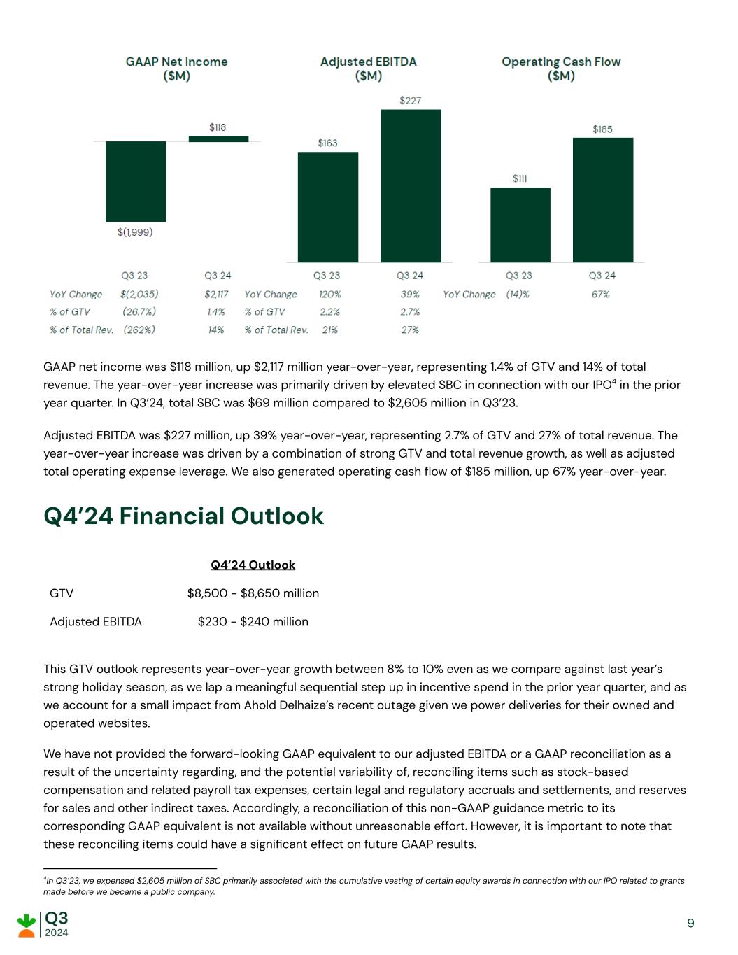 GAAP net income was $118 million, up $2,117 million year-over-year, representing 1.4% of GTV and 14% of total revenue. The year-over-year increase was primarily driven by elevated SBC in connection with our IPO4 in the prior year quarter. In Q3’24, total SBC was $69 million compared to $2,605 million in Q3’23. Adjusted EBITDA was $227 million, up 39% year-over-year, representing 2.7% of GTV and 27% of total revenue. The year-over-year increase was driven by a combination of strong GTV and total revenue growth, as well as adjusted total operating expense leverage. We also generated operating cash flow of $185 million, up 67% year-over-year. Q4’24 Financial Outlook Q4’24 Outlook GTV $8,500 - $8,650 million Adjusted EBITDA $230 - $240 million This GTV outlook represents year-over-year growth between 8% to 10% even as we compare against last year’s strong holiday season, as we lap a meaningful sequential step up in incentive spend in the prior year quarter, and as we account for a small impact from Ahold Delhaize’s recent outage given we power deliveries for their owned and operated websites. We have not provided the forward-looking GAAP equivalent to our adjusted EBITDA or a GAAP reconciliation as a result of the uncertainty regarding, and the potential variability of, reconciling items such as stock-based compensation and related payroll tax expenses, certain legal and regulatory accruals and settlements, and reserves for sales and other indirect taxes. Accordingly, a reconciliation of this non-GAAP guidance metric to its corresponding GAAP equivalent is not available without unreasonable effort. However, it is important to note that these reconciling items could have a significant effect on future GAAP results. 4In Q3’23, we expensed $2,605 million of SBC primarily associated with the cumulative vesting of certain equity awards in connection with our IPO related to grants made before we became a public company. 9
