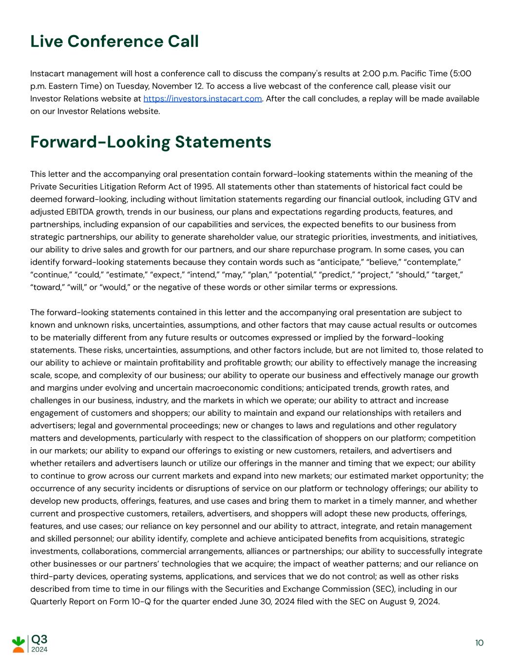 Live Conference Call Instacart management will host a conference call to discuss the company's results at 2:00 p.m. Pacific Time (5:00 p.m. Eastern Time) on Tuesday, November 12. To access a live webcast of the conference call, please visit our Investor Relations website at https://investors.instacart.com. After the call concludes, a replay will be made available on our Investor Relations website. Forward-Looking Statements This letter and the accompanying oral presentation contain forward-looking statements within the meaning of the Private Securities Litigation Reform Act of 1995. All statements other than statements of historical fact could be deemed forward-looking, including without limitation statements regarding our financial outlook, including GTV and adjusted EBITDA growth, trends in our business, our plans and expectations regarding products, features, and partnerships, including expansion of our capabilities and services, the expected benefits to our business from strategic partnerships, our ability to generate shareholder value, our strategic priorities, investments, and initiatives, our ability to drive sales and growth for our partners, and our share repurchase program. In some cases, you can identify forward-looking statements because they contain words such as “anticipate,” “believe,” “contemplate,” “continue,” “could,” “estimate,” “expect,” “intend,” “may,” “plan,” “potential,” “predict,” “project,” “should,” “target,” “toward,” “will,” or “would,” or the negative of these words or other similar terms or expressions. The forward-looking statements contained in this letter and the accompanying oral presentation are subject to known and unknown risks, uncertainties, assumptions, and other factors that may cause actual results or outcomes to be materially different from any future results or outcomes expressed or implied by the forward-looking statements. These risks, uncertainties, assumptions, and other factors include, but are not limited to, those related to our ability to achieve or maintain profitability and profitable growth; our ability to effectively manage the increasing scale, scope, and complexity of our business; our ability to operate our business and effectively manage our growth and margins under evolving and uncertain macroeconomic conditions; anticipated trends, growth rates, and challenges in our business, industry, and the markets in which we operate; our ability to attract and increase engagement of customers and shoppers; our ability to maintain and expand our relationships with retailers and advertisers; legal and governmental proceedings; new or changes to laws and regulations and other regulatory matters and developments, particularly with respect to the classification of shoppers on our platform; competition in our markets; our ability to expand our offerings to existing or new customers, retailers, and advertisers and whether retailers and advertisers launch or utilize our offerings in the manner and timing that we expect; our ability to continue to grow across our current markets and expand into new markets; our estimated market opportunity; the occurrence of any security incidents or disruptions of service on our platform or technology offerings; our ability to develop new products, offerings, features, and use cases and bring them to market in a timely manner, and whether current and prospective customers, retailers, advertisers, and shoppers will adopt these new products, offerings, features, and use cases; our reliance on key personnel and our ability to attract, integrate, and retain management and skilled personnel; our ability identify, complete and achieve anticipated benefits from acquisitions, strategic investments, collaborations, commercial arrangements, alliances or partnerships; our ability to successfully integrate other businesses or our partners’ technologies that we acquire; the impact of weather patterns; and our reliance on third-party devices, operating systems, applications, and services that we do not control; as well as other risks described from time to time in our filings with the Securities and Exchange Commission (SEC), including in our Quarterly Report on Form 10-Q for the quarter ended June 30, 2024 filed with the SEC on August 9, 2024. 10