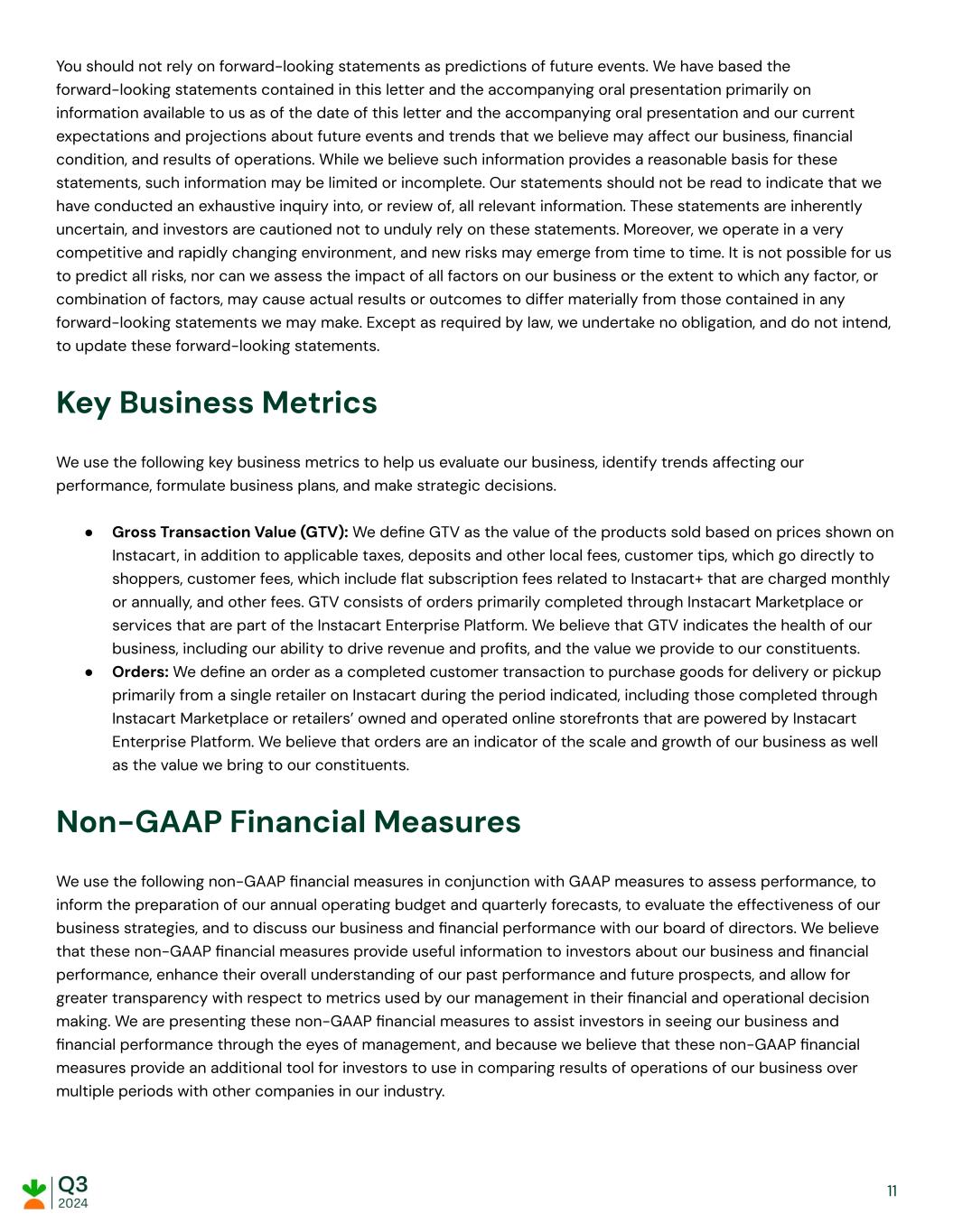 You should not rely on forward-looking statements as predictions of future events. We have based the forward-looking statements contained in this letter and the accompanying oral presentation primarily on information available to us as of the date of this letter and the accompanying oral presentation and our current expectations and projections about future events and trends that we believe may affect our business, financial condition, and results of operations. While we believe such information provides a reasonable basis for these statements, such information may be limited or incomplete. Our statements should not be read to indicate that we have conducted an exhaustive inquiry into, or review of, all relevant information. These statements are inherently uncertain, and investors are cautioned not to unduly rely on these statements. Moreover, we operate in a very competitive and rapidly changing environment, and new risks may emerge from time to time. It is not possible for us to predict all risks, nor can we assess the impact of all factors on our business or the extent to which any factor, or combination of factors, may cause actual results or outcomes to differ materially from those contained in any forward-looking statements we may make. Except as required by law, we undertake no obligation, and do not intend, to update these forward-looking statements. Key Business Metrics We use the following key business metrics to help us evaluate our business, identify trends affecting our performance, formulate business plans, and make strategic decisions. ● Gross Transaction Value (GTV):We define GTV as the value of the products sold based on prices shown on Instacart, in addition to applicable taxes, deposits and other local fees, customer tips, which go directly to shoppers, customer fees, which include flat subscription fees related to Instacart+ that are charged monthly or annually, and other fees. GTV consists of orders primarily completed through Instacart Marketplace or services that are part of the Instacart Enterprise Platform. We believe that GTV indicates the health of our business, including our ability to drive revenue and profits, and the value we provide to our constituents. ● Orders:We define an order as a completed customer transaction to purchase goods for delivery or pickup primarily from a single retailer on Instacart during the period indicated, including those completed through Instacart Marketplace or retailers’ owned and operated online storefronts that are powered by Instacart Enterprise Platform. We believe that orders are an indicator of the scale and growth of our business as well as the value we bring to our constituents. Non-GAAP Financial Measures We use the following non-GAAP financial measures in conjunction with GAAP measures to assess performance, to inform the preparation of our annual operating budget and quarterly forecasts, to evaluate the effectiveness of our business strategies, and to discuss our business and financial performance with our board of directors. We believe that these non-GAAP financial measures provide useful information to investors about our business and financial performance, enhance their overall understanding of our past performance and future prospects, and allow for greater transparency with respect to metrics used by our management in their financial and operational decision making. We are presenting these non-GAAP financial measures to assist investors in seeing our business and financial performance through the eyes of management, and because we believe that these non-GAAP financial measures provide an additional tool for investors to use in comparing results of operations of our business over multiple periods with other companies in our industry. 11