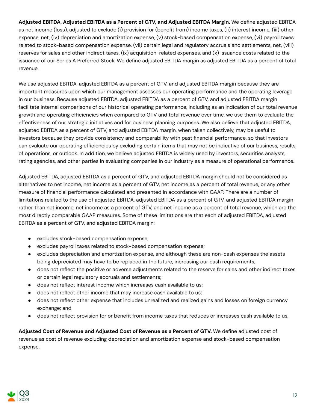 Adjusted EBITDA, Adjusted EBITDA as a Percent of GTV, and Adjusted EBITDA Margin.We define adjusted EBITDA as net income (loss), adjusted to exclude (i) provision for (benefit from) income taxes, (ii) interest income, (iii) other expense, net, (iv) depreciation and amortization expense, (v) stock-based compensation expense, (vi) payroll taxes related to stock-based compensation expense, (vii) certain legal and regulatory accruals and settlements, net, (viii) reserves for sales and other indirect taxes, (ix) acquisition-related expenses, and (x) issuance costs related to the issuance of our Series A Preferred Stock. We define adjusted EBITDA margin as adjusted EBITDA as a percent of total revenue. We use adjusted EBITDA, adjusted EBITDA as a percent of GTV, and adjusted EBITDA margin because they are important measures upon which our management assesses our operating performance and the operating leverage in our business. Because adjusted EBITDA, adjusted EBITDA as a percent of GTV, and adjusted EBITDA margin facilitate internal comparisons of our historical operating performance, including as an indication of our total revenue growth and operating efficiencies when compared to GTV and total revenue over time, we use them to evaluate the effectiveness of our strategic initiatives and for business planning purposes. We also believe that adjusted EBITDA, adjusted EBITDA as a percent of GTV, and adjusted EBITDA margin, when taken collectively, may be useful to investors because they provide consistency and comparability with past financial performance, so that investors can evaluate our operating efficiencies by excluding certain items that may not be indicative of our business, results of operations, or outlook. In addition, we believe adjusted EBITDA is widely used by investors, securities analysts, rating agencies, and other parties in evaluating companies in our industry as a measure of operational performance. Adjusted EBITDA, adjusted EBITDA as a percent of GTV, and adjusted EBITDA margin should not be considered as alternatives to net income, net income as a percent of GTV, net income as a percent of total revenue, or any other measure of financial performance calculated and presented in accordance with GAAP. There are a number of limitations related to the use of adjusted EBITDA, adjusted EBITDA as a percent of GTV, and adjusted EBITDA margin rather than net income, net income as a percent of GTV, and net income as a percent of total revenue, which are the most directly comparable GAAP measures. Some of these limitations are that each of adjusted EBITDA, adjusted EBITDA as a percent of GTV, and adjusted EBITDA margin: ● excludes stock-based compensation expense; ● excludes payroll taxes related to stock-based compensation expense; ● excludes depreciation and amortization expense, and although these are non-cash expenses the assets being depreciated may have to be replaced in the future, increasing our cash requirements; ● does not reflect the positive or adverse adjustments related to the reserve for sales and other indirect taxes or certain legal regulatory accruals and settlements; ● does not reflect interest income which increases cash available to us; ● does not reflect other income that may increase cash available to us; ● does not reflect other expense that includes unrealized and realized gains and losses on foreign currency exchange; and ● does not reflect provision for or benefit from income taxes that reduces or increases cash available to us. Adjusted Cost of Revenue and Adjusted Cost of Revenue as a Percent of GTV.We define adjusted cost of revenue as cost of revenue excluding depreciation and amortization expense and stock-based compensation expense. 12