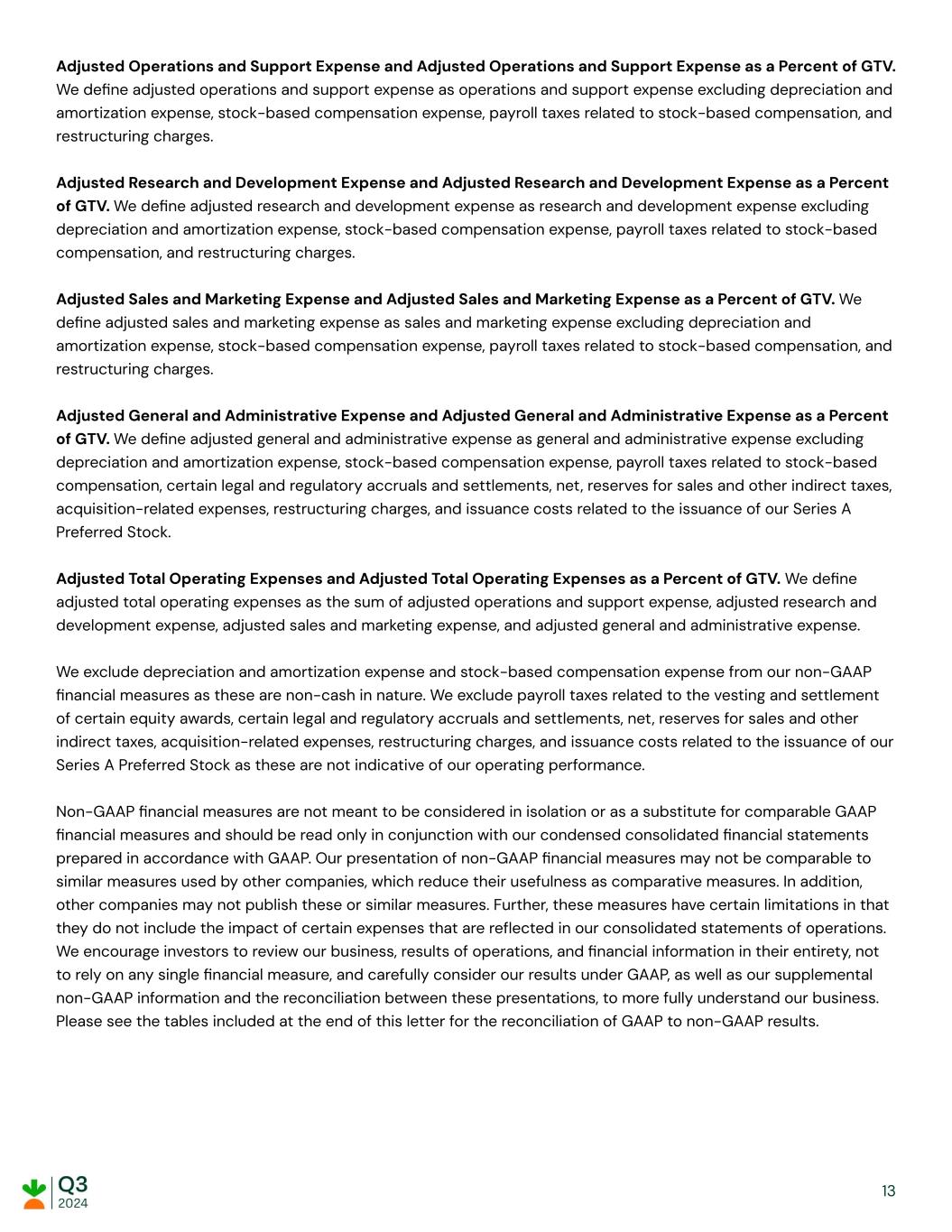 Adjusted Operations and Support Expense and Adjusted Operations and Support Expense as a Percent of GTV. We define adjusted operations and support expense as operations and support expense excluding depreciation and amortization expense, stock-based compensation expense, payroll taxes related to stock-based compensation, and restructuring charges. Adjusted Research and Development Expense and Adjusted Research and Development Expense as a Percent of GTV.We define adjusted research and development expense as research and development expense excluding depreciation and amortization expense, stock-based compensation expense, payroll taxes related to stock-based compensation, and restructuring charges. Adjusted Sales and Marketing Expense and Adjusted Sales and Marketing Expense as a Percent of GTV.We define adjusted sales and marketing expense as sales and marketing expense excluding depreciation and amortization expense, stock-based compensation expense, payroll taxes related to stock-based compensation, and restructuring charges. Adjusted General and Administrative Expense and Adjusted General and Administrative Expense as a Percent of GTV.We define adjusted general and administrative expense as general and administrative expense excluding depreciation and amortization expense, stock-based compensation expense, payroll taxes related to stock-based compensation, certain legal and regulatory accruals and settlements, net, reserves for sales and other indirect taxes, acquisition-related expenses, restructuring charges, and issuance costs related to the issuance of our Series A Preferred Stock. Adjusted Total Operating Expenses and Adjusted Total Operating Expenses as a Percent of GTV.We define adjusted total operating expenses as the sum of adjusted operations and support expense, adjusted research and development expense, adjusted sales and marketing expense, and adjusted general and administrative expense. We exclude depreciation and amortization expense and stock-based compensation expense from our non-GAAP financial measures as these are non-cash in nature. We exclude payroll taxes related to the vesting and settlement of certain equity awards, certain legal and regulatory accruals and settlements, net, reserves for sales and other indirect taxes, acquisition-related expenses, restructuring charges, and issuance costs related to the issuance of our Series A Preferred Stock as these are not indicative of our operating performance. Non-GAAP financial measures are not meant to be considered in isolation or as a substitute for comparable GAAP financial measures and should be read only in conjunction with our condensed consolidated financial statements prepared in accordance with GAAP. Our presentation of non-GAAP financial measures may not be comparable to similar measures used by other companies, which reduce their usefulness as comparative measures. In addition, other companies may not publish these or similar measures. Further, these measures have certain limitations in that they do not include the impact of certain expenses that are reflected in our consolidated statements of operations. We encourage investors to review our business, results of operations, and financial information in their entirety, not to rely on any single financial measure, and carefully consider our results under GAAP, as well as our supplemental non-GAAP information and the reconciliation between these presentations, to more fully understand our business. Please see the tables included at the end of this letter for the reconciliation of GAAP to non-GAAP results. 13