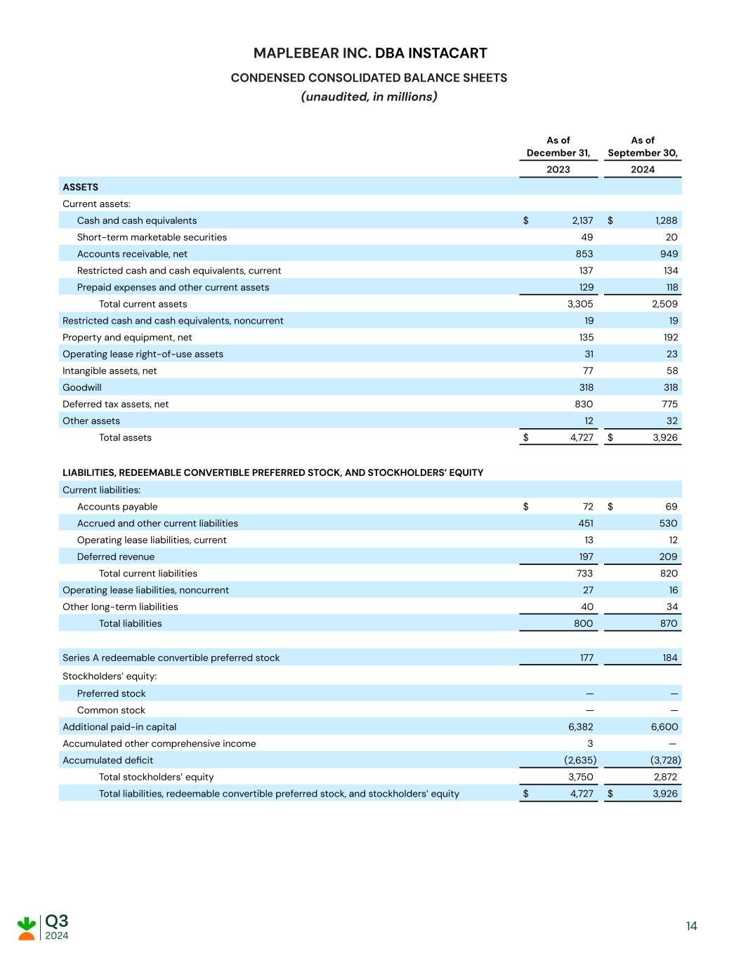 MAPLEBEAR INC. DBA INSTACART CONDENSED CONSOLIDATED BALANCE SHEETS (unaudited, in millions) As of December 31, As of September 30, 2023 2024 ASSETS Current assets: Cash and cash equivalents $ 2,137 $ 1,288 Short-term marketable securities 49 20 Accounts receivable, net 853 949 Restricted cash and cash equivalents, current 137 134 Prepaid expenses and other current assets 129 118 Total current assets 3,305 2,509 Restricted cash and cash equivalents, noncurrent 19 19 Property and equipment, net 135 192 Operating lease right-of-use assets 31 23 Intangible assets, net 77 58 Goodwill 318 318 Deferred tax assets, net 830 775 Other assets 12 32 Total assets $ 4,727 $ 3,926 LIABILITIES, REDEEMABLE CONVERTIBLE PREFERRED STOCK, AND STOCKHOLDERS’ EQUITY Current liabilities: Accounts payable $ 72 $ 69 Accrued and other current liabilities 451 530 Operating lease liabilities, current 13 12 Deferred revenue 197 209 Total current liabilities 733 820 Operating lease liabilities, noncurrent 27 16 Other long-term liabilities 40 34 Total liabilities 800 870 Series A redeemable convertible preferred stock 177 184 Stockholders’ equity: Preferred stock — — Common stock — — Additional paid-in capital 6,382 6,600 Accumulated other comprehensive income 3 — Accumulated deficit (2,635) (3,728) Total stockholders’ equity 3,750 2,872 Total liabilities, redeemable convertible preferred stock, and stockholders’ equity $ 4,727 $ 3,926 14