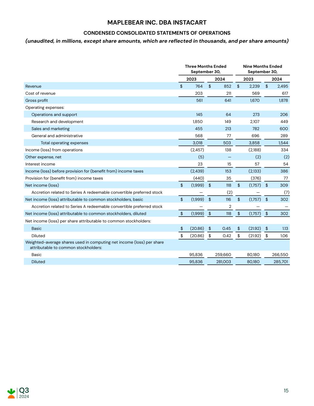 MAPLEBEAR INC. DBA INSTACART CONDENSED CONSOLIDATED STATEMENTS OF OPERATIONS (unaudited, in millions, except share amounts, which are reflected in thousands, and per share amounts) Three Months Ended September 30, Nine Months Ended September 30, 2023 2024 2023 2024 Revenue $ 764 $ 852 $ 2,239 $ 2,495 Cost of revenue 203 211 569 617 Gross profit 561 641 1,670 1,878 Operating expenses: Operations and support 145 64 273 206 Research and development 1,850 149 2,107 449 Sales and marketing 455 213 782 600 General and administrative 568 77 696 289 Total operating expenses 3,018 503 3,858 1,544 Income (loss) from operations (2,457) 138 (2,188) 334 Other expense, net (5) — (2) (2) Interest income 23 15 57 54 Income (loss) before provision for (benefit from) income taxes (2,439) 153 (2,133) 386 Provision for (benefit from) income taxes (440) 35 (376) 77 Net income (loss) $ (1,999) $ 118 $ (1,757) $ 309 Accretion related to Series A redeemable convertible preferred stock — (2) — (7) Net income (loss) attributable to common stockholders, basic $ (1,999) $ 116 $ (1,757) $ 302 Accretion related to Series A redeemable convertible preferred stock — 2 — — Net income (loss) attributable to common stockholders, diluted $ (1,999) $ 118 $ (1,757) $ 302 Net income (loss) per share attributable to common stockholders: Basic $ (20.86) $ 0.45 $ (21.92) $ 1.13 Diluted $ (20.86) $ 0.42 $ (21.92) $ 1.06 Weighted-average shares used in computing net income (loss) per share attributable to common stockholders: Basic 95,836 259,660 80,180 266,550 Diluted 95,836 281,003 80,180 285,701 15