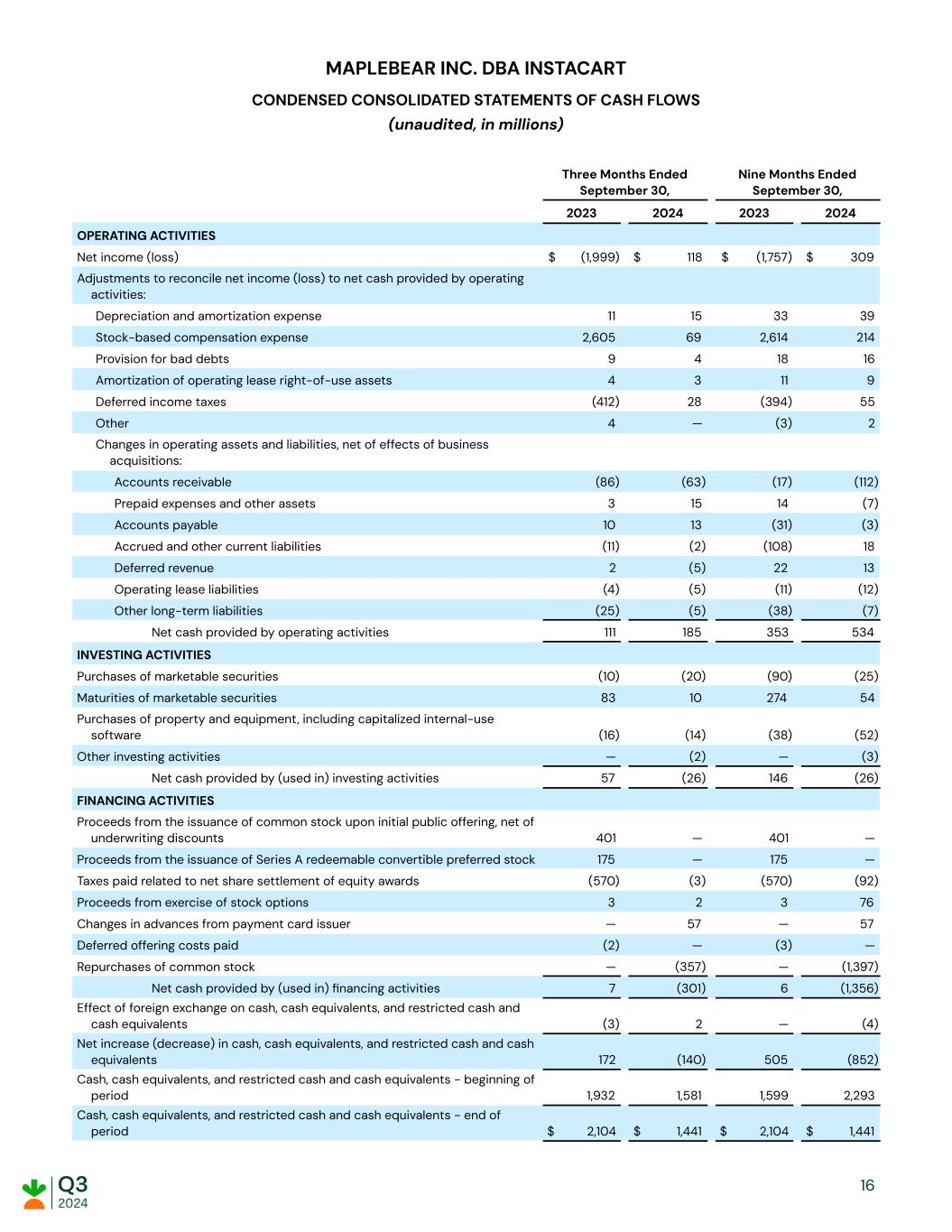 MAPLEBEAR INC. DBA INSTACART CONDENSED CONSOLIDATED STATEMENTS OF CASH FLOWS (unaudited, in millions) Three Months Ended September 30, Nine Months Ended September 30, 2023 2024 2023 2024 OPERATING ACTIVITIES Net income (loss) $ (1,999) $ 118 $ (1,757) $ 309 Adjustments to reconcile net income (loss) to net cash provided by operating activities: Depreciation and amortization expense 11 15 33 39 Stock-based compensation expense 2,605 69 2,614 214 Provision for bad debts 9 4 18 16 Amortization of operating lease right-of-use assets 4 3 11 9 Deferred income taxes (412) 28 (394) 55 Other 4 — (3) 2 Changes in operating assets and liabilities, net of effects of business acquisitions: Accounts receivable (86) (63) (17) (112) Prepaid expenses and other assets 3 15 14 (7) Accounts payable 10 13 (31) (3) Accrued and other current liabilities (11) (2) (108) 18 Deferred revenue 2 (5) 22 13 Operating lease liabilities (4) (5) (11) (12) Other long-term liabilities (25) (5) (38) (7) Net cash provided by operating activities 111 185 353 534 INVESTING ACTIVITIES Purchases of marketable securities (10) (20) (90) (25) Maturities of marketable securities 83 10 274 54 Purchases of property and equipment, including capitalized internal-use software (16) (14) (38) (52) Other investing activities — (2) — (3) Net cash provided by (used in) investing activities 57 (26) 146 (26) FINANCING ACTIVITIES Proceeds from the issuance of common stock upon initial public offering, net of underwriting discounts 401 — 401 — Proceeds from the issuance of Series A redeemable convertible preferred stock 175 — 175 — Taxes paid related to net share settlement of equity awards (570) (3) (570) (92) Proceeds from exercise of stock options 3 2 3 76 Changes in advances from payment card issuer — 57 — 57 Deferred offering costs paid (2) — (3) — Repurchases of common stock — (357) — (1,397) Net cash provided by (used in) financing activities 7 (301) 6 (1,356) Effect of foreign exchange on cash, cash equivalents, and restricted cash and cash equivalents (3) 2 — (4) Net increase (decrease) in cash, cash equivalents, and restricted cash and cash equivalents 172 (140) 505 (852) Cash, cash equivalents, and restricted cash and cash equivalents - beginning of period 1,932 1,581 1,599 2,293 Cash, cash equivalents, and restricted cash and cash equivalents - end of period $ 2,104 $ 1,441 $ 2,104 $ 1,441 16
