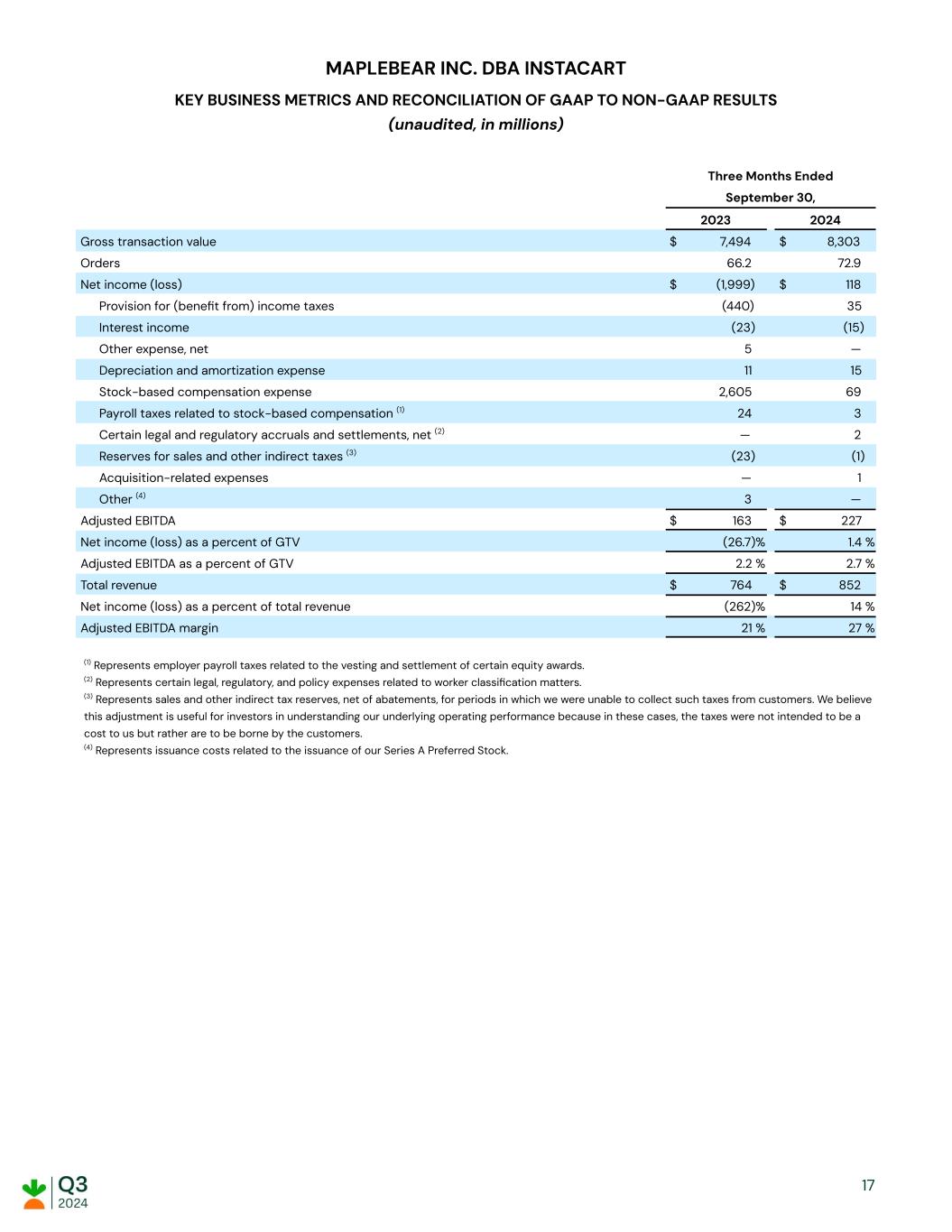 MAPLEBEAR INC. DBA INSTACART KEY BUSINESS METRICS AND RECONCILIATION OF GAAP TO NON-GAAP RESULTS (unaudited, in millions) Three Months Ended September 30, 2023 2024 Gross transaction value $ 7,494 $ 8,303 Orders 66.2 72.9 Net income (loss) $ (1,999) $ 118 Provision for (benefit from) income taxes (440) 35 Interest income (23) (15) Other expense, net 5 — Depreciation and amortization expense 11 15 Stock-based compensation expense 2,605 69 Payroll taxes related to stock-based compensation (1) 24 3 Certain legal and regulatory accruals and settlements, net (2) — 2 Reserves for sales and other indirect taxes (3) (23) (1) Acquisition-related expenses — 1 Other (4) 3 — Adjusted EBITDA $ 163 $ 227 Net income (loss) as a percent of GTV (26.7)% 1.4 % Adjusted EBITDA as a percent of GTV 2.2 % 2.7 % Total revenue $ 764 $ 852 Net income (loss) as a percent of total revenue (262)% 14 % Adjusted EBITDA margin 21 % 27 % (1) Represents employer payroll taxes related to the vesting and settlement of certain equity awards. (2) Represents certain legal, regulatory, and policy expenses related to worker classification matters. (3) Represents sales and other indirect tax reserves, net of abatements, for periods in which we were unable to collect such taxes from customers. We believe this adjustment is useful for investors in understanding our underlying operating performance because in these cases, the taxes were not intended to be a cost to us but rather are to be borne by the customers. (4) Represents issuance costs related to the issuance of our Series A Preferred Stock. 17