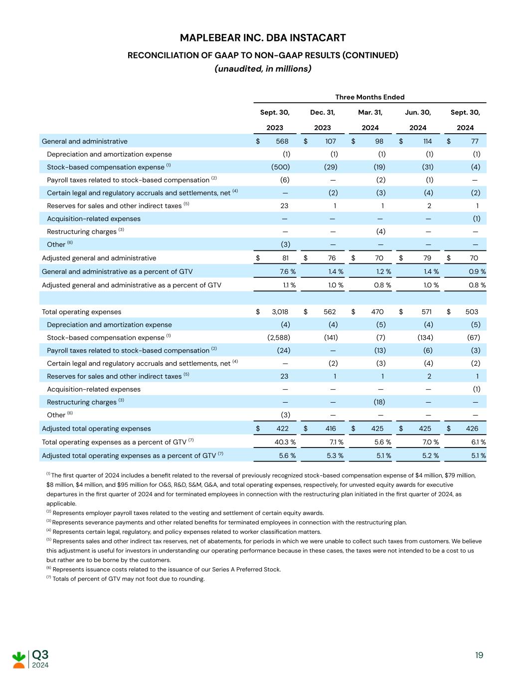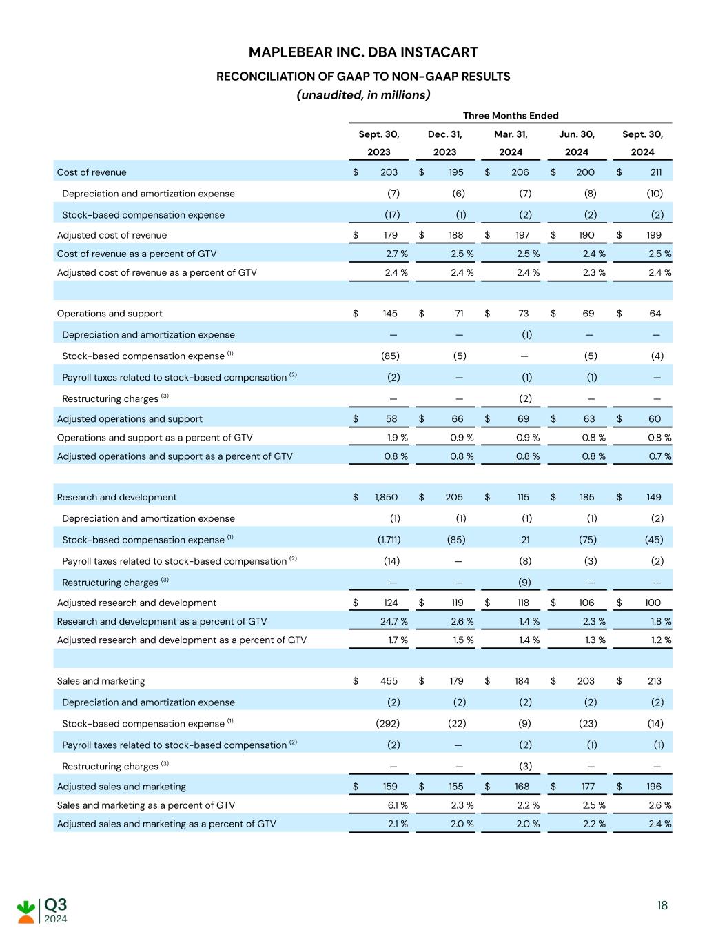 MAPLEBEAR INC. DBA INSTACART RECONCILIATION OF GAAP TO NON-GAAP RESULTS (unaudited, in millions) Three Months Ended Sept. 30, Dec. 31, Mar. 31, Jun. 30, Sept. 30, 2023 2023 2024 2024 2024 Cost of revenue $ 203 $ 195 $ 206 $ 200 $ 211 Depreciation and amortization expense (7) (6) (7) (8) (10) Stock-based compensation expense (17) (1) (2) (2) (2) Adjusted cost of revenue $ 179 $ 188 $ 197 $ 190 $ 199 Cost of revenue as a percent of GTV 2.7 % 2.5 % 2.5 % 2.4 % 2.5 % Adjusted cost of revenue as a percent of GTV 2.4 % 2.4 % 2.4 % 2.3 % 2.4 % Operations and support $ 145 $ 71 $ 73 $ 69 $ 64 Depreciation and amortization expense — — (1) — — Stock-based compensation expense (1) (85) (5) — (5) (4) Payroll taxes related to stock-based compensation (2) (2) — (1) (1) — Restructuring charges (3) — — (2) — — Adjusted operations and support $ 58 $ 66 $ 69 $ 63 $ 60 Operations and support as a percent of GTV 1.9 % 0.9 % 0.9 % 0.8 % 0.8 % Adjusted operations and support as a percent of GTV 0.8 % 0.8 % 0.8 % 0.8 % 0.7 % Research and development $ 1,850 $ 205 $ 115 $ 185 $ 149 Depreciation and amortization expense (1) (1) (1) (1) (2) Stock-based compensation expense (1) (1,711) (85) 21 (75) (45) Payroll taxes related to stock-based compensation (2) (14) — (8) (3) (2) Restructuring charges (3) — — (9) — — Adjusted research and development $ 124 $ 119 $ 118 $ 106 $ 100 Research and development as a percent of GTV 24.7 % 2.6 % 1.4 % 2.3 % 1.8 % Adjusted research and development as a percent of GTV 1.7 % 1.5 % 1.4 % 1.3 % 1.2 % Sales and marketing $ 455 $ 179 $ 184 $ 203 $ 213 Depreciation and amortization expense (2) (2) (2) (2) (2) Stock-based compensation expense (1) (292) (22) (9) (23) (14) Payroll taxes related to stock-based compensation (2) (2) — (2) (1) (1) Restructuring charges (3) — — (3) — — Adjusted sales and marketing $ 159 $ 155 $ 168 $ 177 $ 196 Sales and marketing as a percent of GTV 6.1 % 2.3 % 2.2 % 2.5 % 2.6 % Adjusted sales and marketing as a percent of GTV 2.1 % 2.0 % 2.0 % 2.2 % 2.4 % 18