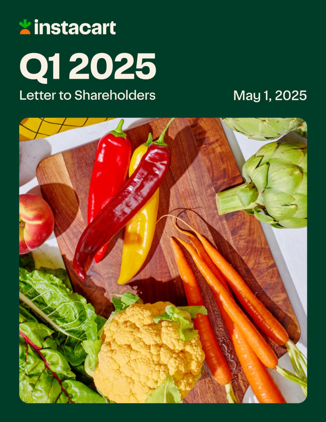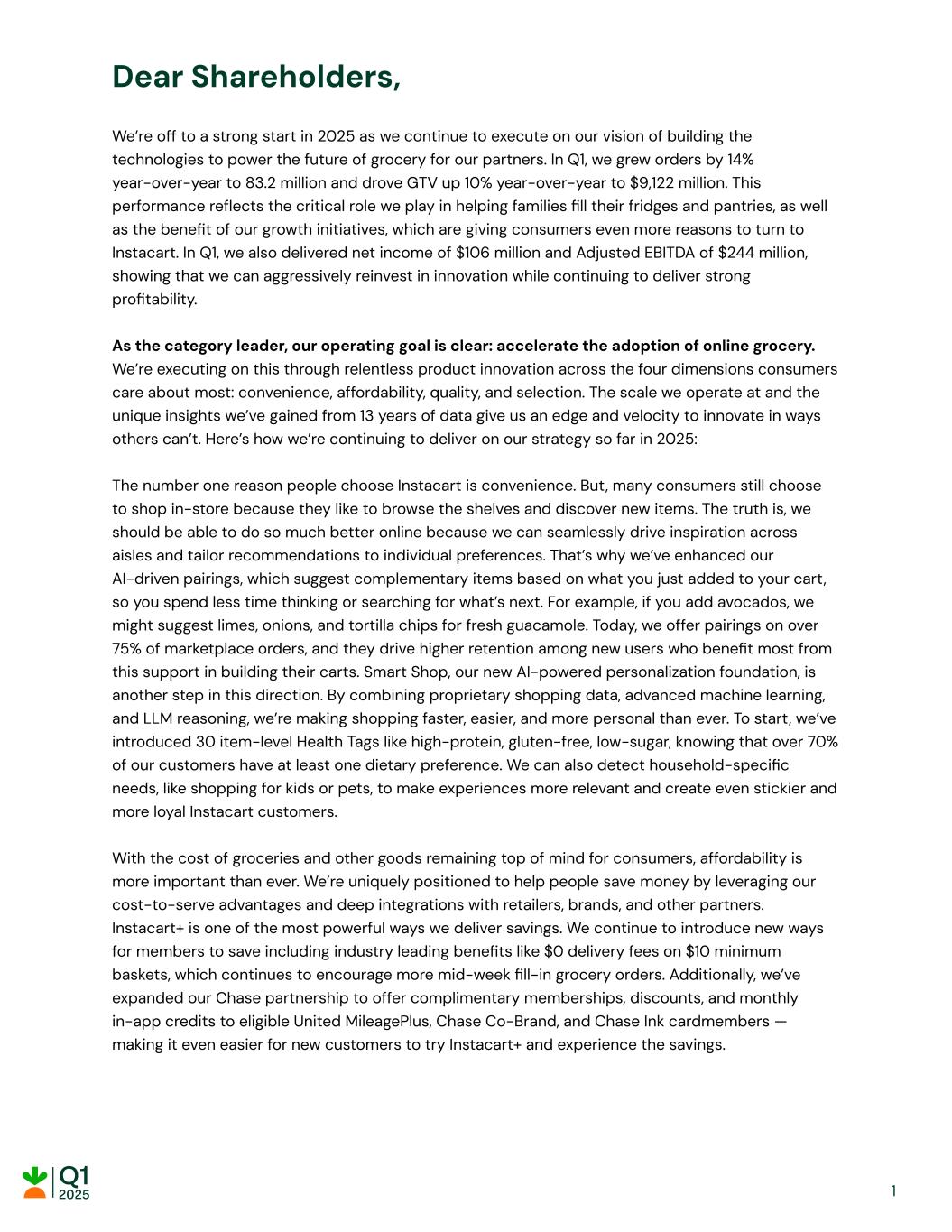 Dear Shareholders, We’re off to a strong start in 2025 as we continue to execute on our vision of building the technologies to power the future of grocery for our partners. In Q1, we grew orders by 14% year-over-year to 83.2 million and drove GTV up 10% year-over-year to $9,122 million. This performance reflects the critical role we play in helping families fill their fridges and pantries, as well as the benefit of our growth initiatives, which are giving consumers even more reasons to turn to Instacart. In Q1, we also delivered net income of $106 million and Adjusted EBITDA of $244 million, showing that we can aggressively reinvest in innovation while continuing to deliver strong profitability. As the category leader, our operating goal is clear: accelerate the adoption of online grocery. We’re executing on this through relentless product innovation across the four dimensions consumers care about most: convenience, affordability, quality, and selection. The scale we operate at and the unique insights we’ve gained from 13 years of data give us an edge and velocity to innovate in ways others can’t. Here’s how we’re continuing to deliver on our strategy so far in 2025: The number one reason people choose Instacart is convenience. But, many consumers still choose to shop in-store because they like to browse the shelves and discover new items. The truth is, we should be able to do so much better online because we can seamlessly drive inspiration across aisles and tailor recommendations to individual preferences. That’s why we’ve enhanced our AI-driven pairings, which suggest complementary items based on what you just added to your cart, so you spend less time thinking or searching for what’s next. For example, if you add avocados, we might suggest limes, onions, and tortilla chips for fresh guacamole. Today, we offer pairings on over 75% of marketplace orders, and they drive higher retention among new users who benefit most from this support in building their carts. Smart Shop, our new AI-powered personalization foundation, is another step in this direction. By combining proprietary shopping data, advanced machine learning, and LLM reasoning, we’re making shopping faster, easier, and more personal than ever. To start, we’ve introduced 30 item-level Health Tags like high-protein, gluten-free, low-sugar, knowing that over 70% of our customers have at least one dietary preference. We can also detect household-specific needs, like shopping for kids or pets, to make experiences more relevant and create even stickier and more loyal Instacart customers. With the cost of groceries and other goods remaining top of mind for consumers, affordability is more important than ever. We’re uniquely positioned to help people save money by leveraging our cost-to-serve advantages and deep integrations with retailers, brands, and other partners. Instacart+ is one of the most powerful ways we deliver savings. We continue to introduce new ways for members to save including industry leading benefits like $0 delivery fees on $10 minimum baskets, which continues to encourage more mid-week fill-in grocery orders. Additionally, we’ve expanded our Chase partnership to offer complimentary memberships, discounts, and monthly in-app credits to eligible United MileagePlus, Chase Co-Brand, and Chase Ink cardmembers — making it even easier for new customers to try Instacart+ and experience the savings. 1