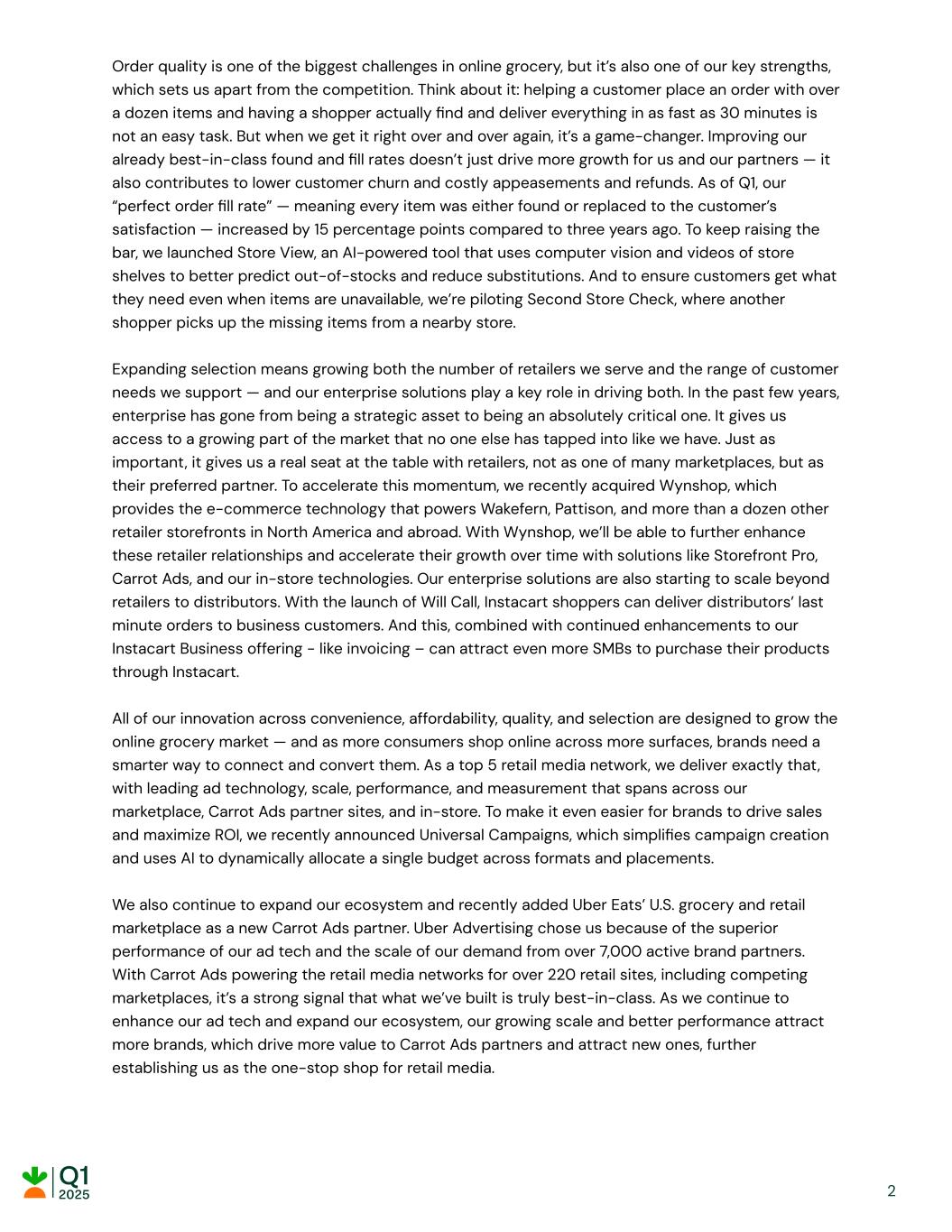 Order quality is one of the biggest challenges in online grocery, but it’s also one of our key strengths, which sets us apart from the competition. Think about it: helping a customer place an order with over a dozen items and having a shopper actually find and deliver everything in as fast as 30 minutes is not an easy task. But when we get it right over and over again, it’s a game-changer. Improving our already best-in-class found and fill rates doesn’t just drive more growth for us and our partners — it also contributes to lower customer churn and costly appeasements and refunds. As of Q1, our “perfect order fill rate” — meaning every item was either found or replaced to the customer’s satisfaction — increased by 15 percentage points compared to three years ago. To keep raising the bar, we launched Store View, an AI-powered tool that uses computer vision and videos of store shelves to better predict out-of-stocks and reduce substitutions. And to ensure customers get what they need even when items are unavailable, we’re piloting Second Store Check, where another shopper picks up the missing items from a nearby store. Expanding selection means growing both the number of retailers we serve and the range of customer needs we support — and our enterprise solutions play a key role in driving both. In the past few years, enterprise has gone from being a strategic asset to being an absolutely critical one. It gives us access to a growing part of the market that no one else has tapped into like we have. Just as important, it gives us a real seat at the table with retailers, not as one of many marketplaces, but as their preferred partner. To accelerate this momentum, we recently acquired Wynshop, which provides the e-commerce technology that powers Wakefern, Pattison, and more than a dozen other retailer storefronts in North America and abroad. With Wynshop, we’ll be able to further enhance these retailer relationships and accelerate their growth over time with solutions like Storefront Pro, Carrot Ads, and our in-store technologies. Our enterprise solutions are also starting to scale beyond retailers to distributors. With the launch of Will Call, Instacart shoppers can deliver distributors’ last minute orders to business customers. And this, combined with continued enhancements to our Instacart Business offering - like invoicing – can attract even more SMBs to purchase their products through Instacart. All of our innovation across convenience, affordability, quality, and selection are designed to grow the online grocery market — and as more consumers shop online across more surfaces, brands need a smarter way to connect and convert them. As a top 5 retail media network, we deliver exactly that, with leading ad technology, scale, performance, and measurement that spans across our marketplace, Carrot Ads partner sites, and in-store. To make it even easier for brands to drive sales and maximize ROI, we recently announced Universal Campaigns, which simplifies campaign creation and uses AI to dynamically allocate a single budget across formats and placements. We also continue to expand our ecosystem and recently added Uber Eats’ U.S. grocery and retail marketplace as a new Carrot Ads partner. Uber Advertising chose us because of the superior performance of our ad tech and the scale of our demand from over 7,000 active brand partners. With Carrot Ads powering the retail media networks for over 220 retail sites, including competing marketplaces, it’s a strong signal that what we’ve built is truly best-in-class. As we continue to enhance our ad tech and expand our ecosystem, our growing scale and better performance attract more brands, which drive more value to Carrot Ads partners and attract new ones, further establishing us as the one-stop shop for retail media. 2