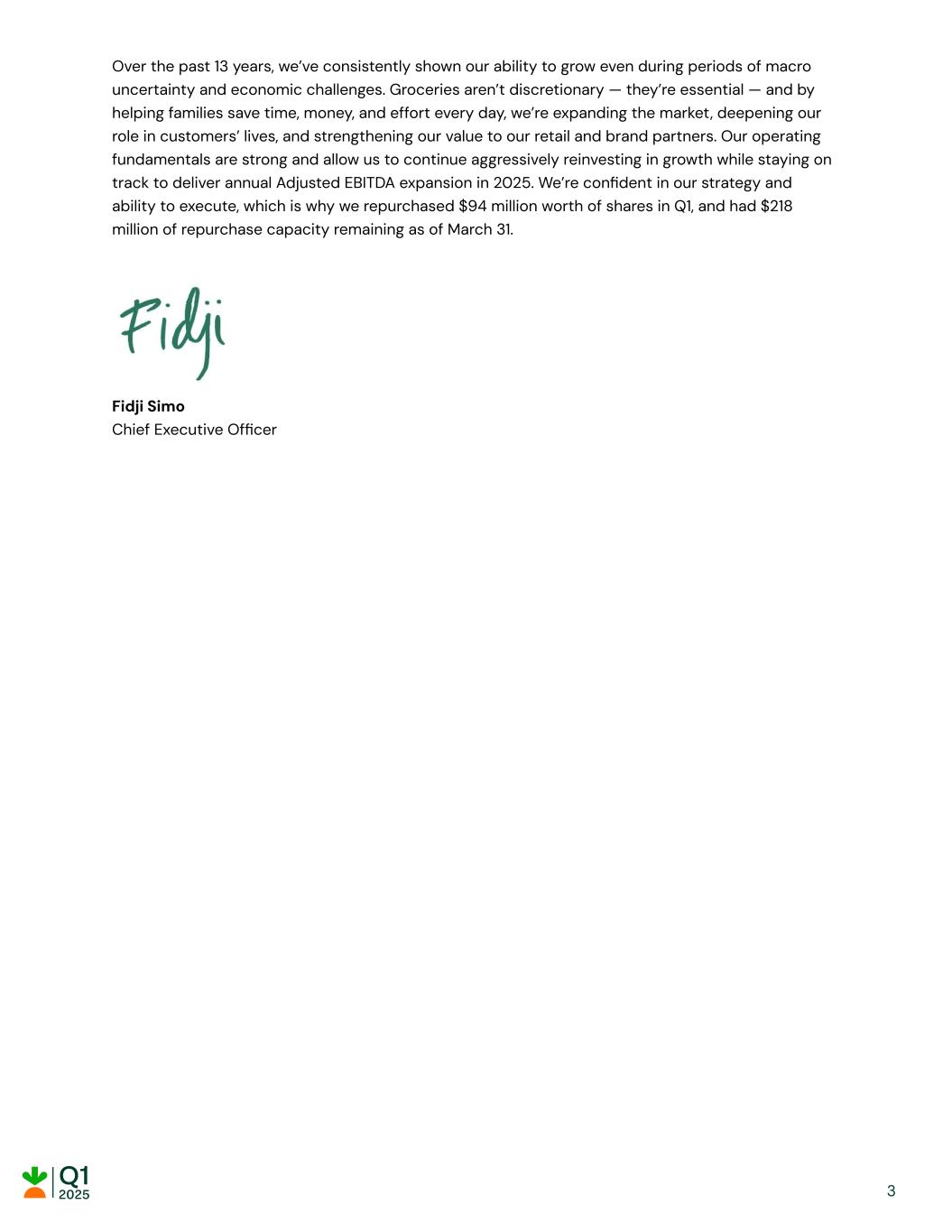 Over the past 13 years, we’ve consistently shown our ability to grow even during periods of macro uncertainty and economic challenges. Groceries aren’t discretionary — they’re essential — and by helping families save time, money, and effort every day, we’re expanding the market, deepening our role in customers’ lives, and strengthening our value to our retail and brand partners. Our operating fundamentals are strong and allow us to continue aggressively reinvesting in growth while staying on track to deliver annual Adjusted EBITDA expansion in 2025. We’re confident in our strategy and ability to execute, which is why we repurchased $94 million worth of shares in Q1, and had $218 million of repurchase capacity remaining as of March 31. Fidji Simo Chief Executive Officer 3