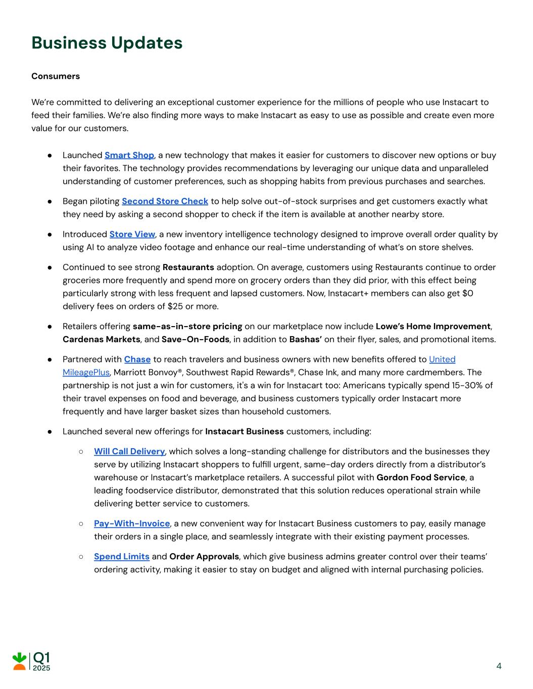 Business Updates Consumers We’re committed to delivering an exceptional customer experience for the millions of people who use Instacart to feed their families. We’re also finding more ways to make Instacart as easy to use as possible and create even more value for our customers. ● Launched Smart Shop, a new technology that makes it easier for customers to discover new options or buy their favorites. The technology provides recommendations by leveraging our unique data and unparalleled understanding of customer preferences, such as shopping habits from previous purchases and searches. ● Began piloting Second Store Check to help solve out-of-stock surprises and get customers exactly what they need by asking a second shopper to check if the item is available at another nearby store. ● Introduced Store View, a new inventory intelligence technology designed to improve overall order quality by using AI to analyze video footage and enhance our real-time understanding of what’s on store shelves. ● Continued to see strong Restaurants adoption. On average, customers using Restaurants continue to order groceries more frequently and spend more on grocery orders than they did prior, with this effect being particularly strong with less frequent and lapsed customers. Now, Instacart+ members can also get $0 delivery fees on orders of $25 or more. ● Retailers offering same-as-in-store pricing on our marketplace now include Lowe’s Home Improvement, Cardenas Markets, and Save-On-Foods, in addition to Bashas’ on their flyer, sales, and promotional items. ● Partnered with Chase to reach travelers and business owners with new benefits offered to United MileagePlus, Marriott Bonvoy®, Southwest Rapid Rewards®, Chase Ink, and many more cardmembers. The partnership is not just a win for customers, it's a win for Instacart too: Americans typically spend 15-30% of their travel expenses on food and beverage, and business customers typically order Instacart more frequently and have larger basket sizes than household customers. ● Launched several new offerings for Instacart Business customers, including: ○ Will Call Delivery, which solves a long-standing challenge for distributors and the businesses they serve by utilizing Instacart shoppers to fulfill urgent, same-day orders directly from a distributor’s warehouse or Instacart’s marketplace retailers. A successful pilot with Gordon Food Service, a leading foodservice distributor, demonstrated that this solution reduces operational strain while delivering better service to customers. ○ Pay-With-Invoice, a new convenient way for Instacart Business customers to pay, easily manage their orders in a single place, and seamlessly integrate with their existing payment processes. ○ Spend Limits and Order Approvals, which give business admins greater control over their teams’ ordering activity, making it easier to stay on budget and aligned with internal purchasing policies. 4