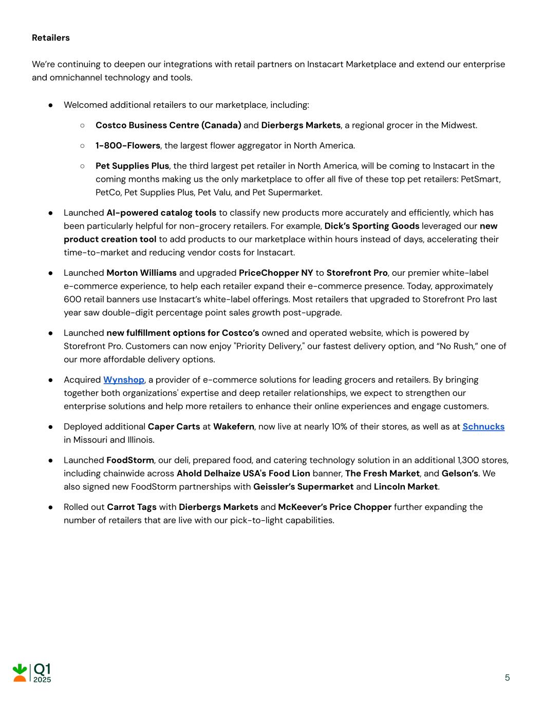 Retailers We’re continuing to deepen our integrations with retail partners on Instacart Marketplace and extend our enterprise and omnichannel technology and tools. ● Welcomed additional retailers to our marketplace, including: ○ Costco Business Centre (Canada) and Dierbergs Markets, a regional grocer in the Midwest. ○ 1-800-Flowers, the largest flower aggregator in North America. ○ Pet Supplies Plus, the third largest pet retailer in North America, will be coming to Instacart in the coming months making us the only marketplace to offer all five of these top pet retailers: PetSmart, PetCo, Pet Supplies Plus, Pet Valu, and Pet Supermarket. ● Launched AI-powered catalog tools to classify new products more accurately and efficiently, which has been particularly helpful for non-grocery retailers. For example, Dick’s Sporting Goods leveraged our new product creation tool to add products to our marketplace within hours instead of days, accelerating their time-to-market and reducing vendor costs for Instacart. ● Launched Morton Williams and upgraded PriceChopper NY to Storefront Pro, our premier white-label e-commerce experience, to help each retailer expand their e-commerce presence. Today, approximately 600 retail banners use Instacart’s white-label offerings. Most retailers that upgraded to Storefront Pro last year saw double-digit percentage point sales growth post-upgrade. ● Launched new fulfillment options for Costco’s owned and operated website, which is powered by Storefront Pro. Customers can now enjoy "Priority Delivery," our fastest delivery option, and “No Rush,” one of our more affordable delivery options. ● Acquired Wynshop, a provider of e-commerce solutions for leading grocers and retailers. By bringing together both organizations' expertise and deep retailer relationships, we expect to strengthen our enterprise solutions and help more retailers to enhance their online experiences and engage customers. ● Deployed additional Caper Carts at Wakefern, now live at nearly 10% of their stores, as well as at Schnucks in Missouri and Illinois. ● Launched FoodStorm, our deli, prepared food, and catering technology solution in an additional 1,300 stores, including chainwide across Ahold Delhaize USA's Food Lion banner, The Fresh Market, and Gelson’s. We also signed new FoodStorm partnerships with Geissler’s Supermarket and Lincoln Market. ● Rolled out Carrot Tags with Dierbergs Markets and McKeever’s Price Chopper further expanding the number of retailers that are live with our pick-to-light capabilities. 5