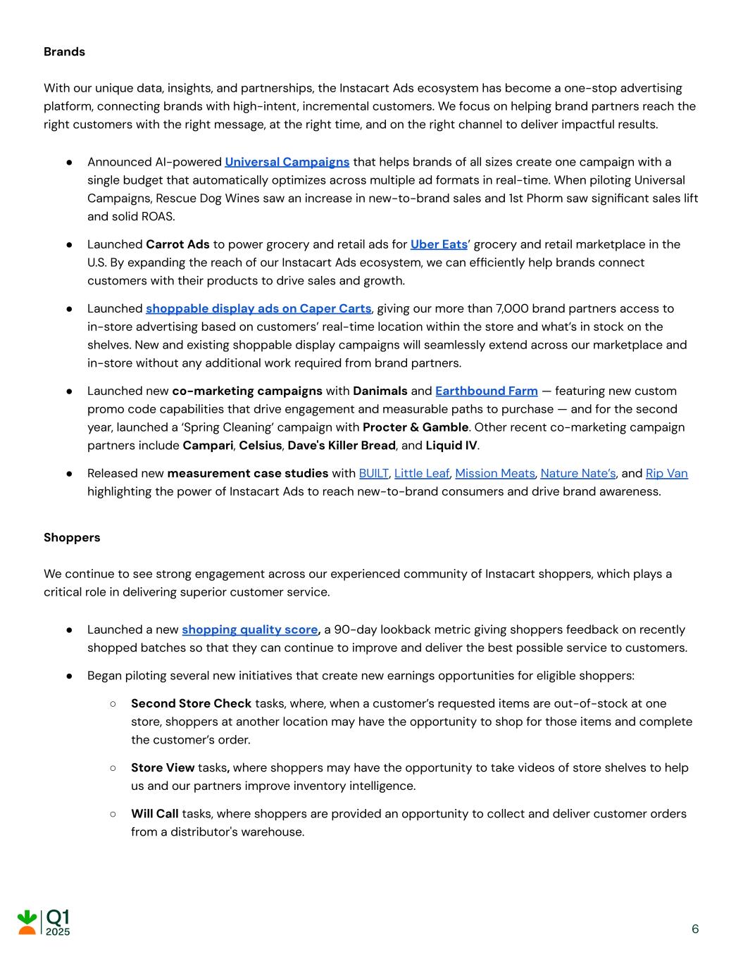 Brands With our unique data, insights, and partnerships, the Instacart Ads ecosystem has become a one-stop advertising platform, connecting brands with high-intent, incremental customers. We focus on helping brand partners reach the right customers with the right message, at the right time, and on the right channel to deliver impactful results. ● Announced AI-powered Universal Campaigns that helps brands of all sizes create one campaign with a single budget that automatically optimizes across multiple ad formats in real-time. When piloting Universal Campaigns, Rescue Dog Wines saw an increase in new-to-brand sales and 1st Phorm saw significant sales lift and solid ROAS. ● Launched Carrot Ads to power grocery and retail ads for Uber Eats’ grocery and retail marketplace in the U.S. By expanding the reach of our Instacart Ads ecosystem, we can efficiently help brands connect customers with their products to drive sales and growth. ● Launched shoppable display ads on Caper Carts, giving our more than 7,000 brand partners access to in-store advertising based on customers’ real-time location within the store and what’s in stock on the shelves. New and existing shoppable display campaigns will seamlessly extend across our marketplace and in-store without any additional work required from brand partners. ● Launched new co-marketing campaigns with Danimals and Earthbound Farm — featuring new custom promo code capabilities that drive engagement and measurable paths to purchase — and for the second year, launched a ‘Spring Cleaning’ campaign with Procter & Gamble. Other recent co-marketing campaign partners include Campari, Celsius, Dave's Killer Bread, and Liquid IV. ● Released new measurement case studies with BUILT, Little Leaf, Mission Meats, Nature Nate’s, and Rip Van highlighting the power of Instacart Ads to reach new-to-brand consumers and drive brand awareness. Shoppers We continue to see strong engagement across our experienced community of Instacart shoppers, which plays a critical role in delivering superior customer service. ● Launched a new shopping quality score, a 90-day lookback metric giving shoppers feedback on recently shopped batches so that they can continue to improve and deliver the best possible service to customers. ● Began piloting several new initiatives that create new earnings opportunities for eligible shoppers: ○ Second Store Check tasks, where, when a customer’s requested items are out-of-stock at one store, shoppers at another location may have the opportunity to shop for those items and complete the customer’s order. ○ Store View tasks, where shoppers may have the opportunity to take videos of store shelves to help us and our partners improve inventory intelligence. ○ Will Call tasks, where shoppers are provided an opportunity to collect and deliver customer orders from a distributor's warehouse. 6