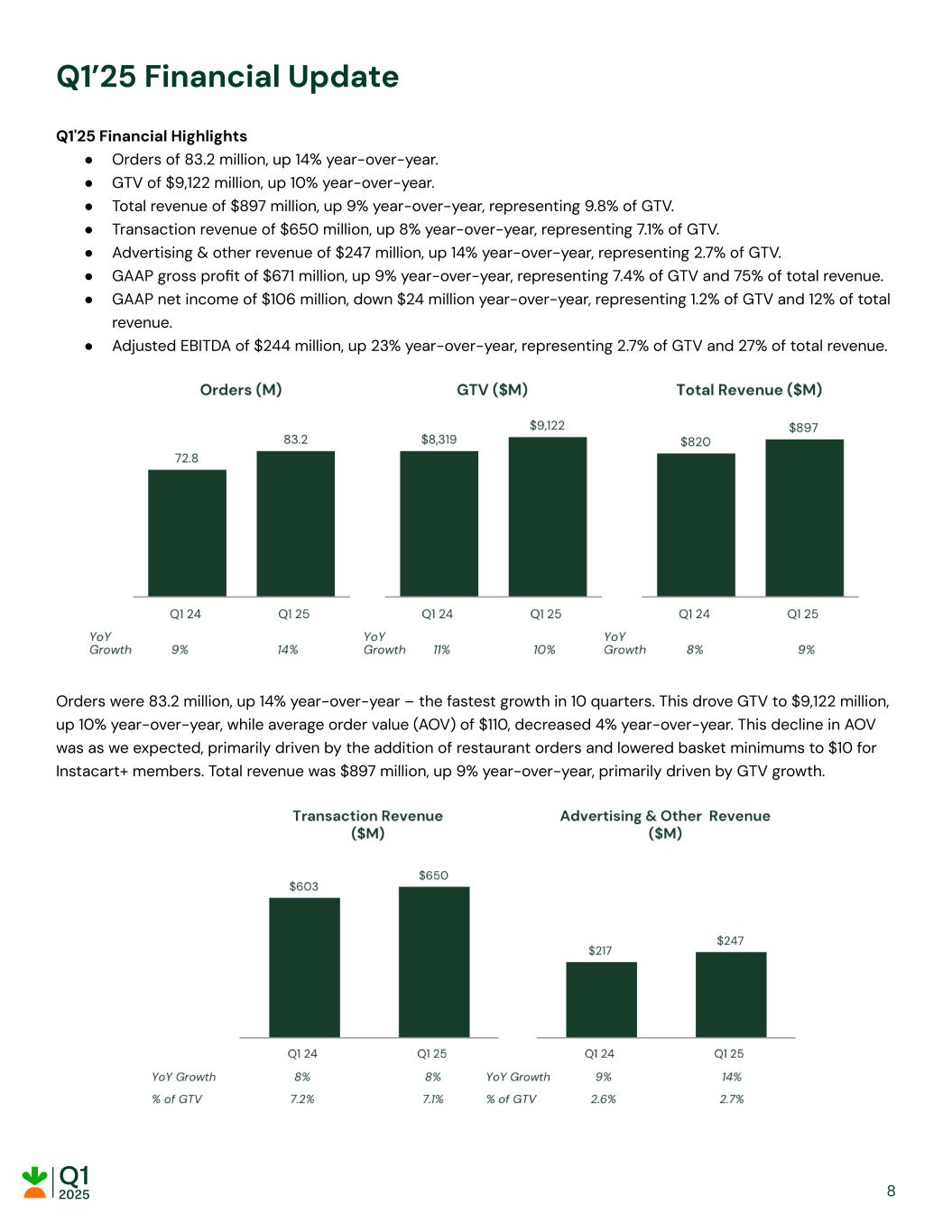 Q1’25 Financial Update Q1'25 Financial Highlights ● Orders of 83.2 million, up 14% year-over-year. ● GTV of $9,122 million, up 10% year-over-year. ● Total revenue of $897 million, up 9% year-over-year, representing 9.8% of GTV. ● Transaction revenue of $650 million, up 8% year-over-year, representing 7.1% of GTV. ● Advertising & other revenue of $247 million, up 14% year-over-year, representing 2.7% of GTV. ● GAAP gross profit of $671 million, up 9% year-over-year, representing 7.4% of GTV and 75% of total revenue. ● GAAP net income of $106 million, down $24 million year-over-year, representing 1.2% of GTV and 12% of total revenue. ● Adjusted EBITDA of $244 million, up 23% year-over-year, representing 2.7% of GTV and 27% of total revenue. Orders were 83.2 million, up 14% year-over-year – the fastest growth in 10 quarters. This drove GTV to $9,122 million, up 10% year-over-year, while average order value (AOV) of $110, decreased 4% year-over-year. This decline in AOV was as we expected, primarily driven by the addition of restaurant orders and lowered basket minimums to $10 for Instacart+ members. Total revenue was $897 million, up 9% year-over-year, primarily driven by GTV growth. 8