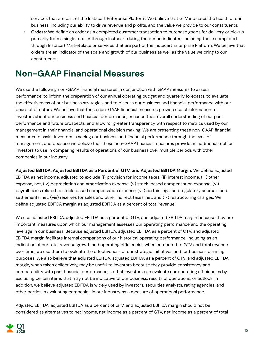 services that are part of the Instacart Enterprise Platform. We believe that GTV indicates the health of our business, including our ability to drive revenue and profits, and the value we provide to our constituents. • Orders: We define an order as a completed customer transaction to purchase goods for delivery or pickup primarily from a single retailer through Instacart during the period indicated, including those completed through Instacart Marketplace or services that are part of the Instacart Enterprise Platform. We believe that orders are an indicator of the scale and growth of our business as well as the value we bring to our constituents. Non-GAAP Financial Measures We use the following non-GAAP financial measures in conjunction with GAAP measures to assess performance, to inform the preparation of our annual operating budget and quarterly forecasts, to evaluate the effectiveness of our business strategies, and to discuss our business and financial performance with our board of directors. We believe that these non-GAAP financial measures provide useful information to investors about our business and financial performance, enhance their overall understanding of our past performance and future prospects, and allow for greater transparency with respect to metrics used by our management in their financial and operational decision making. We are presenting these non-GAAP financial measures to assist investors in seeing our business and financial performance through the eyes of management, and because we believe that these non-GAAP financial measures provide an additional tool for investors to use in comparing results of operations of our business over multiple periods with other companies in our industry. Adjusted EBITDA, Adjusted EBITDA as a Percent of GTV, and Adjusted EBITDA Margin. We define adjusted EBITDA as net income, adjusted to exclude (i) provision for income taxes, (ii) interest income, (iii) other expense, net, (iv) depreciation and amortization expense, (v) stock-based compensation expense, (vi) payroll taxes related to stock-based compensation expense, (vii) certain legal and regulatory accruals and settlements, net, (viii) reserves for sales and other indirect taxes, net, and (ix) restructuring charges. We define adjusted EBITDA margin as adjusted EBITDA as a percent of total revenue. We use adjusted EBITDA, adjusted EBITDA as a percent of GTV, and adjusted EBITDA margin because they are important measures upon which our management assesses our operating performance and the operating leverage in our business. Because adjusted EBITDA, adjusted EBITDA as a percent of GTV, and adjusted EBITDA margin facilitate internal comparisons of our historical operating performance, including as an indication of our total revenue growth and operating efficiencies when compared to GTV and total revenue over time, we use them to evaluate the effectiveness of our strategic initiatives and for business planning purposes. We also believe that adjusted EBITDA, adjusted EBITDA as a percent of GTV, and adjusted EBITDA margin, when taken collectively, may be useful to investors because they provide consistency and comparability with past financial performance, so that investors can evaluate our operating efficiencies by excluding certain items that may not be indicative of our business, results of operations, or outlook. In addition, we believe adjusted EBITDA is widely used by investors, securities analysts, rating agencies, and other parties in evaluating companies in our industry as a measure of operational performance. Adjusted EBITDA, adjusted EBITDA as a percent of GTV, and adjusted EBITDA margin should not be considered as alternatives to net income, net income as a percent of GTV, net income as a percent of total 13