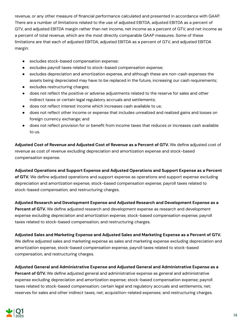 revenue, or any other measure of financial performance calculated and presented in accordance with GAAP. There are a number of limitations related to the use of adjusted EBITDA, adjusted EBITDA as a percent of GTV, and adjusted EBITDA margin rather than net income, net income as a percent of GTV, and net income as a percent of total revenue, which are the most directly comparable GAAP measures. Some of these limitations are that each of adjusted EBITDA, adjusted EBITDA as a percent of GTV, and adjusted EBITDA margin: ● excludes stock-based compensation expense; ● excludes payroll taxes related to stock-based compensation expense; ● excludes depreciation and amortization expense, and although these are non-cash expenses the assets being depreciated may have to be replaced in the future, increasing our cash requirements; ● excludes restructuring charges; ● does not reflect the positive or adverse adjustments related to the reserve for sales and other indirect taxes or certain legal regulatory accruals and settlements; ● does not reflect interest income which increases cash available to us; ● does not reflect other income or expense that includes unrealized and realized gains and losses on foreign currency exchange; and ● does not reflect provision for or benefit from income taxes that reduces or increases cash available to us. Adjusted Cost of Revenue and Adjusted Cost of Revenue as a Percent of GTV. We define adjusted cost of revenue as cost of revenue excluding depreciation and amortization expense and stock-based compensation expense. Adjusted Operations and Support Expense and Adjusted Operations and Support Expense as a Percent of GTV. We define adjusted operations and support expense as operations and support expense excluding depreciation and amortization expense, stock-based compensation expense, payroll taxes related to stock-based compensation, and restructuring charges. Adjusted Research and Development Expense and Adjusted Research and Development Expense as a Percent of GTV. We define adjusted research and development expense as research and development expense excluding depreciation and amortization expense, stock-based compensation expense, payroll taxes related to stock-based compensation, and restructuring charges. Adjusted Sales and Marketing Expense and Adjusted Sales and Marketing Expense as a Percent of GTV. We define adjusted sales and marketing expense as sales and marketing expense excluding depreciation and amortization expense, stock-based compensation expense, payroll taxes related to stock-based compensation, and restructuring charges. Adjusted General and Administrative Expense and Adjusted General and Administrative Expense as a Percent of GTV. We define adjusted general and administrative expense as general and administrative expense excluding depreciation and amortization expense; stock-based compensation expense; payroll taxes related to stock-based compensation; certain legal and regulatory accruals and settlements, net; reserves for sales and other indirect taxes, net; acquisition-related expenses; and restructuring charges. 14