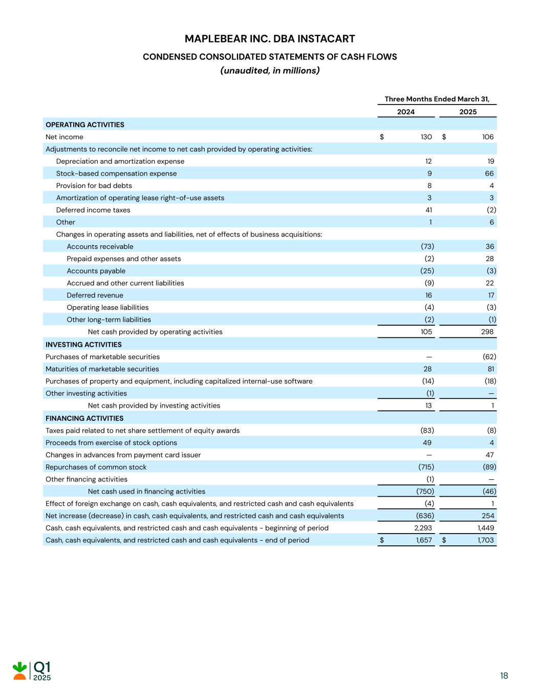 MAPLEBEAR INC. DBA INSTACART CONDENSED CONSOLIDATED STATEMENTS OF CASH FLOWS (unaudited, in millions) Three Months Ended March 31, 2024 2025 OPERATING ACTIVITIES Net income $ 130 $ 106 Adjustments to reconcile net income to net cash provided by operating activities: Depreciation and amortization expense 12 19 Stock-based compensation expense 9 66 Provision for bad debts 8 4 Amortization of operating lease right-of-use assets 3 3 Deferred income taxes 41 (2) Other 1 6 Changes in operating assets and liabilities, net of effects of business acquisitions: Accounts receivable (73) 36 Prepaid expenses and other assets (2) 28 Accounts payable (25) (3) Accrued and other current liabilities (9) 22 Deferred revenue 16 17 Operating lease liabilities (4) (3) Other long-term liabilities (2) (1) Net cash provided by operating activities 105 298 INVESTING ACTIVITIES Purchases of marketable securities — (62) Maturities of marketable securities 28 81 Purchases of property and equipment, including capitalized internal-use software (14) (18) Other investing activities (1) — Net cash provided by investing activities 13 1 FINANCING ACTIVITIES Taxes paid related to net share settlement of equity awards (83) (8) Proceeds from exercise of stock options 49 4 Changes in advances from payment card issuer — 47 Repurchases of common stock (715) (89) Other financing activities (1) — Net cash used in financing activities (750) (46) Effect of foreign exchange on cash, cash equivalents, and restricted cash and cash equivalents (4) 1 Net increase (decrease) in cash, cash equivalents, and restricted cash and cash equivalents (636) 254 Cash, cash equivalents, and restricted cash and cash equivalents - beginning of period 2,293 1,449 Cash, cash equivalents, and restricted cash and cash equivalents - end of period $ 1,657 $ 1,703 18