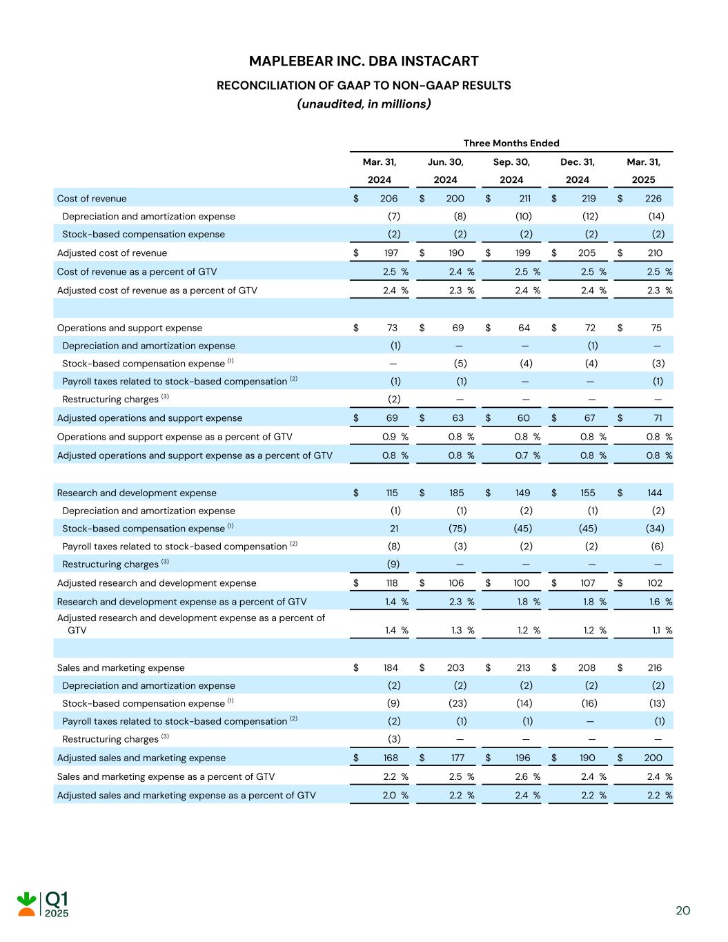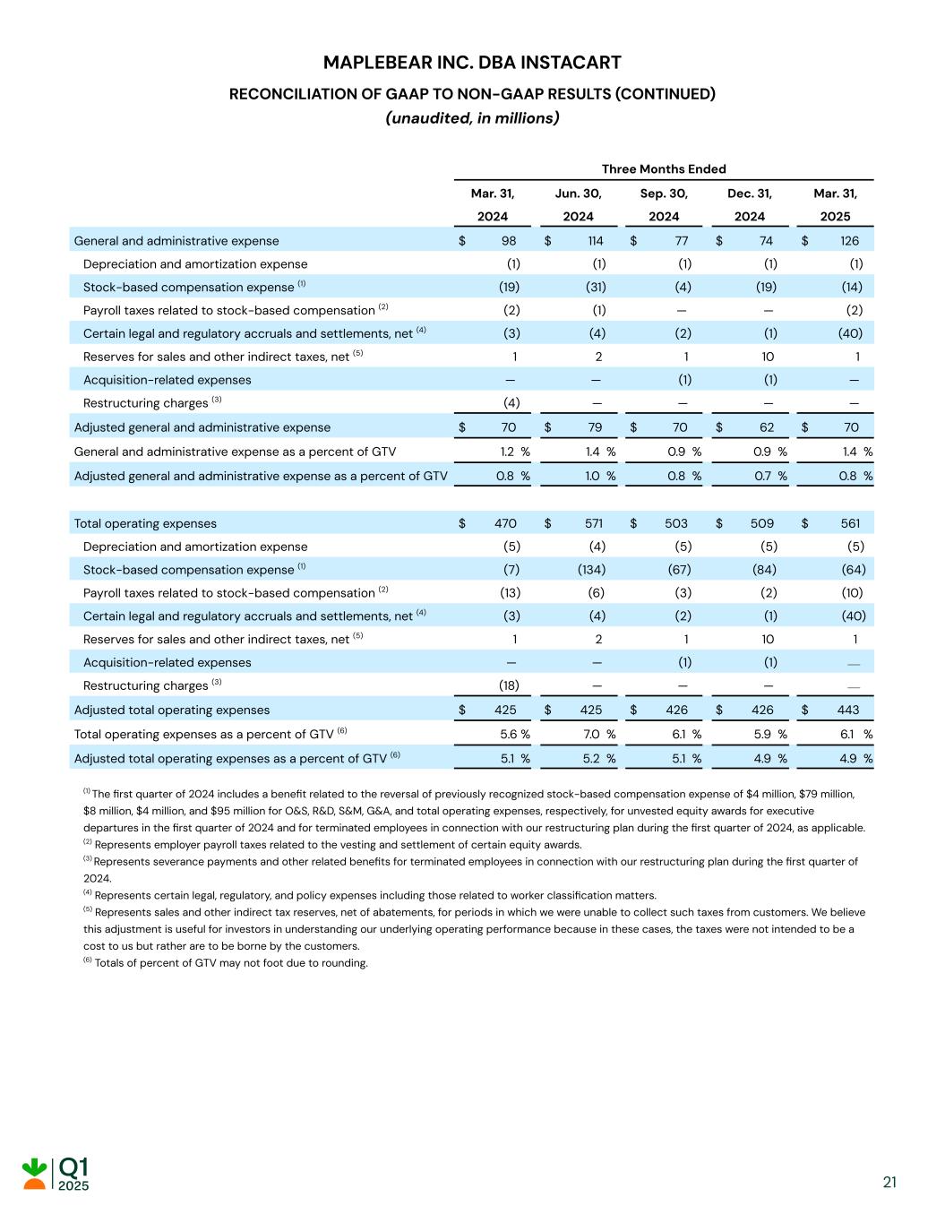 MAPLEBEAR INC. DBA INSTACART RECONCILIATION OF GAAP TO NON-GAAP RESULTS (unaudited, in millions) Three Months Ended Mar. 31, Jun. 30, Sep. 30, Dec. 31, Mar. 31, 2024 2024 2024 2024 2025 Cost of revenue $ 206 $ 200 $ 211 $ 219 $ 226 Depreciation and amortization expense (7) (8) (10) (12) (14) Stock-based compensation expense (2) (2) (2) (2) (2) Adjusted cost of revenue $ 197 $ 190 $ 199 $ 205 $ 210 Cost of revenue as a percent of GTV 2.5 % 2.4 % 2.5 % 2.5 % 2.5 % Adjusted cost of revenue as a percent of GTV 2.4 % 2.3 % 2.4 % 2.4 % 2.3 % Operations and support expense $ 73 $ 69 $ 64 $ 72 $ 75 Depreciation and amortization expense (1) — — (1) — Stock-based compensation expense (1) — (5) (4) (4) (3) Payroll taxes related to stock-based compensation (2) (1) (1) — — (1) Restructuring charges (3) (2) — — — — Adjusted operations and support expense $ 69 $ 63 $ 60 $ 67 $ 71 Operations and support expense as a percent of GTV 0.9 % 0.8 % 0.8 % 0.8 % 0.8 % Adjusted operations and support expense as a percent of GTV 0.8 % 0.8 % 0.7 % 0.8 % 0.8 % Research and development expense $ 115 $ 185 $ 149 $ 155 $ 144 Depreciation and amortization expense (1) (1) (2) (1) (2) Stock-based compensation expense (1) 21 (75) (45) (45) (34) Payroll taxes related to stock-based compensation (2) (8) (3) (2) (2) (6) Restructuring charges (3) (9) — — — — Adjusted research and development expense $ 118 $ 106 $ 100 $ 107 $ 102 Research and development expense as a percent of GTV 1.4 % 2.3 % 1.8 % 1.8 % 1.6 % Adjusted research and development expense as a percent of GTV 1.4 % 1.3 % 1.2 % 1.2 % 1.1 % Sales and marketing expense $ 184 $ 203 $ 213 $ 208 $ 216 Depreciation and amortization expense (2) (2) (2) (2) (2) Stock-based compensation expense (1) (9) (23) (14) (16) (13) Payroll taxes related to stock-based compensation (2) (2) (1) (1) — (1) Restructuring charges (3) (3) — — — — Adjusted sales and marketing expense $ 168 $ 177 $ 196 $ 190 $ 200 Sales and marketing expense as a percent of GTV 2.2 % 2.5 % 2.6 % 2.4 % 2.4 % Adjusted sales and marketing expense as a percent of GTV 2.0 % 2.2 % 2.4 % 2.2 % 2.2 % 20