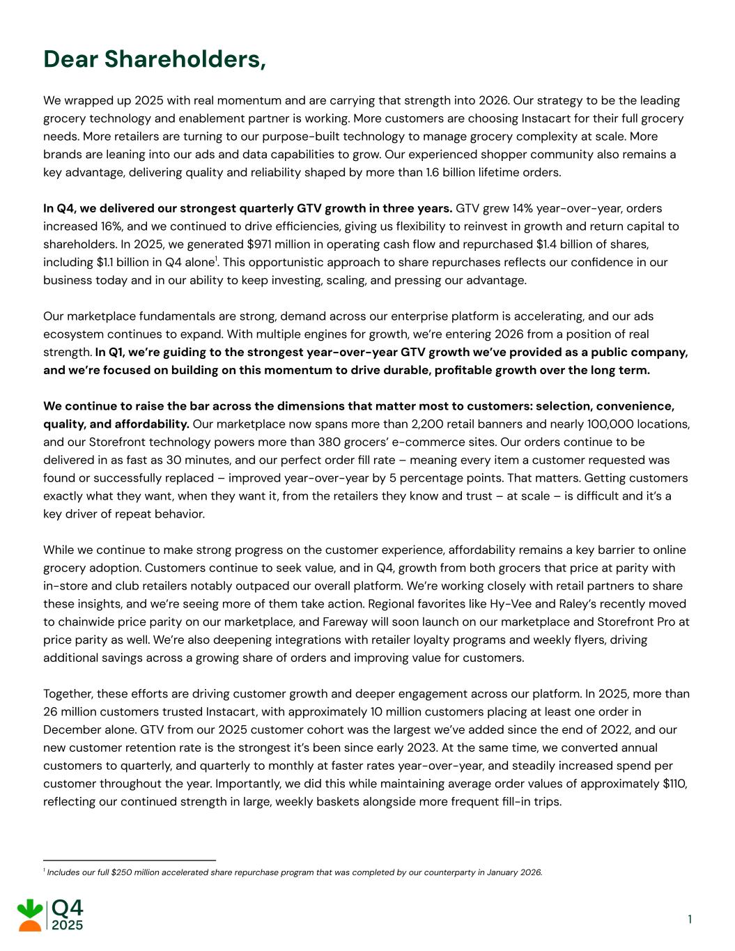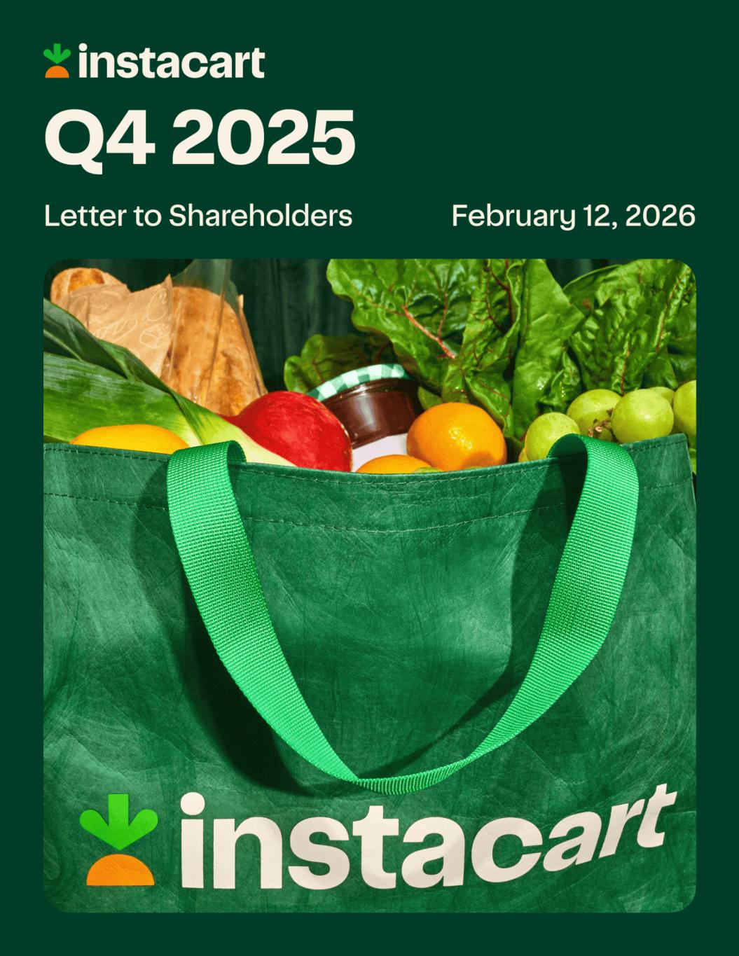 Dear Shareholders, We wrapped up 2025 with real momentum and are carrying that strength into 2026. Our strategy to be the leading grocery technology and enablement partner is working. More customers are choosing Instacart for their full grocery needs. More retailers are turning to our purpose-built technology to manage grocery complexity at scale. More brands are leaning into our ads and data capabilities to grow. Our experienced shopper community also remains a key advantage, delivering quality and reliability shaped by more than 1.6 billion lifetime orders. In Q4, we delivered our strongest quarterly GTV growth in three years. GTV grew 14% year-over-year, orders increased 16%, and we continued to drive efficiencies, giving us flexibility to reinvest in growth and return capital to shareholders. In 2025, we generated $971 million in operating cash flow and repurchased $1.4 billion of shares, including $1.1 billion in Q4 alone1. This opportunistic approach to share repurchases reflects our confidence in our business today and in our ability to keep investing, scaling, and pressing our advantage. Our marketplace fundamentals are strong, demand across our enterprise platform is accelerating, and our ads ecosystem continues to expand. With multiple engines for growth, we’re entering 2026 from a position of real strength. In Q1, we’re guiding to the strongest year-over-year GTV growth we’ve provided as a public company, and we’re focused on building on this momentum to drive durable, profitable growth over the long term. We continue to raise the bar across the dimensions that matter most to customers: selection, convenience, quality, and affordability. Our marketplace now spans more than 2,200 retail banners and nearly 100,000 locations, and our Storefront technology powers more than 380 grocers’ e-commerce sites. Our orders continue to be delivered in as fast as 30 minutes, and our perfect order fill rate – meaning every item a customer requested was found or successfully replaced – improved year-over-year by 5 percentage points. That matters. Getting customers exactly what they want, when they want it, from the retailers they know and trust – at scale – is difficult and it’s a key driver of repeat behavior. While we continue to make strong progress on the customer experience, affordability remains a key barrier to online grocery adoption. Customers continue to seek value, and in Q4, growth from both grocers that price at parity with in-store and club retailers notably outpaced our overall platform. We’re working closely with retail partners to share these insights, and we’re seeing more of them take action. Regional favorites like Hy-Vee and Raley’s recently moved to chainwide price parity on our marketplace, and Fareway will soon launch on our marketplace and Storefront Pro at price parity as well. We’re also deepening integrations with retailer loyalty programs and weekly flyers, driving additional savings across a growing share of orders and improving value for customers. Together, these efforts are driving customer growth and deeper engagement across our platform. In 2025, more than 26 million customers trusted Instacart, with approximately 10 million customers placing at least one order in December alone. GTV from our 2025 customer cohort was the largest we’ve added since the end of 2022, and our new customer retention rate is the strongest it’s been since early 2023. At the same time, we converted annual customers to quarterly, and quarterly to monthly at faster rates year-over-year, and steadily increased spend per customer throughout the year. Importantly, we did this while maintaining average order values of approximately $110, reflecting our continued strength in large, weekly baskets alongside more frequent fill-in trips. ​ 1 Includes our full $250 million accelerated share repurchase program that was completed by our counterparty in January 2026. ​ ​ ​ ​ 1