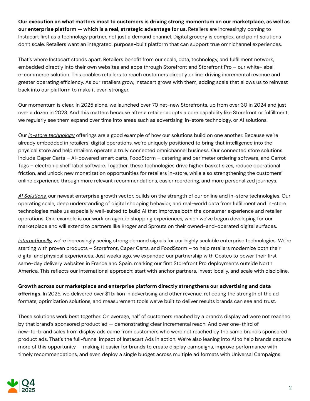 Our execution on what matters most to customers is driving strong momentum on our marketplace, as well as our enterprise platform — which is a real, strategic advantage for us. Retailers are increasingly coming to Instacart first as a technology partner, not just a demand channel. Digital grocery is complex, and point solutions don’t scale. Retailers want an integrated, purpose-built platform that can support true omnichannel experiences. That’s where Instacart stands apart. Retailers benefit from our scale, data, technology, and fulfillment network, embedded directly into their own websites and apps through Storefront and Storefront Pro – our white-label e-commerce solution. This enables retailers to reach customers directly online, driving incremental revenue and greater operating efficiency. As our retailers grow, Instacart grows with them, adding scale that allows us to reinvest back into our platform to make it even stronger. Our momentum is clear. In 2025 alone, we launched over 70 net-new Storefronts, up from over 30 in 2024 and just over a dozen in 2023. And this matters because after a retailer adopts a core capability like Storefront or fulfillment, we regularly see them expand over time into areas such as advertising, in-store technology, or AI solutions. Our in-store technology offerings are a good example of how our solutions build on one another. Because we’re already embedded in retailers’ digital operations, we’re uniquely positioned to bring that intelligence into the physical store and help retailers operate a truly connected omnichannel business. Our connected store solutions include Caper Carts – AI-powered smart carts, FoodStorm – catering and perimeter ordering software, and Carrot Tags – electronic shelf label software. Together, these technologies drive higher basket sizes, reduce operational friction, and unlock new monetization opportunities for retailers in-store, while also strengthening the customers’ online experience through more relevant recommendations, easier reordering, and more personalized journeys. AI Solutions, our newest enterprise growth vector, builds on the strength of our online and in-store technologies. Our operating scale, deep understanding of digital shopping behavior, and real-world data from fulfillment and in-store technologies make us especially well-suited to build AI that improves both the consumer experience and retailer operations. One example is our work on agentic shopping experiences, which we’ve begun developing for our marketplace and will extend to partners like Kroger and Sprouts on their owned-and-operated digital surfaces. Internationally, we’re increasingly seeing strong demand signals for our highly scalable enterprise technologies. We’re starting with proven products – Storefront, Caper Carts, and FoodStorm – to help retailers modernize both their digital and physical experiences. Just weeks ago, we expanded our partnership with Costco to power their first same-day delivery websites in France and Spain, marking our first Storefront Pro deployments outside North America. This reflects our international approach: start with anchor partners, invest locally, and scale with discipline. Growth across our marketplace and enterprise platform directly strengthens our advertising and data offerings. In 2025, we delivered over $1 billion in advertising and other revenue, reflecting the strength of the ad formats, optimization solutions, and measurement tools we’ve built to deliver results brands can see and trust. These solutions work best together. On average, half of customers reached by a brand’s display ad were not reached by that brand’s sponsored product ad — demonstrating clear incremental reach. And over one-third of new-to-brand sales from display ads came from customers who were not reached by the same brand’s sponsored product ads. That’s the full-funnel impact of Instacart Ads in action. We’re also leaning into AI to help brands capture more of this opportunity — making it easier for brands to create display campaigns, improve performance with timely recommendations, and even deploy a single budget across multiple ad formats with Universal Campaigns. ​ ​ ​ ​ 2
