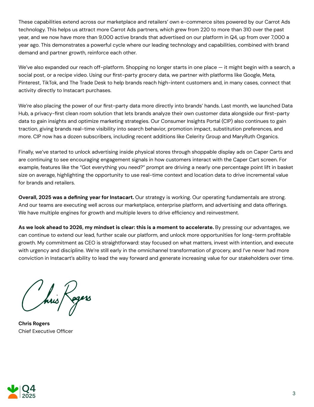 These capabilities extend across our marketplace and retailers’ own e-commerce sites powered by our Carrot Ads technology. This helps us attract more Carrot Ads partners, which grew from 220 to more than 310 over the past year, and we now have more than 9,000 active brands that advertised on our platform in Q4, up from over 7,000 a year ago. This demonstrates a powerful cycle where our leading technology and capabilities, combined with brand demand and partner growth, reinforce each other. We’ve also expanded our reach off-platform. Shopping no longer starts in one place — it might begin with a search, a social post, or a recipe video. Using our first-party grocery data, we partner with platforms like Google, Meta, Pinterest, TikTok, and The Trade Desk to help brands reach high-intent customers and, in many cases, connect that activity directly to Instacart purchases. We’re also placing the power of our first-party data more directly into brands’ hands. Last month, we launched Data Hub, a privacy-first clean room solution that lets brands analyze their own customer data alongside our first-party data to gain insights and optimize marketing strategies. Our Consumer Insights Portal (CIP) also continues to gain traction, giving brands real-time visibility into search behavior, promotion impact, substitution preferences, and more. CIP now has a dozen subscribers, including recent additions like Celerity Group and MaryRuth Organics. Finally, we’ve started to unlock advertising inside physical stores through shoppable display ads on Caper Carts and are continuing to see encouraging engagement signals in how customers interact with the Caper Cart screen. For example, features like the “Got everything you need?” prompt are driving a nearly one percentage point lift in basket size on average, highlighting the opportunity to use real-time context and location data to drive incremental value for brands and retailers. Overall, 2025 was a defining year for Instacart. Our strategy is working. Our operating fundamentals are strong. And our teams are executing well across our marketplace, enterprise platform, and advertising and data offerings. We have multiple engines for growth and multiple levers to drive efficiency and reinvestment. As we look ahead to 2026, my mindset is clear: this is a moment to accelerate. By pressing our advantages, we can continue to extend our lead, further scale our platform, and unlock more opportunities for long-term profitable growth. My commitment as CEO is straightforward: stay focused on what matters, invest with intention, and execute with urgency and discipline. We’re still early in the omnichannel transformation of grocery, and I’ve never had more conviction in Instacart’s ability to lead the way forward and generate increasing value for our stakeholders over time. Chris Rogers Chief Executive Officer ​ ​ ​ ​ 3
