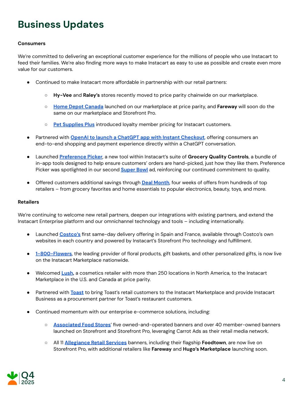 Business Updates Consumers We’re committed to delivering an exceptional customer experience for the millions of people who use Instacart to feed their families. We’re also finding more ways to make Instacart as easy to use as possible and create even more value for our customers. ●​ Continued to make Instacart more affordable in partnership with our retail partners: ○​ Hy-Vee and Raley’s stores recently moved to price parity chainwide on our marketplace. ○​ Home Depot Canada launched on our marketplace at price parity, and Fareway will soon do the same on our marketplace and Storefront Pro. ○​ Pet Supplies Plus introduced loyalty member pricing for Instacart customers. ●​ Partnered with OpenAI to launch a ChatGPT app with Instant Checkout, offering consumers an end-to-end shopping and payment experience directly within a ChatGPT conversation. ●​ Launched Preference Picker, a new tool within Instacart’s suite of Grocery Quality Controls, a bundle of in-app tools designed to help ensure customers’ orders are hand-picked, just how they like them. Preference Picker was spotlighted in our second Super Bowl ad, reinforcing our continued commitment to quality. ●​ Offered customers additional savings through Deal Month, four weeks of offers from hundreds of top retailers – from grocery favorites and home essentials to popular electronics, beauty, toys, and more. Retailers We’re continuing to welcome new retail partners, deepen our integrations with existing partners, and extend the Instacart Enterprise platform and our omnichannel technology and tools – including internationally. ​ ●​ Launched Costco’s first same-day delivery offering in Spain and France, available through Costco’s own websites in each country and powered by Instacart’s Storefront Pro technology and fulfillment. ●​ 1-800-Flowers, the leading provider of floral products, gift baskets, and other personalized gifts, is now live on the Instacart Marketplace nationwide. ●​ Welcomed Lush, a cosmetics retailer with more than 250 locations in North America, to the Instacart Marketplace in the U.S. and Canada at price parity. ●​ Partnered with Toast to bring Toast’s retail customers to the Instacart Marketplace and provide Instacart Business as a procurement partner for Toast’s restaurant customers. ●​ Continued momentum with our enterprise e-commerce solutions, including: ○​ Associated Food Stores’ five owned-and-operated banners and over 40 member-owned banners launched on Storefront and Storefront Pro, leveraging Carrot Ads as their retail media network. ○​ All 11 Allegiance Retail Services banners, including their flagship Foodtown, are now live on Storefront Pro, with additional retailers like Fareway and Hugo’s Marketplace launching soon. ​ ​ ​ ​ 4