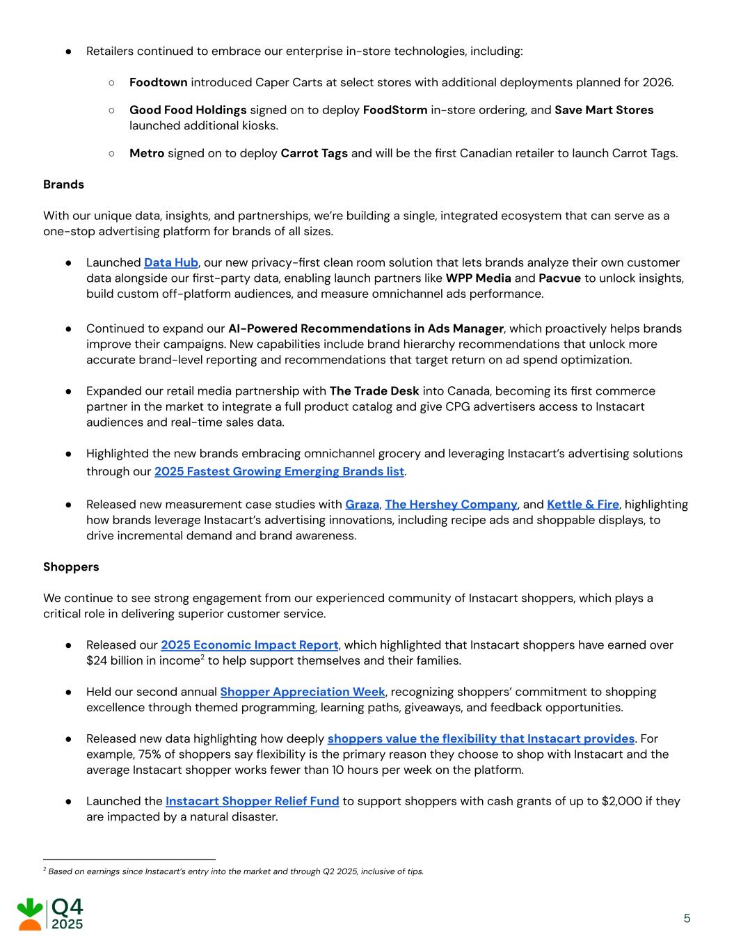 ●​ Retailers continued to embrace our enterprise in-store technologies, including: ○​ Foodtown introduced Caper Carts at select stores with additional deployments planned for 2026. ○​ Good Food Holdings signed on to deploy FoodStorm in-store ordering, and Save Mart Stores launched additional kiosks. ○​ Metro signed on to deploy Carrot Tags and will be the first Canadian retailer to launch Carrot Tags. Brands With our unique data, insights, and partnerships, we’re building a single, integrated ecosystem that can serve as a one-stop advertising platform for brands of all sizes. ●​ Launched Data Hub, our new privacy-first clean room solution that lets brands analyze their own customer data alongside our first-party data, enabling launch partners like WPP Media and Pacvue to unlock insights, build custom off-platform audiences, and measure omnichannel ads performance. ●​ Continued to expand our AI-Powered Recommendations in Ads Manager, which proactively helps brands improve their campaigns. New capabilities include brand hierarchy recommendations that unlock more accurate brand-level reporting and recommendations that target return on ad spend optimization. ●​ Expanded our retail media partnership with The Trade Desk into Canada, becoming its first commerce partner in the market to integrate a full product catalog and give CPG advertisers access to Instacart audiences and real-time sales data. ●​ Highlighted the new brands embracing omnichannel grocery and leveraging Instacart’s advertising solutions through our 2025 Fastest Growing Emerging Brands list. ●​ Released new measurement case studies with Graza, The Hershey Company, and Kettle & Fire, highlighting how brands leverage Instacart’s advertising innovations, including recipe ads and shoppable displays, to drive incremental demand and brand awareness. Shoppers We continue to see strong engagement from our experienced community of Instacart shoppers, which plays a critical role in delivering superior customer service. ●​ Released our 2025 Economic Impact Report, which highlighted that Instacart shoppers have earned over $24 billion in income2 to help support themselves and their families. ●​ Held our second annual Shopper Appreciation Week, recognizing shoppers’ commitment to shopping excellence through themed programming, learning paths, giveaways, and feedback opportunities. ●​ Released new data highlighting how deeply shoppers value the flexibility that Instacart provides. For example, 75% of shoppers say flexibility is the primary reason they choose to shop with Instacart and the average Instacart shopper works fewer than 10 hours per week on the platform. ●​ Launched the Instacart Shopper Relief Fund to support shoppers with cash grants of up to $2,000 if they are impacted by a natural disaster. 2 Based on earnings since Instacart’s entry into the market and through Q2 2025, inclusive of tips. ​ ​ ​ ​ 5