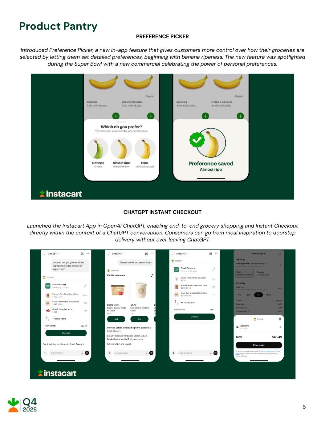 Product Pantry PREFERENCE PICKER Introduced Preference Picker, a new in-app feature that gives customers more control over how their groceries are selected by letting them set detailed preferences, beginning with banana ripeness. The new feature was spotlighted during the Super Bowl with a new commercial celebrating the power of personal preferences. CHATGPT INSTANT CHECKOUT Launched the Instacart App in OpenAI ChatGPT, enabling end-to-end grocery shopping and Instant Checkout directly within the context of a ChatGPT conversation. Consumers can go from meal inspiration to doorstep delivery without ever leaving ChatGPT. ​ ​ ​ ​ 6