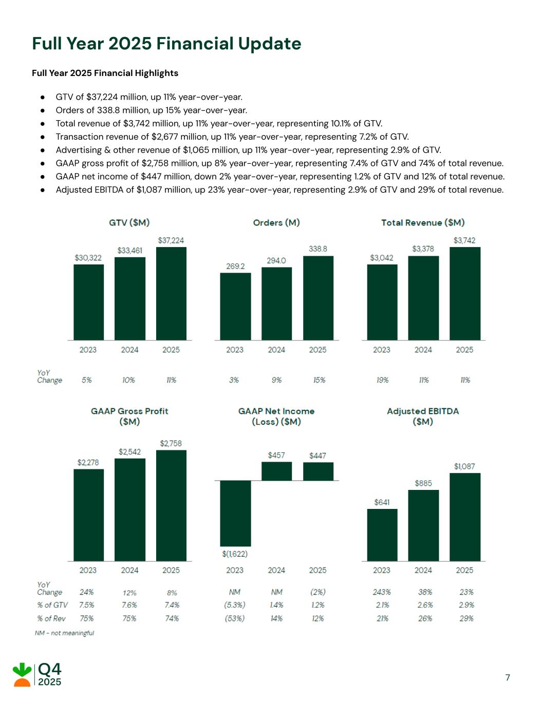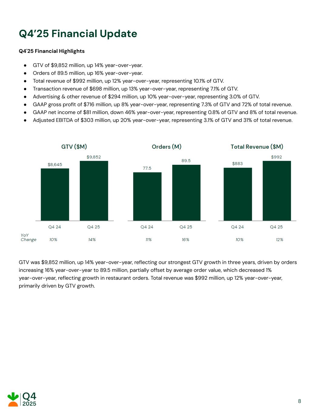 Q4’25 Financial Update Q4'25 Financial Highlights ●​ GTV of $9,852 million, up 14% year-over-year. ●​ Orders of 89.5 million, up 16% year-over-year. ●​ Total revenue of $992 million, up 12% year-over-year, representing 10.1% of GTV. ●​ Transaction revenue of $698 million, up 13% year-over-year, representing 7.1% of GTV. ●​ Advertising & other revenue of $294 million, up 10% year-over-year, representing 3.0% of GTV. ●​ GAAP gross profit of $716 million, up 8% year-over-year, representing 7.3% of GTV and 72% of total revenue. ●​ GAAP net income of $81 million, down 46% year-over-year, representing 0.8% of GTV and 8% of total revenue. ●​ Adjusted EBITDA of $303 million, up 20% year-over-year, representing 3.1% of GTV and 31% of total revenue. GTV was $9,852 million, up 14% year-over-year, reflecting our strongest GTV growth in three years, driven by orders increasing 16% year-over-year to 89.5 million, partially offset by average order value, which decreased 1% year-over-year, reflecting growth in restaurant orders. Total revenue was $992 million, up 12% year-over-year, primarily driven by GTV growth. ​ ​ ​ ​ 8