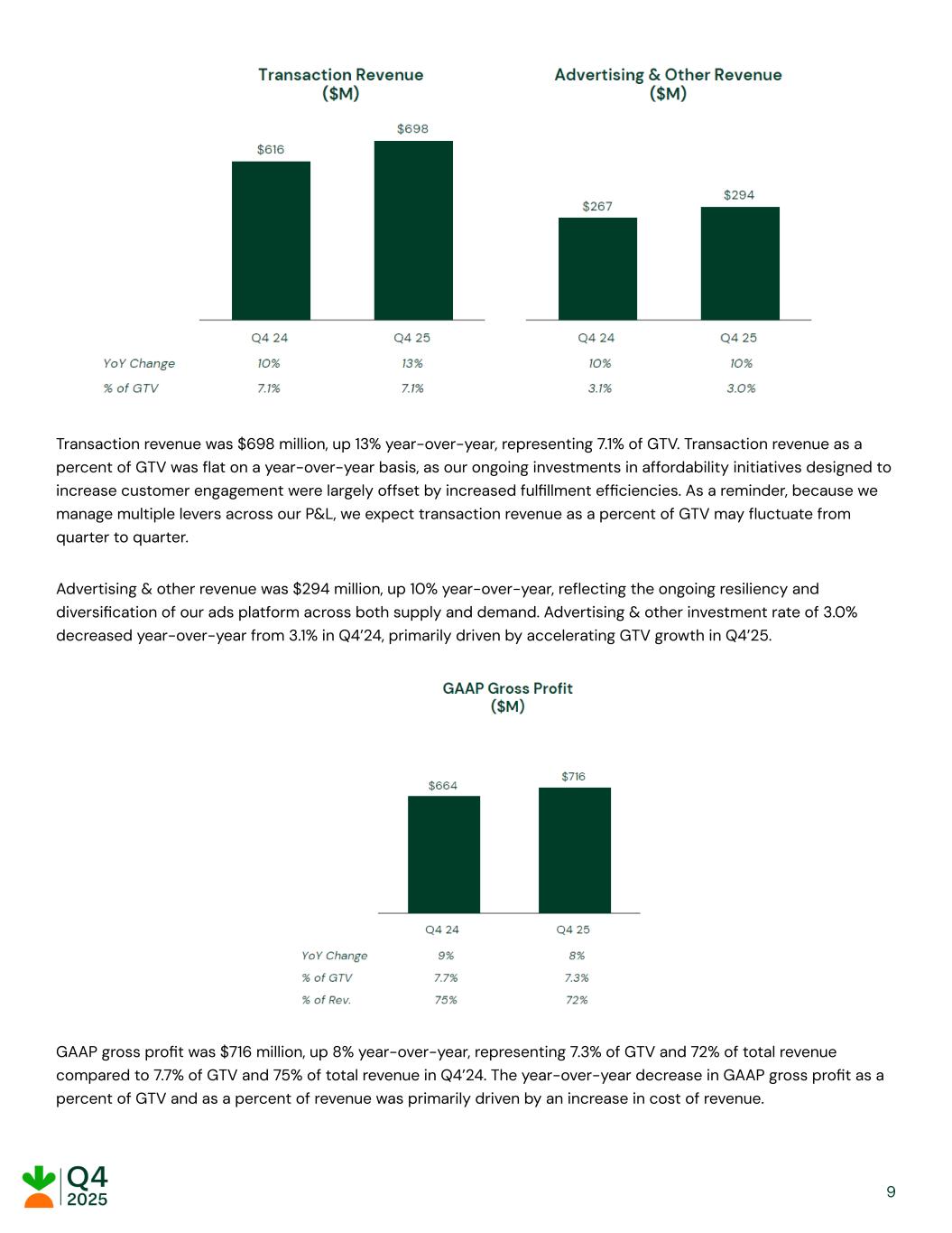 Transaction revenue was $698 million, up 13% year-over-year, representing 7.1% of GTV. Transaction revenue as a percent of GTV was flat on a year-over-year basis, as our ongoing investments in affordability initiatives designed to increase customer engagement were largely offset by increased fulfillment efficiencies. As a reminder, because we manage multiple levers across our P&L, we expect transaction revenue as a percent of GTV may fluctuate from quarter to quarter. ​ Advertising & other revenue was $294 million, up 10% year-over-year, reflecting the ongoing resiliency and diversification of our ads platform across both supply and demand. Advertising & other investment rate of 3.0% decreased year-over-year from 3.1% in Q4’24, primarily driven by accelerating GTV growth in Q4’25. ​ GAAP gross profit was $716 million, up 8% year-over-year, representing 7.3% of GTV and 72% of total revenue compared to 7.7% of GTV and 75% of total revenue in Q4’24. The year-over-year decrease in GAAP gross profit as a percent of GTV and as a percent of revenue was primarily driven by an increase in cost of revenue. ​ ​ ​ ​ 9