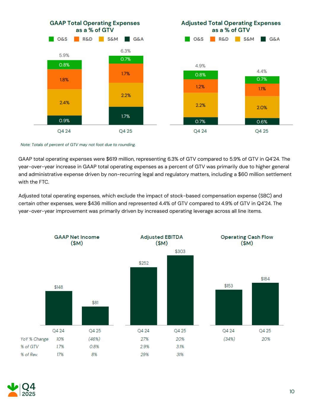 GAAP total operating expenses were $619 million, representing 6.3% of GTV compared to 5.9% of GTV in Q4'24. The year-over-year increase in GAAP total operating expenses as a percent of GTV was primarily due to higher general and administrative expense driven by non-recurring legal and regulatory matters, including a $60 million settlement with the FTC. Adjusted total operating expenses, which exclude the impact of stock-based compensation expense (SBC) and certain other expenses, were $436 million and represented 4.4% of GTV compared to 4.9% of GTV in Q4'24. The year-over-year improvement was primarily driven by increased operating leverage across all line items. ​ ​ ​ ​ 10