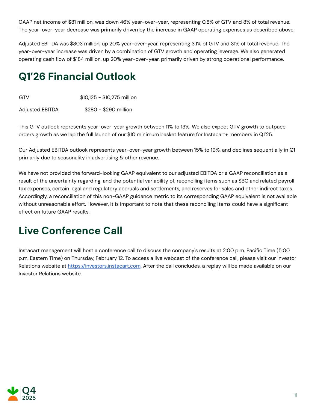 GAAP net income of $81 million, was down 46% year-over-year, representing 0.8% of GTV and 8% of total revenue. The year-over-year decrease was primarily driven by the increase in GAAP operating expenses as described above. Adjusted EBITDA was $303 million, up 20% year-over-year, representing 3.1% of GTV and 31% of total revenue. The year-over-year increase was driven by a combination of GTV growth and operating leverage. We also generated operating cash flow of $184 million, up 20% year-over-year, primarily driven by strong operational performance. Q1’26 Financial Outlook GTV $10,125 - $10,275 million Adjusted EBITDA $280 - $290 million ​ This GTV outlook represents year-over-year growth between 11% to 13%. We also expect GTV growth to outpace orders growth as we lap the full launch of our $10 minimum basket feature for Instacart+ members in Q1’25. Our Adjusted EBITDA outlook represents year-over-year growth between 15% to 19%, and declines sequentially in Q1 primarily due to seasonality in advertising & other revenue. We have not provided the forward-looking GAAP equivalent to our adjusted EBITDA or a GAAP reconciliation as a result of the uncertainty regarding, and the potential variability of, reconciling items such as SBC and related payroll tax expenses, certain legal and regulatory accruals and settlements, and reserves for sales and other indirect taxes. Accordingly, a reconciliation of this non-GAAP guidance metric to its corresponding GAAP equivalent is not available without unreasonable effort. However, it is important to note that these reconciling items could have a significant effect on future GAAP results.​ Live Conference Call Instacart management will host a conference call to discuss the company's results at 2:00 p.m. Pacific Time (5:00 p.m. Eastern Time) on Thursday, February 12. To access a live webcast of the conference call, please visit our Investor Relations website at https://investors.instacart.com. After the call concludes, a replay will be made available on our Investor Relations website. ​ ​ ​ ​ 11