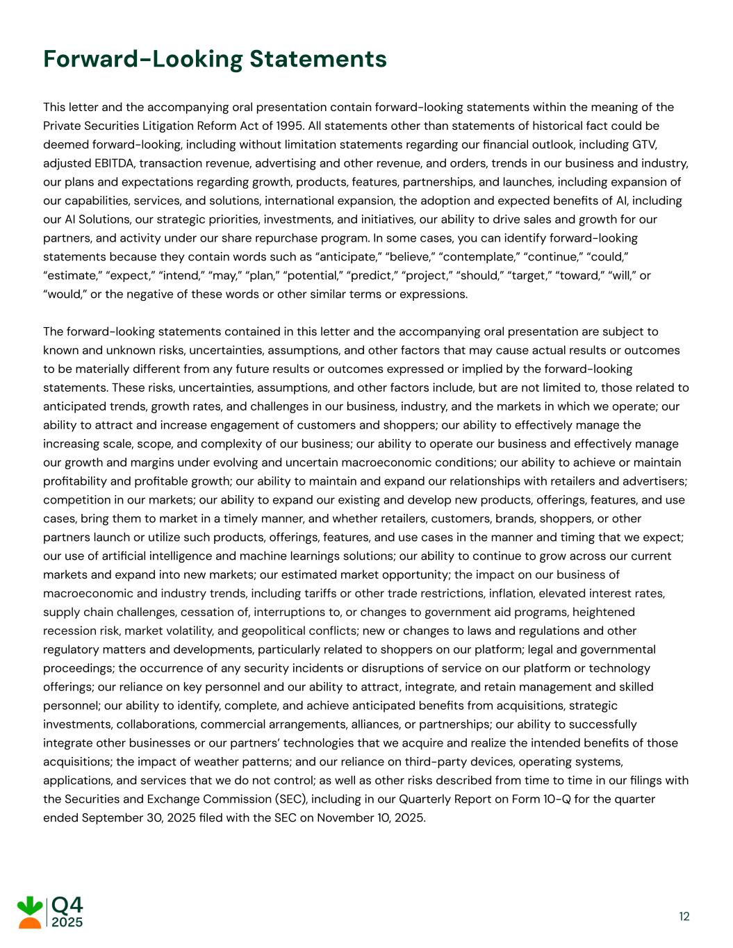 Forward-Looking Statements This letter and the accompanying oral presentation contain forward-looking statements within the meaning of the Private Securities Litigation Reform Act of 1995. All statements other than statements of historical fact could be deemed forward-looking, including without limitation statements regarding our financial outlook, including GTV, adjusted EBITDA, transaction revenue, advertising and other revenue, and orders, trends in our business and industry, our plans and expectations regarding growth, products, features, partnerships, and launches, including expansion of our capabilities, services, and solutions, international expansion, the adoption and expected benefits of AI, including our AI Solutions, our strategic priorities, investments, and initiatives, our ability to drive sales and growth for our partners, and activity under our share repurchase program. In some cases, you can identify forward-looking statements because they contain words such as “anticipate,” “believe,” “contemplate,” “continue,” “could,” “estimate,” “expect,” “intend,” “may,” “plan,” “potential,” “predict,” “project,” “should,” “target,” “toward,” “will,” or “would,” or the negative of these words or other similar terms or expressions. The forward-looking statements contained in this letter and the accompanying oral presentation are subject to known and unknown risks, uncertainties, assumptions, and other factors that may cause actual results or outcomes to be materially different from any future results or outcomes expressed or implied by the forward-looking statements. These risks, uncertainties, assumptions, and other factors include, but are not limited to, those related to anticipated trends, growth rates, and challenges in our business, industry, and the markets in which we operate; our ability to attract and increase engagement of customers and shoppers; our ability to effectively manage the increasing scale, scope, and complexity of our business; our ability to operate our business and effectively manage our growth and margins under evolving and uncertain macroeconomic conditions; our ability to achieve or maintain profitability and profitable growth; our ability to maintain and expand our relationships with retailers and advertisers; competition in our markets; our ability to expand our existing and develop new products, offerings, features, and use cases, bring them to market in a timely manner, and whether retailers, customers, brands, shoppers, or other partners launch or utilize such products, offerings, features, and use cases in the manner and timing that we expect; our use of artificial intelligence and machine learnings solutions; our ability to continue to grow across our current markets and expand into new markets; our estimated market opportunity; the impact on our business of macroeconomic and industry trends, including tariffs or other trade restrictions, inflation, elevated interest rates, supply chain challenges, cessation of, interruptions to, or changes to government aid programs, heightened recession risk, market volatility, and geopolitical conflicts; new or changes to laws and regulations and other regulatory matters and developments, particularly related to shoppers on our platform; legal and governmental proceedings; the occurrence of any security incidents or disruptions of service on our platform or technology offerings; our reliance on key personnel and our ability to attract, integrate, and retain management and skilled personnel; our ability to identify, complete, and achieve anticipated benefits from acquisitions, strategic investments, collaborations, commercial arrangements, alliances, or partnerships; our ability to successfully integrate other businesses or our partners’ technologies that we acquire and realize the intended benefits of those acquisitions; the impact of weather patterns; and our reliance on third-party devices, operating systems, applications, and services that we do not control; as well as other risks described from time to time in our filings with the Securities and Exchange Commission (SEC), including in our Quarterly Report on Form 10-Q for the quarter ended September 30, 2025 filed with the SEC on November 10, 2025. ​ ​ ​ ​ 12