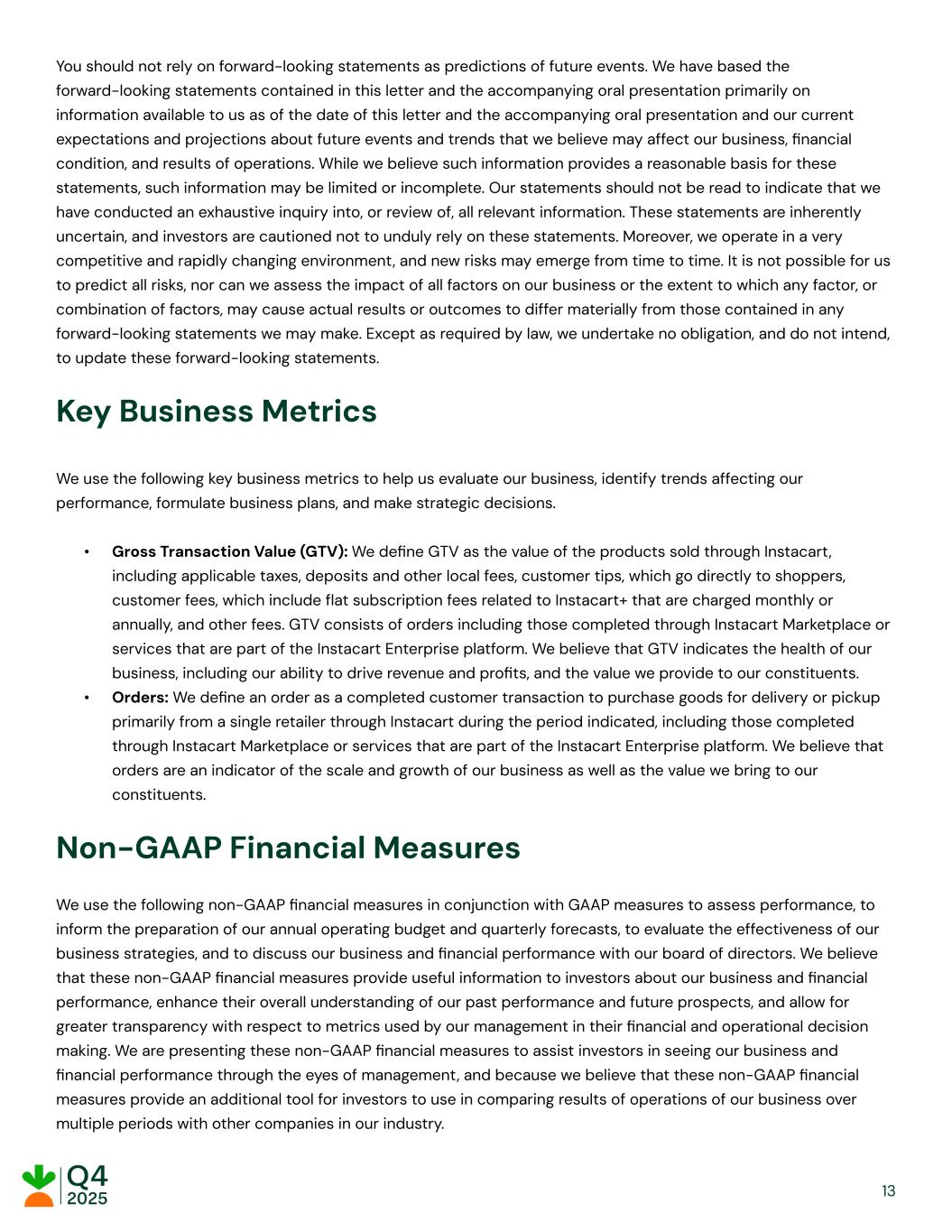 You should not rely on forward-looking statements as predictions of future events. We have based the forward-looking statements contained in this letter and the accompanying oral presentation primarily on information available to us as of the date of this letter and the accompanying oral presentation and our current expectations and projections about future events and trends that we believe may affect our business, financial condition, and results of operations. While we believe such information provides a reasonable basis for these statements, such information may be limited or incomplete. Our statements should not be read to indicate that we have conducted an exhaustive inquiry into, or review of, all relevant information. These statements are inherently uncertain, and investors are cautioned not to unduly rely on these statements. Moreover, we operate in a very competitive and rapidly changing environment, and new risks may emerge from time to time. It is not possible for us to predict all risks, nor can we assess the impact of all factors on our business or the extent to which any factor, or combination of factors, may cause actual results or outcomes to differ materially from those contained in any forward-looking statements we may make. Except as required by law, we undertake no obligation, and do not intend, to update these forward-looking statements. Key Business Metrics We use the following key business metrics to help us evaluate our business, identify trends affecting our performance, formulate business plans, and make strategic decisions. •​ Gross Transaction Value (GTV): We define GTV as the value of the products sold through Instacart, including applicable taxes, deposits and other local fees, customer tips, which go directly to shoppers, customer fees, which include flat subscription fees related to Instacart+ that are charged monthly or annually, and other fees. GTV consists of orders including those completed through Instacart Marketplace or services that are part of the Instacart Enterprise platform. We believe that GTV indicates the health of our business, including our ability to drive revenue and profits, and the value we provide to our constituents. •​ Orders: We define an order as a completed customer transaction to purchase goods for delivery or pickup primarily from a single retailer through Instacart during the period indicated, including those completed through Instacart Marketplace or services that are part of the Instacart Enterprise platform. We believe that orders are an indicator of the scale and growth of our business as well as the value we bring to our constituents. Non-GAAP Financial Measures We use the following non-GAAP financial measures in conjunction with GAAP measures to assess performance, to inform the preparation of our annual operating budget and quarterly forecasts, to evaluate the effectiveness of our business strategies, and to discuss our business and financial performance with our board of directors. We believe that these non-GAAP financial measures provide useful information to investors about our business and financial performance, enhance their overall understanding of our past performance and future prospects, and allow for greater transparency with respect to metrics used by our management in their financial and operational decision making. We are presenting these non-GAAP financial measures to assist investors in seeing our business and financial performance through the eyes of management, and because we believe that these non-GAAP financial measures provide an additional tool for investors to use in comparing results of operations of our business over multiple periods with other companies in our industry. ​ ​ ​ ​ 13