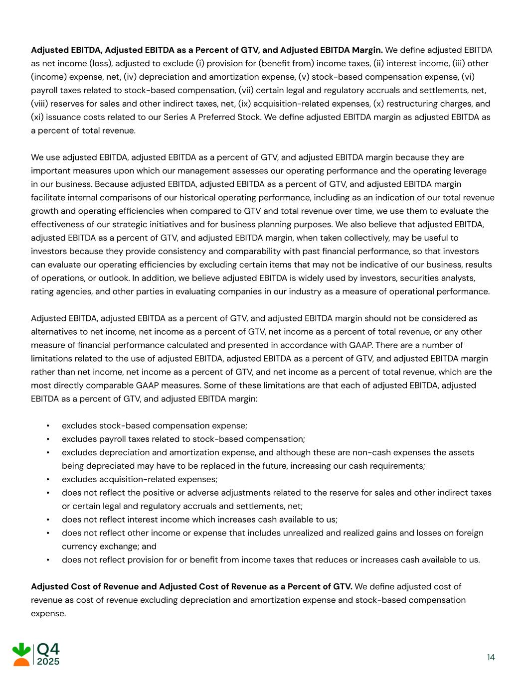 Adjusted EBITDA, Adjusted EBITDA as a Percent of GTV, and Adjusted EBITDA Margin. We define adjusted EBITDA as net income (loss), adjusted to exclude (i) provision for (benefit from) income taxes, (ii) interest income, (iii) other (income) expense, net, (iv) depreciation and amortization expense, (v) stock-based compensation expense, (vi) payroll taxes related to stock-based compensation, (vii) certain legal and regulatory accruals and settlements, net, (viii) reserves for sales and other indirect taxes, net, (ix) acquisition-related expenses, (x) restructuring charges, and (xi) issuance costs related to our Series A Preferred Stock. We define adjusted EBITDA margin as adjusted EBITDA as a percent of total revenue. We use adjusted EBITDA, adjusted EBITDA as a percent of GTV, and adjusted EBITDA margin because they are important measures upon which our management assesses our operating performance and the operating leverage in our business. Because adjusted EBITDA, adjusted EBITDA as a percent of GTV, and adjusted EBITDA margin facilitate internal comparisons of our historical operating performance, including as an indication of our total revenue growth and operating efficiencies when compared to GTV and total revenue over time, we use them to evaluate the effectiveness of our strategic initiatives and for business planning purposes. We also believe that adjusted EBITDA, adjusted EBITDA as a percent of GTV, and adjusted EBITDA margin, when taken collectively, may be useful to investors because they provide consistency and comparability with past financial performance, so that investors can evaluate our operating efficiencies by excluding certain items that may not be indicative of our business, results of operations, or outlook. In addition, we believe adjusted EBITDA is widely used by investors, securities analysts, rating agencies, and other parties in evaluating companies in our industry as a measure of operational performance. Adjusted EBITDA, adjusted EBITDA as a percent of GTV, and adjusted EBITDA margin should not be considered as alternatives to net income, net income as a percent of GTV, net income as a percent of total revenue, or any other measure of financial performance calculated and presented in accordance with GAAP. There are a number of limitations related to the use of adjusted EBITDA, adjusted EBITDA as a percent of GTV, and adjusted EBITDA margin rather than net income, net income as a percent of GTV, and net income as a percent of total revenue, which are the most directly comparable GAAP measures. Some of these limitations are that each of adjusted EBITDA, adjusted EBITDA as a percent of GTV, and adjusted EBITDA margin: •​ excludes stock-based compensation expense; •​ excludes payroll taxes related to stock-based compensation; •​ excludes depreciation and amortization expense, and although these are non-cash expenses the assets being depreciated may have to be replaced in the future, increasing our cash requirements; •​ excludes acquisition-related expenses; •​ does not reflect the positive or adverse adjustments related to the reserve for sales and other indirect taxes or certain legal and regulatory accruals and settlements, net; •​ does not reflect interest income which increases cash available to us; •​ does not reflect other income or expense that includes unrealized and realized gains and losses on foreign currency exchange; and •​ does not reflect provision for or benefit from income taxes that reduces or increases cash available to us. Adjusted Cost of Revenue and Adjusted Cost of Revenue as a Percent of GTV. We define adjusted cost of revenue as cost of revenue excluding depreciation and amortization expense and stock-based compensation expense. ​ ​ ​ ​ 14