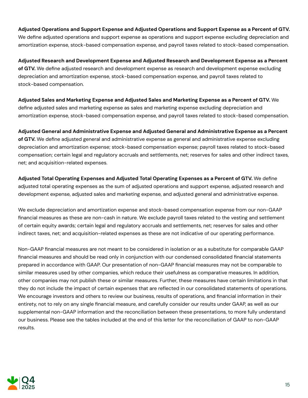 Adjusted Operations and Support Expense and Adjusted Operations and Support Expense as a Percent of GTV. We define adjusted operations and support expense as operations and support expense excluding depreciation and amortization expense, stock-based compensation expense, and payroll taxes related to stock-based compensation. Adjusted Research and Development Expense and Adjusted Research and Development Expense as a Percent of GTV. We define adjusted research and development expense as research and development expense excluding depreciation and amortization expense, stock-based compensation expense, and payroll taxes related to stock-based compensation. Adjusted Sales and Marketing Expense and Adjusted Sales and Marketing Expense as a Percent of GTV. We define adjusted sales and marketing expense as sales and marketing expense excluding depreciation and amortization expense, stock-based compensation expense, and payroll taxes related to stock-based compensation. Adjusted General and Administrative Expense and Adjusted General and Administrative Expense as a Percent of GTV. We define adjusted general and administrative expense as general and administrative expense excluding depreciation and amortization expense; stock-based compensation expense; payroll taxes related to stock-based compensation; certain legal and regulatory accruals and settlements, net; reserves for sales and other indirect taxes, net; and acquisition-related expenses. Adjusted Total Operating Expenses and Adjusted Total Operating Expenses as a Percent of GTV. We define adjusted total operating expenses as the sum of adjusted operations and support expense, adjusted research and development expense, adjusted sales and marketing expense, and adjusted general and administrative expense. We exclude depreciation and amortization expense and stock-based compensation expense from our non-GAAP financial measures as these are non-cash in nature. We exclude payroll taxes related to the vesting and settlement of certain equity awards; certain legal and regulatory accruals and settlements, net; reserves for sales and other indirect taxes, net; and acquisition-related expenses as these are not indicative of our operating performance. Non-GAAP financial measures are not meant to be considered in isolation or as a substitute for comparable GAAP financial measures and should be read only in conjunction with our condensed consolidated financial statements prepared in accordance with GAAP. Our presentation of non-GAAP financial measures may not be comparable to similar measures used by other companies, which reduce their usefulness as comparative measures. In addition, other companies may not publish these or similar measures. Further, these measures have certain limitations in that they do not include the impact of certain expenses that are reflected in our consolidated statements of operations. We encourage investors and others to review our business, results of operations, and financial information in their entirety, not to rely on any single financial measure, and carefully consider our results under GAAP, as well as our supplemental non-GAAP information and the reconciliation between these presentations, to more fully understand our business. Please see the tables included at the end of this letter for the reconciliation of GAAP to non-GAAP results. ​ ​ ​ ​ 15