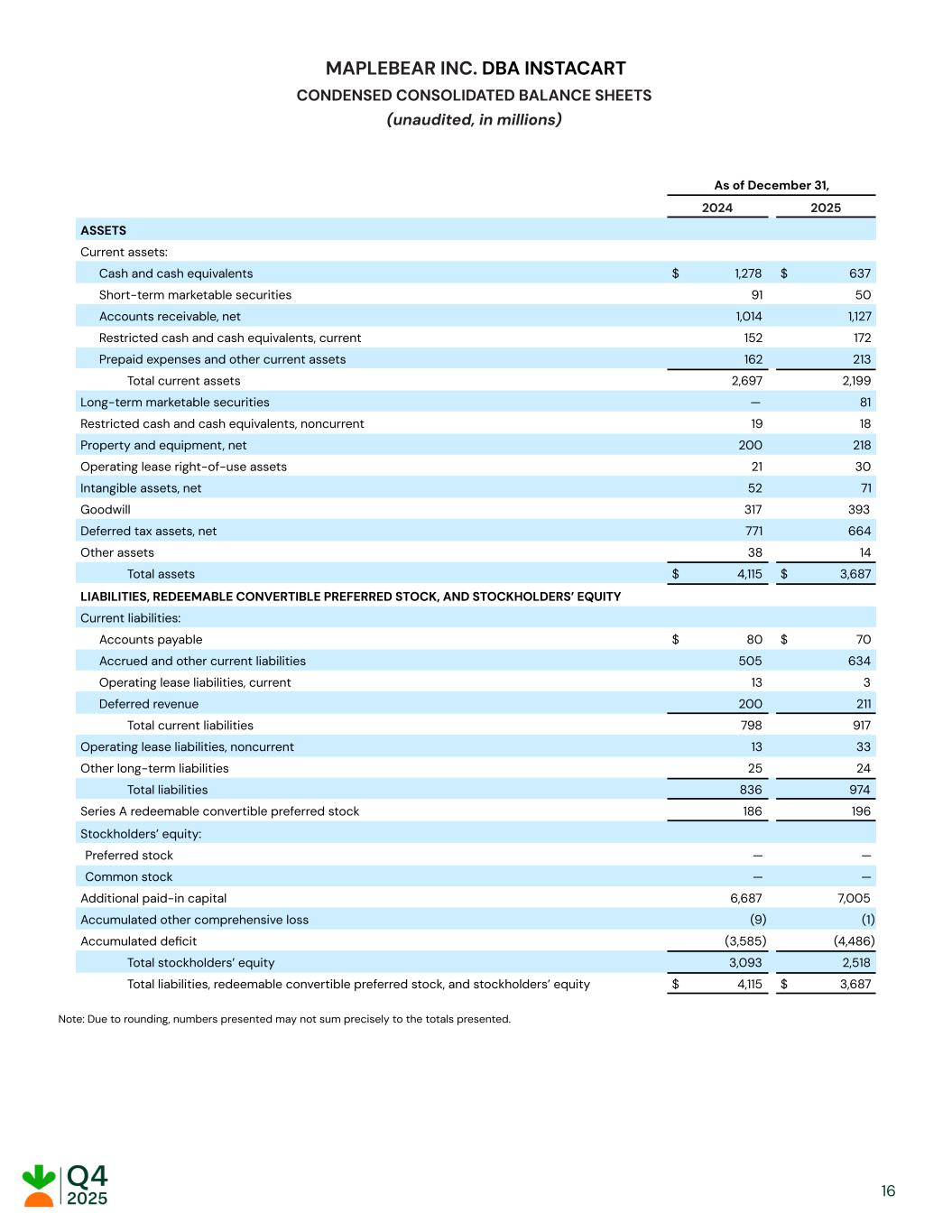 MAPLEBEAR INC. DBA INSTACART CONDENSED CONSOLIDATED BALANCE SHEETS (unaudited, in millions) As of December 31, 2024 2025 ASSETS Current assets: Cash and cash equivalents $​ 1,278​ $​ 637​ Short-term marketable securities ​ 91​ ​ 50​ Accounts receivable, net ​ 1,014​ ​ 1,127​ Restricted cash and cash equivalents, current ​ 152​ ​ 172​ Prepaid expenses and other current assets ​ 162​ ​ 213​ Total current assets ​ 2,697​ ​ 2,199​ Long-term marketable securities ​ —​ ​ 81​ Restricted cash and cash equivalents, noncurrent ​ 19​ ​ 18​ Property and equipment, net ​ 200​ ​ 218​ Operating lease right-of-use assets ​ 21​ ​ 30​ Intangible assets, net ​ 52​ ​ 71​ Goodwill ​ 317​ ​ 393​ Deferred tax assets, net ​ 771​ ​ 664​ Other assets ​ 38​ ​ 14​ Total assets $​ 4,115​ $​ 3,687​ LIABILITIES, REDEEMABLE CONVERTIBLE PREFERRED STOCK, AND STOCKHOLDERS’ EQUITY Current liabilities: Accounts payable $​ 80​ $​ 70​ Accrued and other current liabilities ​ 505​ ​ 634​ Operating lease liabilities, current ​ 13​ ​ 3​ Deferred revenue ​ 200​ ​ 211​ Total current liabilities ​ 798​ ​ 917​ Operating lease liabilities, noncurrent ​ 13​ ​ 33​ Other long-term liabilities ​ 25​ ​ 24​ Total liabilities ​ 836​ ​ 974​ Series A redeemable convertible preferred stock ​ 186​ ​ 196​ Stockholders’ equity: Preferred stock ​ —​ ​ —​ Common stock ​ —​ ​ —​ Additional paid-in capital ​ 6,687​ ​ 7,005​ Accumulated other comprehensive loss ​ (9) ​ (1) Accumulated deficit ​ (3,585) ​ (4,486) Total stockholders’ equity ​ 3,093​ ​ 2,518​ Total liabilities, redeemable convertible preferred stock, and stockholders’ equity $​ 4,115​ $​ 3,687​ Note: Due to rounding, numbers presented may not sum precisely to the totals presented. ​ ​ ​ ​ 16