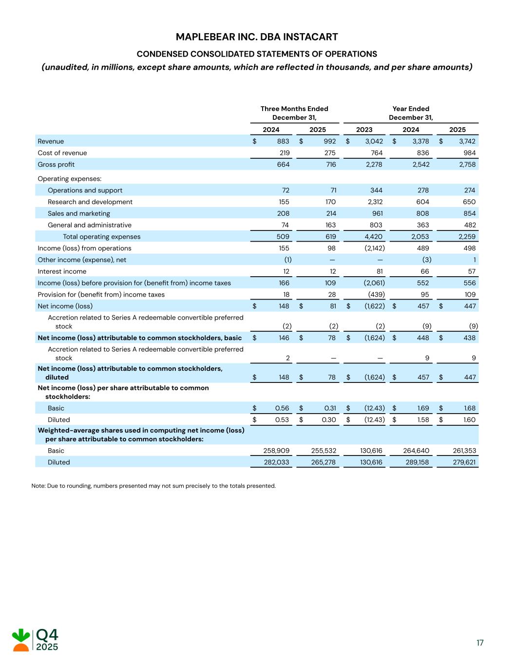 MAPLEBEAR INC. DBA INSTACART CONDENSED CONSOLIDATED STATEMENTS OF OPERATIONS (unaudited, in millions, except share amounts, which are reflected in thousands, and per share amounts) Three Months Ended December 31, Year Ended December 31, 2024 2025 2023 2024 2025 Revenue $​ 883​ $​ 992​ $​ 3,042​ $​ 3,378​ $​ 3,742​ Cost of revenue ​ 219​ ​ 275​ ​ 764​ ​ 836​ ​ 984​ Gross profit ​ 664​ ​ 716​ ​ 2,278​ ​ 2,542​ ​ 2,758​ Operating expenses: Operations and support ​ 72​ ​ 71​ ​ 344​ ​ 278​ ​ 274​ Research and development ​ 155​ ​ 170​ ​ 2,312​ ​ 604​ ​ 650​ Sales and marketing ​ 208​ ​ 214​ ​ 961​ ​ 808​ ​ 854​ General and administrative ​ 74​ ​ 163​ ​ 803​ ​ 363​ ​ 482​ Total operating expenses ​ 509​ ​ 619​ ​ 4,420​ ​ 2,053​ ​ 2,259​ Income (loss) from operations ​ 155​ ​ 98​ ​ (2,142) ​ 489​ ​ 498​ Other income (expense), net ​ (1) ​ —​ ​ —​ ​ (3) ​ 1​ Interest income ​ 12​ ​ 12​ ​ 81​ ​ 66​ ​ 57​ Income (loss) before provision for (benefit from) income taxes ​ 166​ ​ 109​ ​ (2,061) ​ 552​ ​ 556​ Provision for (benefit from) income taxes ​ 18​ ​ 28​ ​ (439) ​ 95​ ​ 109​ Net income (loss) $​ 148​ $​ 81​ $​ (1,622) $​ 457​ $​ 447​ Accretion related to Series A redeemable convertible preferred stock ​ (2) ​ (2) ​ (2) ​ (9) ​ (9) Net income (loss) attributable to common stockholders, basic $​ 146​ $​ 78​ $​ (1,624) $​ 448​ $​ 438​ Accretion related to Series A redeemable convertible preferred stock ​ 2​ ​ —​ ​ —​ ​ 9​ ​ 9​ Net income (loss) attributable to common stockholders, diluted $​ 148​ $​ 78​ $​ (1,624) $​ 457​ $​ 447​ Net income (loss) per share attributable to common stockholders: Basic $​ 0.56​ $​ 0.31​ $​ (12.43) $​ 1.69​ $​ 1.68​ Diluted $​ 0.53​ $​ 0.30​ $​ (12.43) $​ 1.58​ $​ 1.60​ Weighted-average shares used in computing net income (loss) per share attributable to common stockholders: Basic ​ 258,909​ ​ 255,532​ ​ 130,616​ ​ 264,640​ ​ 261,353​ Diluted ​ 282,033​ ​ 265,278​ ​ 130,616​ ​ 289,158​ ​ 279,621​ Note: Due to rounding, numbers presented may not sum precisely to the totals presented. ​ ​ ​ ​ 17