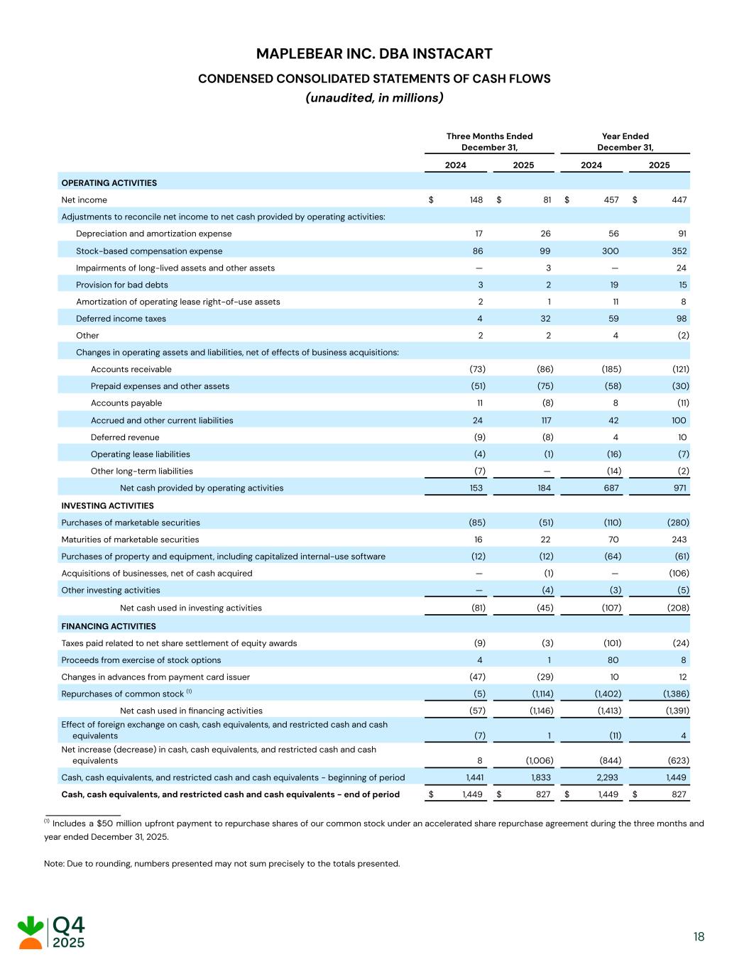 MAPLEBEAR INC. DBA INSTACART CONDENSED CONSOLIDATED STATEMENTS OF CASH FLOWS (unaudited, in millions) Three Months Ended December 31, Year Ended December 31, 2024 2025 2024 2025 OPERATING ACTIVITIES Net income $​ 148​ $​ 81​ $​ 457​ $​ 447​ Adjustments to reconcile net income to net cash provided by operating activities: Depreciation and amortization expense ​ 17​ ​ 26​ ​ 56​ ​ 91​ Stock-based compensation expense ​ 86​ ​ 99​ ​ 300​ ​ 352​ Impairments of long-lived assets and other assets ​ —​ ​ 3​ ​ —​ ​ 24​ Provision for bad debts ​ 3​ ​ 2​ ​ 19​ ​ 15​ Amortization of operating lease right-of-use assets ​ 2​ ​ 1​ ​ 11​ ​ 8​ Deferred income taxes ​ 4​ ​ 32​ ​ 59​ ​ 98​ Other ​ 2​ ​ 2​ ​ 4​ ​ (2) Changes in operating assets and liabilities, net of effects of business acquisitions: Accounts receivable ​ (73) ​ (86) ​ (185) ​ (121) Prepaid expenses and other assets ​ (51) ​ (75) ​ (58) ​ (30) Accounts payable ​ 11​ ​ (8) ​ 8​ ​ (11) Accrued and other current liabilities ​ 24​ ​ 117​ ​ 42​ ​ 100​ Deferred revenue ​ (9) ​ (8) ​ 4​ ​ 10​ Operating lease liabilities ​ (4) ​ (1) ​ (16) ​ (7) Other long-term liabilities ​ (7) ​ —​ ​ (14) ​ (2) Net cash provided by operating activities ​ 153​ ​ 184​ ​ 687​ ​ 971​ INVESTING ACTIVITIES Purchases of marketable securities ​ (85) ​ (51) ​ (110) ​ (280) Maturities of marketable securities ​ 16​ ​ 22​ ​ 70​ ​ 243​ Purchases of property and equipment, including capitalized internal-use software ​ (12) ​ (12) ​ (64) ​ (61) Acquisitions of businesses, net of cash acquired ​ —​ ​ (1) ​ —​ ​ (106) Other investing activities ​ —​ ​ (4) ​ (3) ​ (5) Net cash used in investing activities ​ (81) ​ (45) ​ (107) ​ (208) FINANCING ACTIVITIES Taxes paid related to net share settlement of equity awards ​ (9) ​ (3) ​ (101) ​ (24) Proceeds from exercise of stock options ​ 4​ ​ 1​ ​ 80​ ​ 8​ Changes in advances from payment card issuer ​ (47) ​ (29) ​ 10​ ​ 12​ Repurchases of common stock (1) ​ (5) ​ (1,114) ​ (1,402) ​ (1,386) Net cash used in financing activities ​ (57) ​ (1,146) ​ (1,413) ​ (1,391) Effect of foreign exchange on cash, cash equivalents, and restricted cash and cash equivalents ​ (7) ​ 1​ ​ (11) ​ 4​ Net increase (decrease) in cash, cash equivalents, and restricted cash and cash equivalents ​ 8​ ​ (1,006) ​ (844) ​ (623) Cash, cash equivalents, and restricted cash and cash equivalents - beginning of period ​ 1,441​ ​ 1,833​ ​ 2,293​ ​ 1,449​ Cash, cash equivalents, and restricted cash and cash equivalents - end of period $​ 1,449​ $​ 827​ $​ 1,449​ $​ 827​ ___________ (1) Includes a $50 million upfront payment to repurchase shares of our common stock under an accelerated share repurchase agreement during the three months and year ended December 31, 2025. Note: Due to rounding, numbers presented may not sum precisely to the totals presented. ​ ​ ​ ​ 18