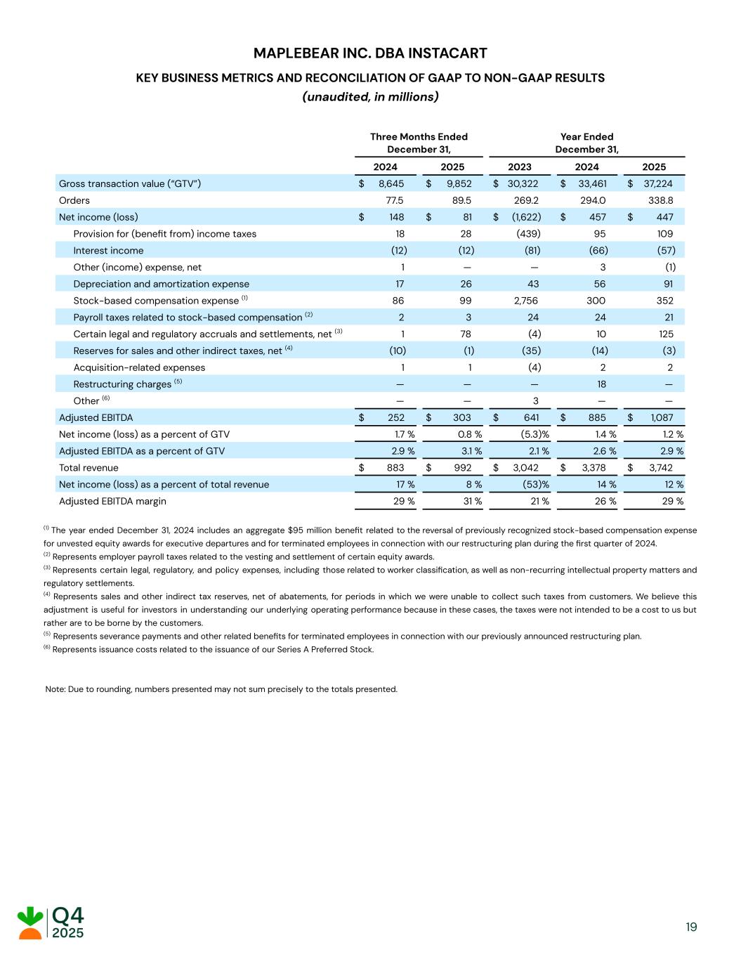 MAPLEBEAR INC. DBA INSTACART KEY BUSINESS METRICS AND RECONCILIATION OF GAAP TO NON-GAAP RESULTS (unaudited, in millions) Three Months Ended December 31, Year Ended December 31, 2024 2025 2023 2024 2025 Gross transaction value (“GTV”) $​ 8,645​ $​ 9,852​ $​ 30,322​ $​ 33,461​ $​ 37,224​ Orders ​ 77.5​ ​ 89.5​ ​ 269.2​ ​ 294.0​ ​ 338.8​ Net income (loss) $​ 148​ $​ 81​ $​ (1,622)​ $​ 457​ $​ 447​ Provision for (benefit from) income taxes ​ 18​ ​ 28​ ​ (439)​ ​ 95​ ​ 109​ Interest income ​ (12)​ ​ (12)​ ​ (81)​ ​ (66)​ ​ (57)​ Other (income) expense, net ​ 1​ ​ —​ ​ —​ ​ 3​ ​ (1)​ Depreciation and amortization expense ​ 17​ ​ 26​ ​ 43​ ​ 56​ ​ 91​ Stock-based compensation expense (1) ​ 86​ ​ 99​ ​ 2,756​ ​ 300​ ​ 352​ Payroll taxes related to stock-based compensation (2) ​ 2​ ​ 3​ ​ 24​ ​ 24​ ​ 21​ Certain legal and regulatory accruals and settlements, net (3) ​ 1​ ​ 78​ ​ (4)​ ​ 10​ ​ 125​ Reserves for sales and other indirect taxes, net (4) ​ (10)​ ​ (1)​ ​ (35)​ ​ (14)​ ​ (3)​ Acquisition-related expenses ​ 1​ ​ 1​ ​ (4)​ ​ 2​ ​ 2​ Restructuring charges (5) ​ —​ ​ —​ ​ —​ ​ 18​ ​ —​ Other (6) ​ —​ ​ —​ ​ 3​ ​ —​ ​ —​ Adjusted EBITDA $​ 252​ $​ 303​ $​ 641​ $​ 885​ $​ 1,087​ Net income (loss) as a percent of GTV ​ 1.7 % ​ 0.8 % ​ (5.3)% ​ 1.4 % ​ 1.2 % Adjusted EBITDA as a percent of GTV ​ 2.9 % ​ 3.1 % ​ 2.1 % ​ 2.6 % ​ 2.9 % Total revenue $​ 883​ $​ 992​ $​ 3,042​ $​ 3,378​ $​ 3,742​ Net income (loss) as a percent of total revenue ​ 17 % ​ 8 % ​ (53)% ​ 14 % ​ 12 % Adjusted EBITDA margin ​ 29 % ​ 31 % ​ 21 % ​ 26 % ​ 29 % (1) The year ended December 31, 2024 includes an aggregate $95 million benefit related to the reversal of previously recognized stock-based compensation expense for unvested equity awards for executive departures and for terminated employees in connection with our restructuring plan during the first quarter of 2024. (2) Represents employer payroll taxes related to the vesting and settlement of certain equity awards. (3) Represents certain legal, regulatory, and policy expenses, including those related to worker classification, as well as non-recurring intellectual property matters and regulatory settlements. (4) Represents sales and other indirect tax reserves, net of abatements, for periods in which we were unable to collect such taxes from customers. We believe this adjustment is useful for investors in understanding our underlying operating performance because in these cases, the taxes were not intended to be a cost to us but rather are to be borne by the customers. (5) Represents severance payments and other related benefits for terminated employees in connection with our previously announced restructuring plan. (6) Represents issuance costs related to the issuance of our Series A Preferred Stock. Note: Due to rounding, numbers presented may not sum precisely to the totals presented. ​ ​ ​ ​ 19
