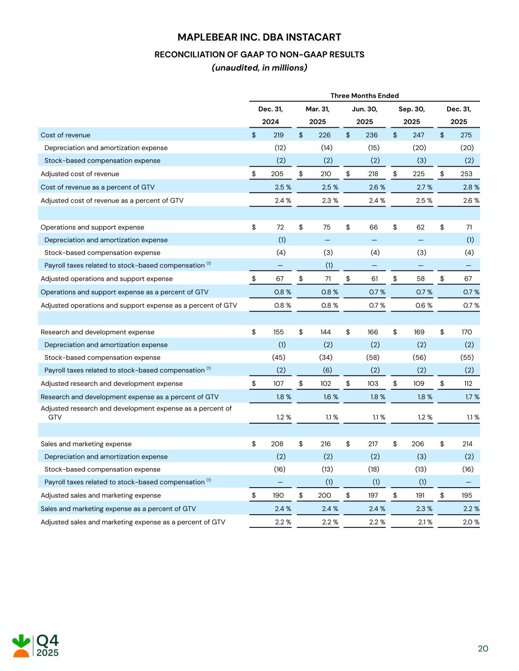 MAPLEBEAR INC. DBA INSTACART RECONCILIATION OF GAAP TO NON-GAAP RESULTS (unaudited, in millions) Three Months Ended Dec. 31, Mar. 31, Jun. 30, Sep. 30, Dec. 31, 2024 2025 2025 2025 2025 Cost of revenue $​ 219​ $​ 226​ $​ 236​ $​ 247​ $​ 275​ Depreciation and amortization expense ​ (12)​ ​ (14)​ ​ (15)​ ​ (20)​ ​ (20)​ Stock-based compensation expense ​ (2)​ ​ (2)​ ​ (2)​ ​ (3)​ ​ (2)​ Adjusted cost of revenue $​ 205​ $​ 210​ $​ 218​ $​ 225​ $​ 253​ Cost of revenue as a percent of GTV ​ 2.5 % ​ 2.5 % ​ 2.6 % ​ 2.7 % ​ 2.8 % Adjusted cost of revenue as a percent of GTV ​ 2.4 % ​ 2.3 % ​ 2.4 % ​ 2.5 % ​ 2.6 % Operations and support expense $​ 72​ $​ 75​ $​ 66​ $​ 62​ $​ 71​ Depreciation and amortization expense ​ (1)​ ​ —​ ​ —​ ​ —​ ​ (1)​ Stock-based compensation expense ​ (4)​ ​ (3)​ ​ (4)​ ​ (3)​ ​ (4)​ Payroll taxes related to stock-based compensation (1) ​ —​ ​ (1)​ ​ —​ ​ —​ ​ —​ Adjusted operations and support expense $​ 67​ $​ 71​ $​ 61​ $​ 58​ $​ 67​ Operations and support expense as a percent of GTV ​ 0.8 % ​ 0.8 % ​ 0.7 % ​ 0.7 % ​ 0.7 % Adjusted operations and support expense as a percent of GTV ​ 0.8 % ​ 0.8 % ​ 0.7 % ​ 0.6 % ​ 0.7 % Research and development expense $​ 155​ $​ 144​ $​ 166​ $​ 169​ $​ 170​ Depreciation and amortization expense ​ (1)​ ​ (2)​ ​ (2)​ ​ (2)​ ​ (2)​ Stock-based compensation expense ​ (45)​ ​ (34)​ ​ (58)​ ​ (56)​ ​ (55)​ Payroll taxes related to stock-based compensation (1) ​ (2)​ ​ (6)​ ​ (2)​ ​ (2)​ ​ (2)​ Adjusted research and development expense $​ 107​ $​ 102​ $​ 103​ $​ 109​ $​ 112​ Research and development expense as a percent of GTV ​ 1.8 % ​ 1.6 % ​ 1.8 % ​ 1.8 % ​ 1.7 % Adjusted research and development expense as a percent of GTV ​ 1.2 % ​ 1.1 % ​ 1.1 % ​ 1.2 % ​ 1.1 % Sales and marketing expense $​ 208​ $​ 216​ $​ 217​ $​ 206​ $​ 214​ Depreciation and amortization expense ​ (2)​ ​ (2)​ ​ (2)​ ​ (3)​ ​ (2)​ Stock-based compensation expense ​ (16)​ ​ (13)​ ​ (18)​ ​ (13)​ ​ (16)​ Payroll taxes related to stock-based compensation (1) ​ —​ ​ (1)​ ​ (1)​ ​ (1)​ ​ —​ Adjusted sales and marketing expense $​ 190​ $​ 200​ $​ 197​ $​ 191​ $​ 195​ Sales and marketing expense as a percent of GTV ​ 2.4 % ​ 2.4 % ​ 2.4 % ​ 2.3 % ​ 2.2 % Adjusted sales and marketing expense as a percent of GTV ​ 2.2 % ​ 2.2 % ​ 2.2 % ​ 2.1 % ​ 2.0 % ​ ​ ​ ​ 20